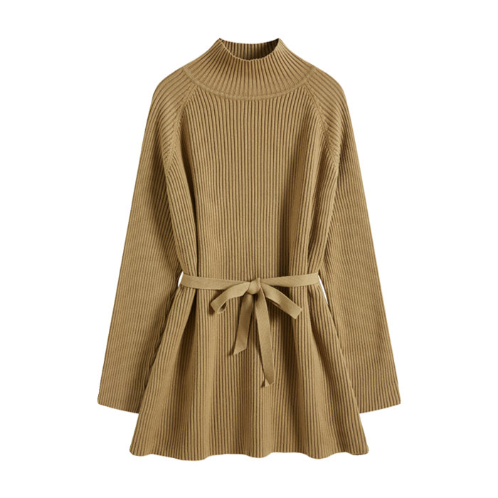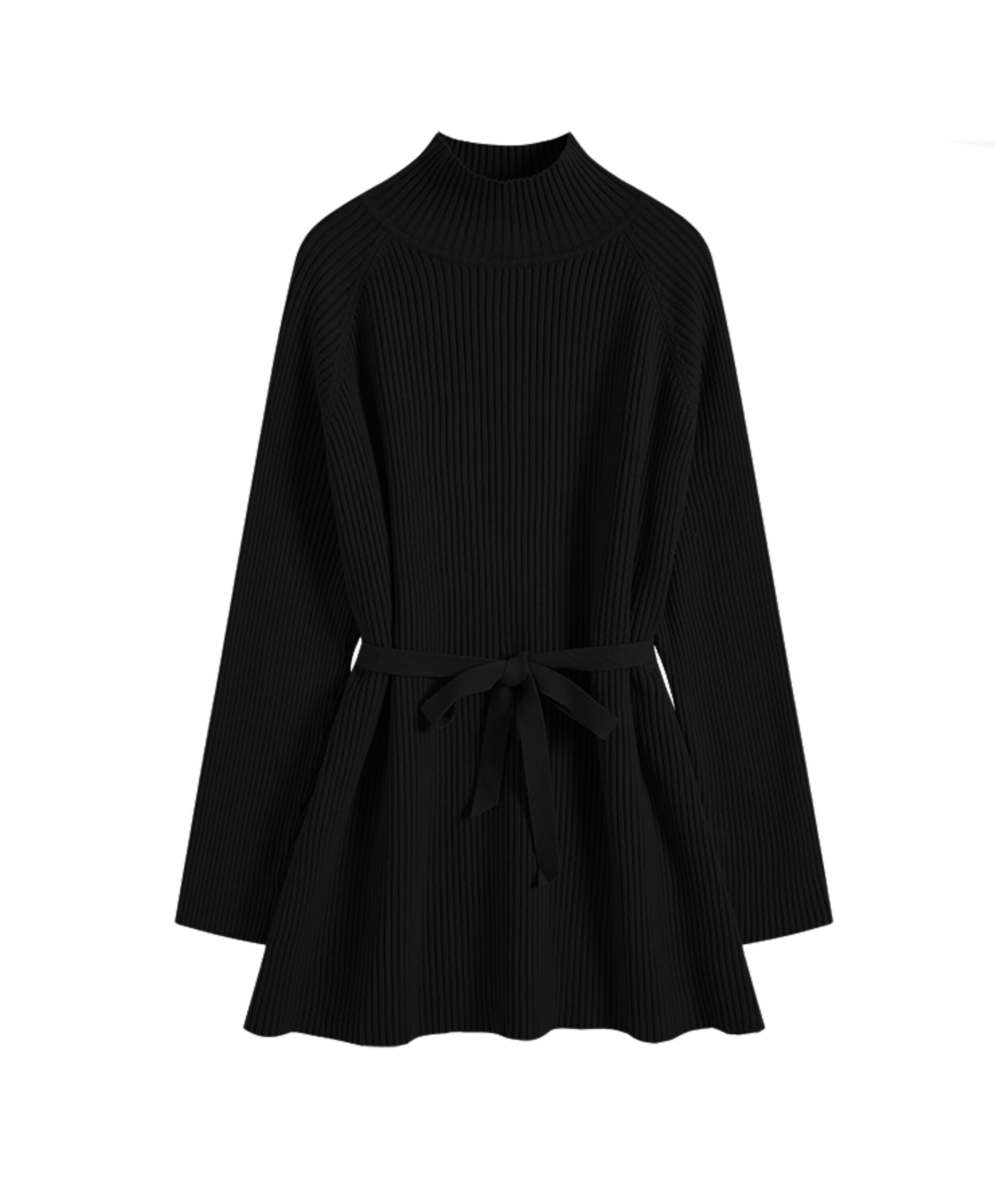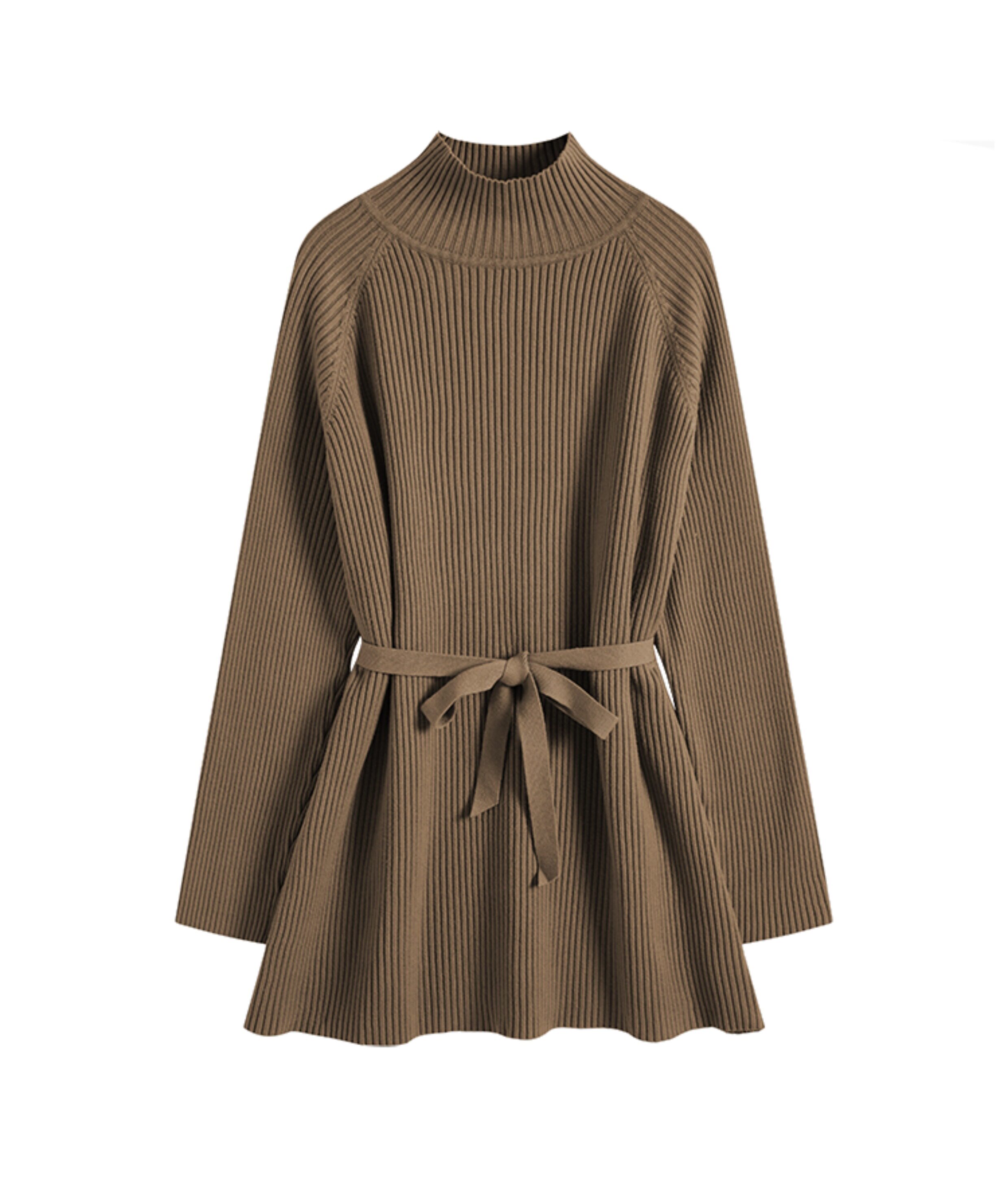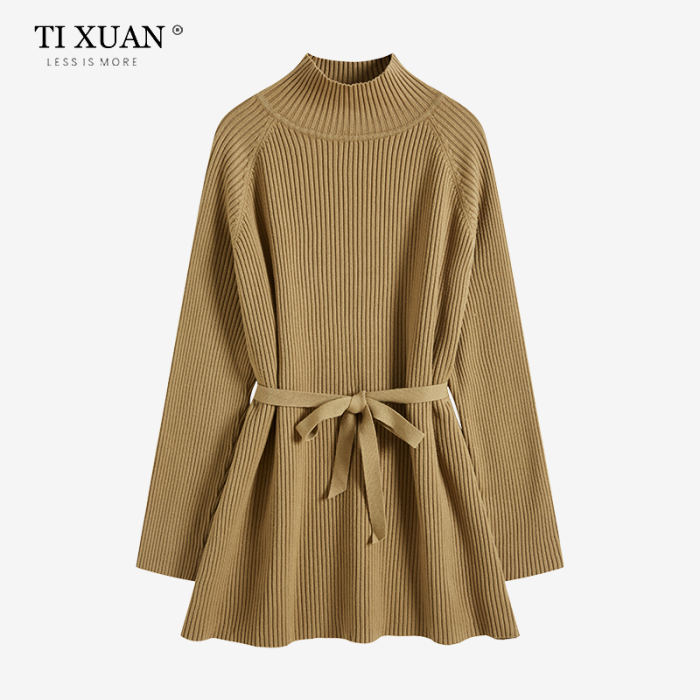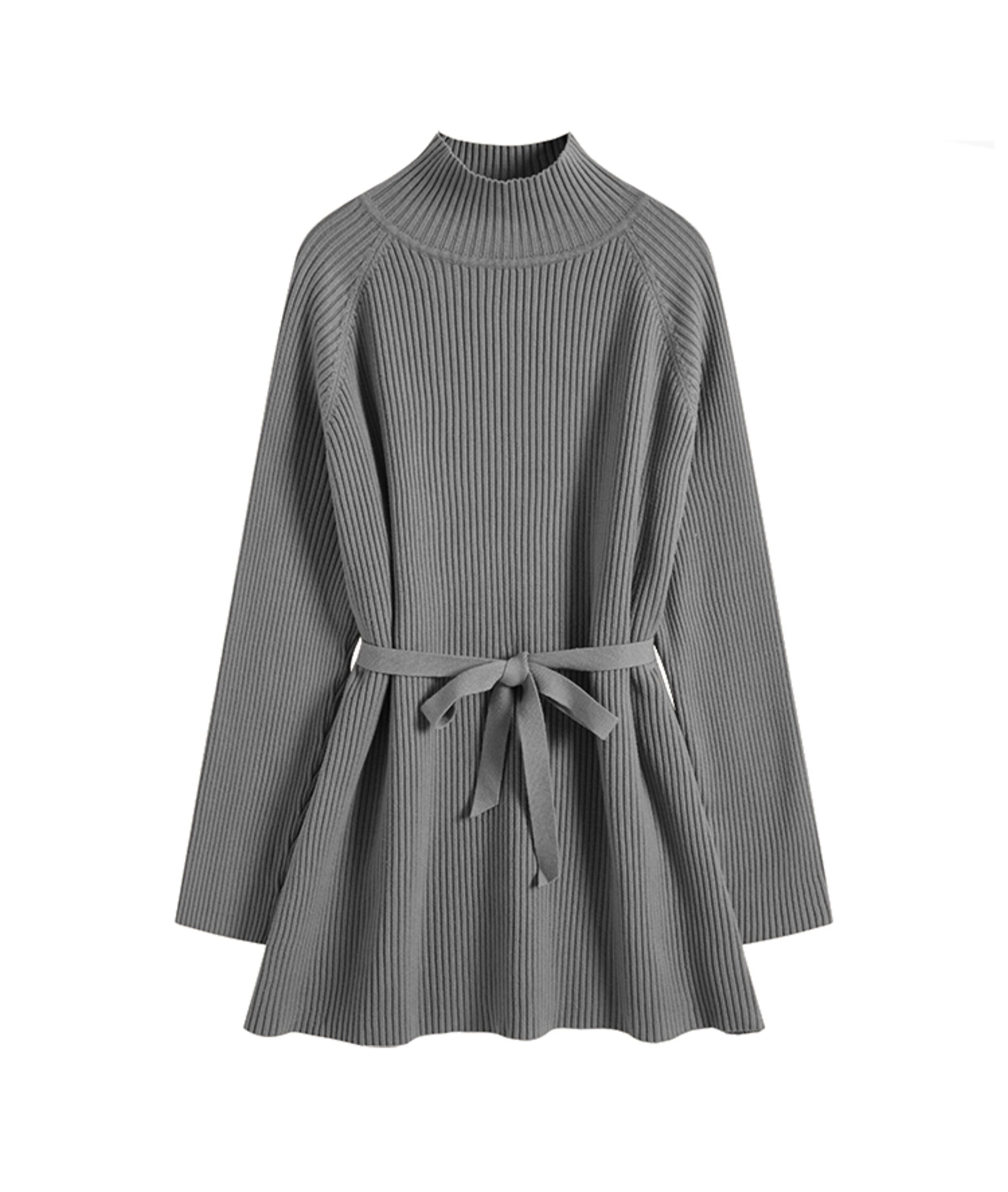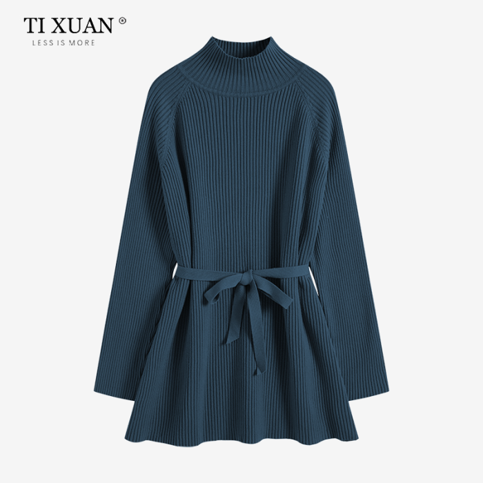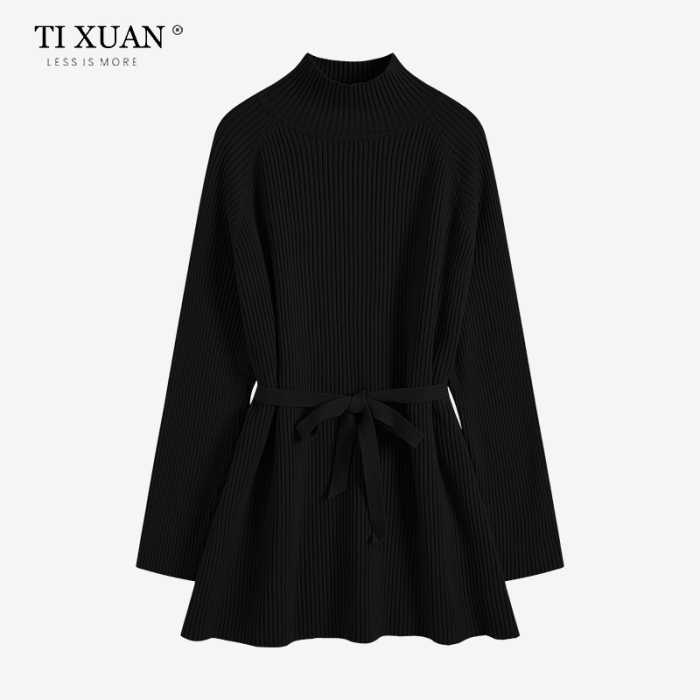 秋冬韓系氣質半高領系帶寬松遮屁股顯瘦中長款針織打底衫毛衣裙子