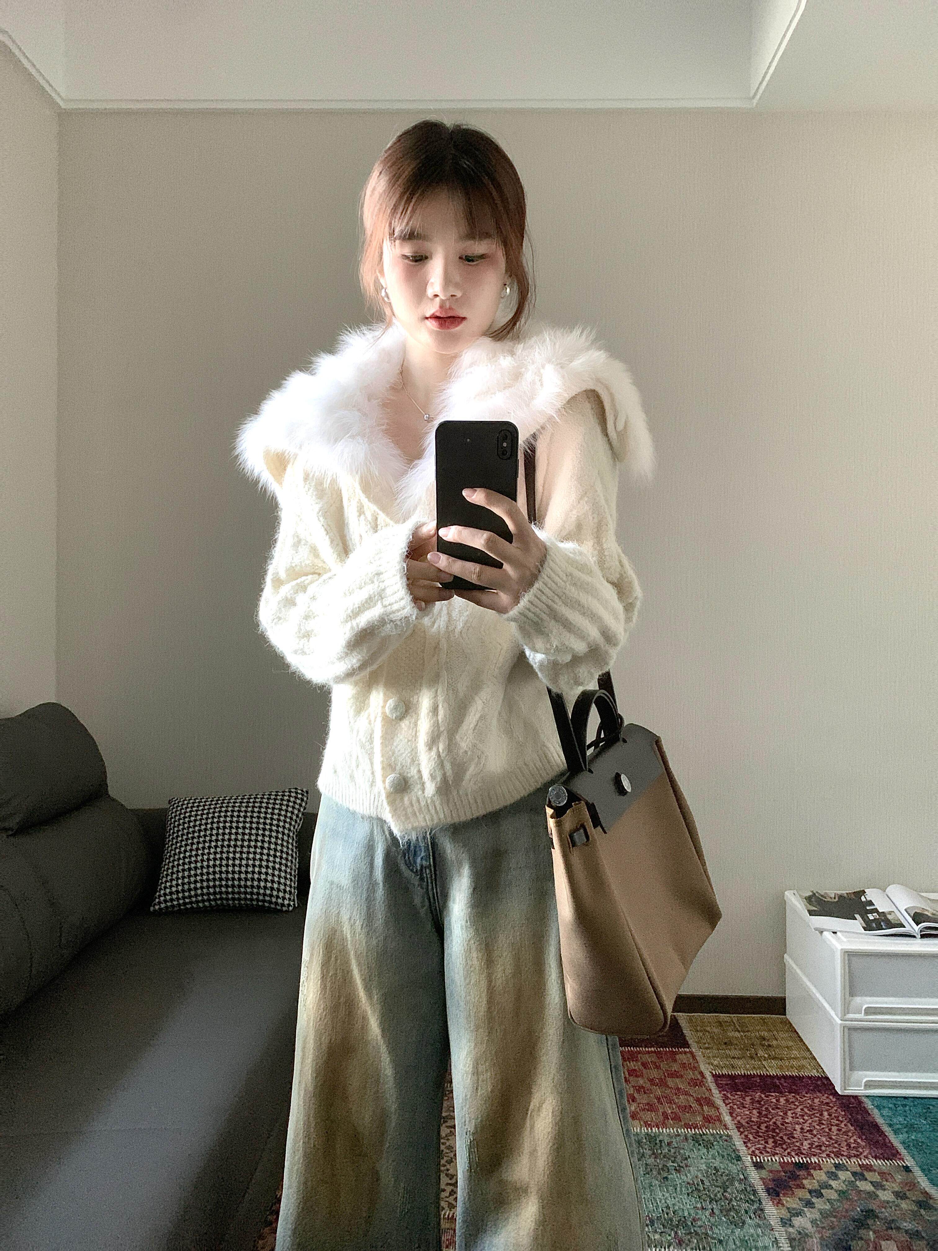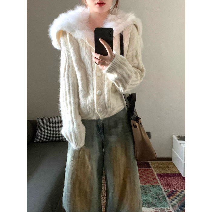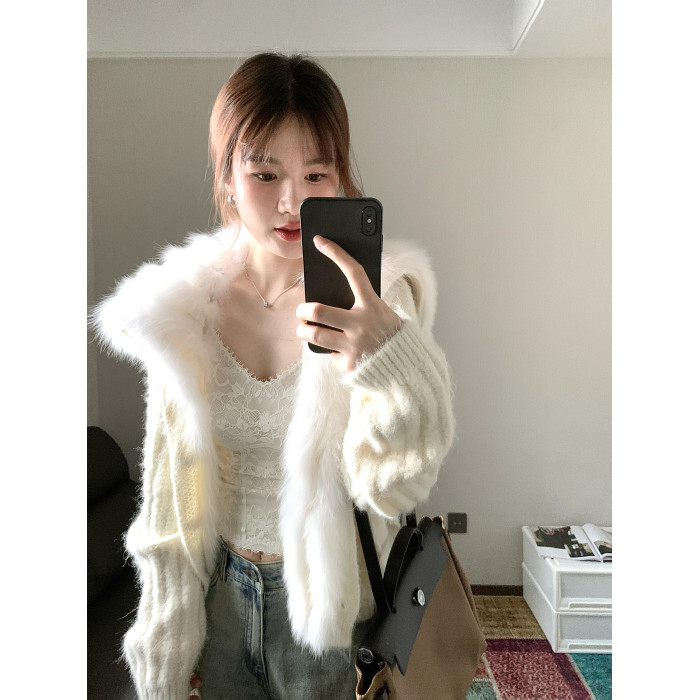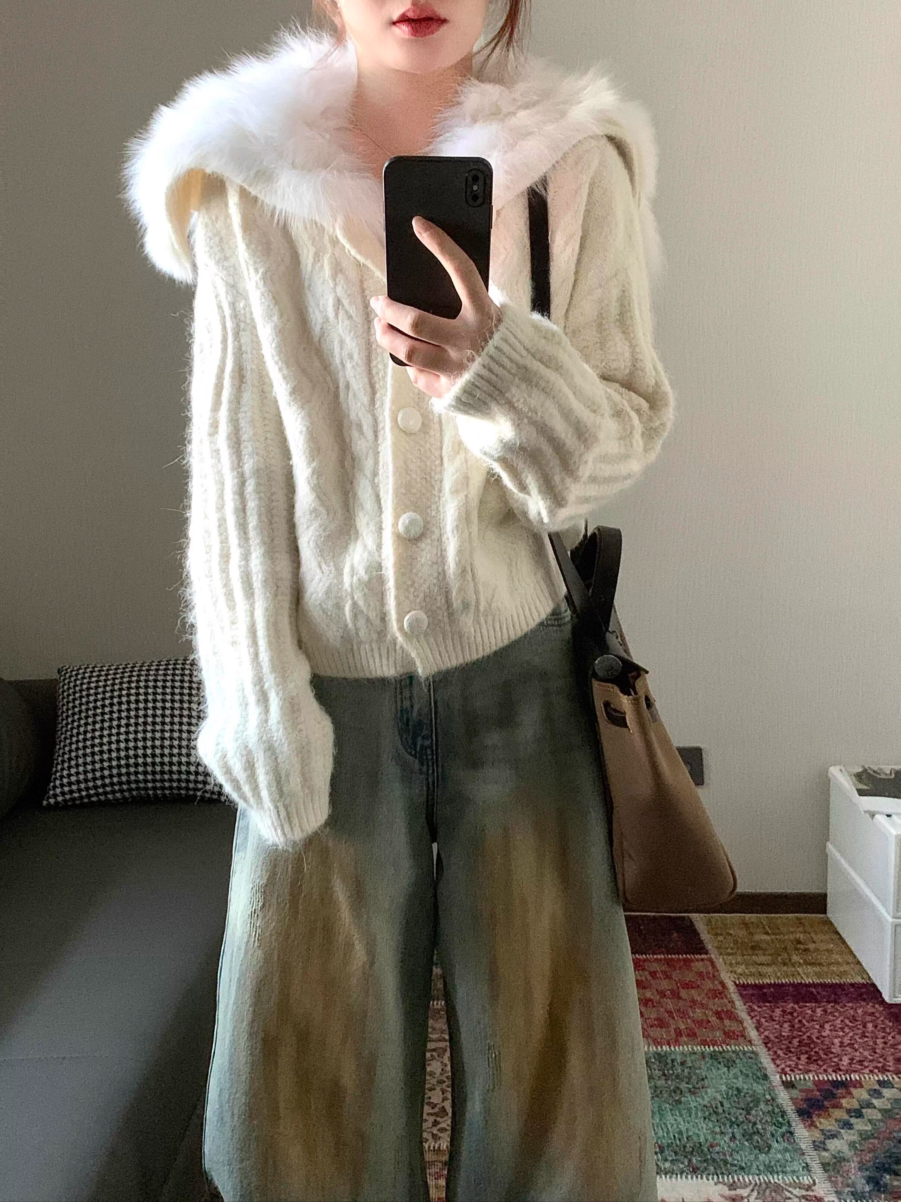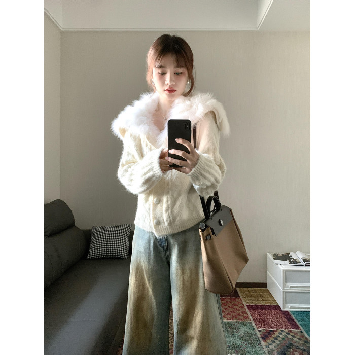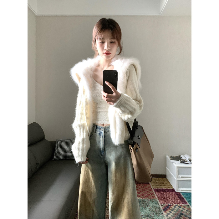 白色海軍領仿狐狸毛針織開衫女2025秋冬新款軟糯寬松顯瘦毛衣外套