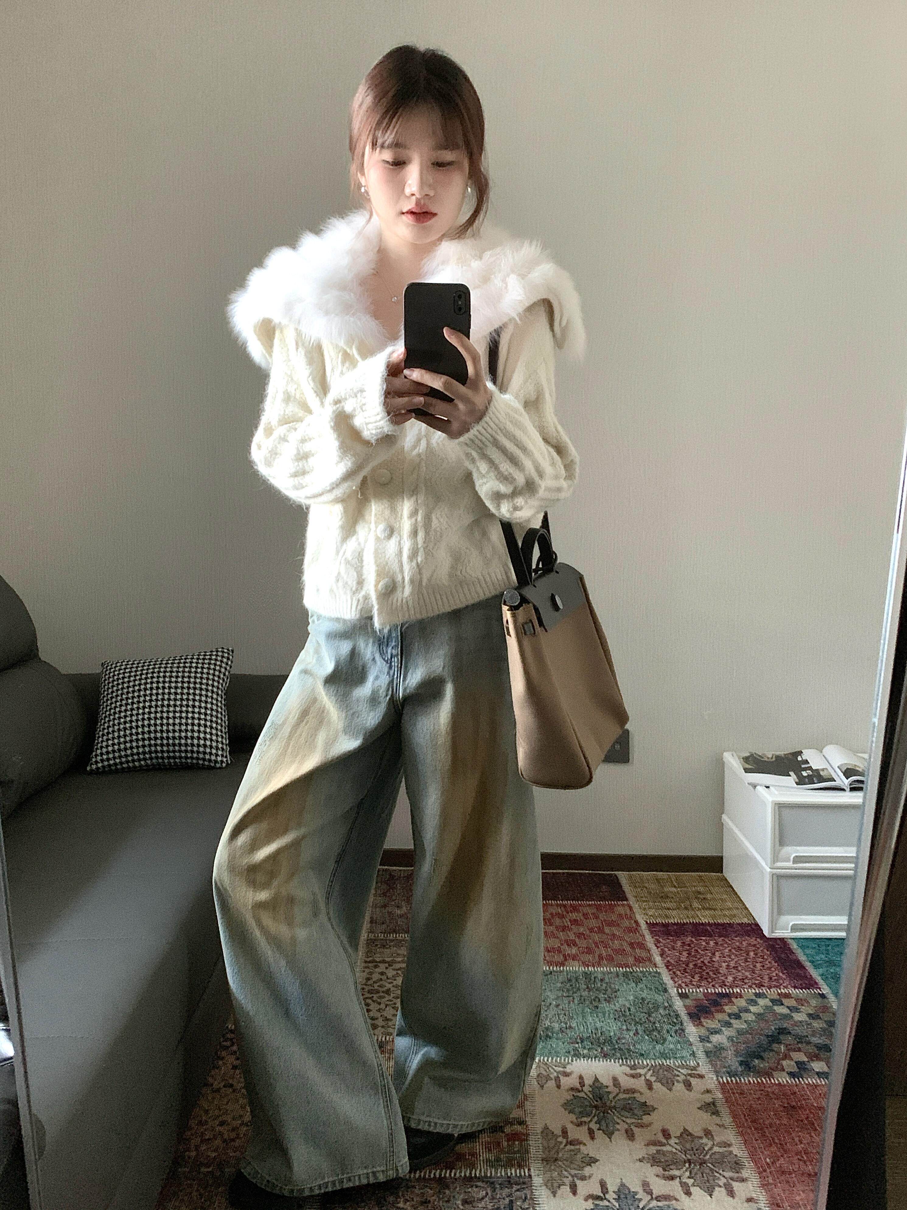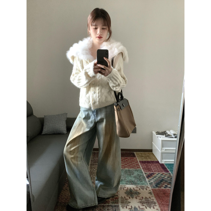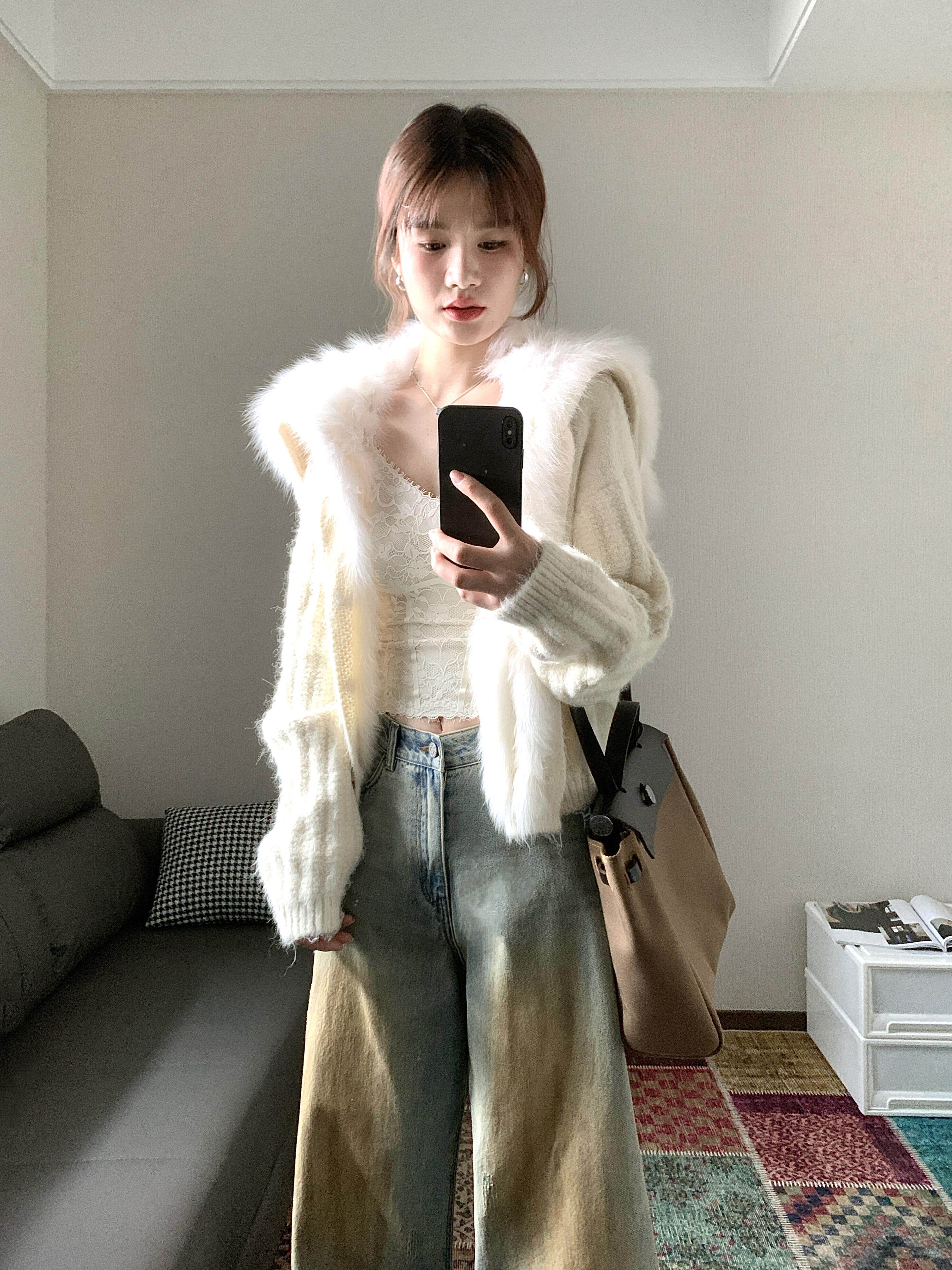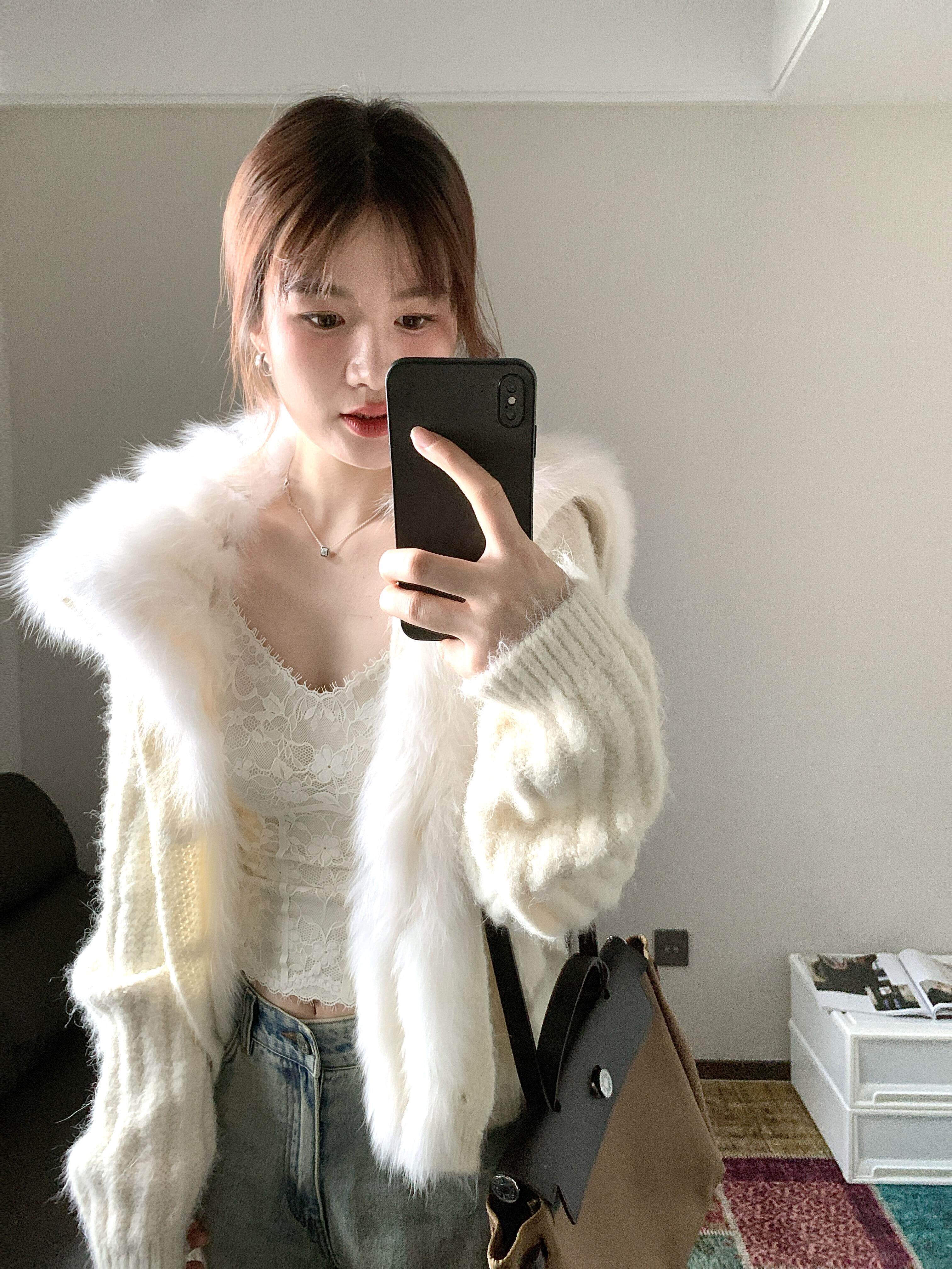 白色海軍領仿狐狸毛針織開衫女2025秋冬新款軟糯寬松顯瘦毛衣外套