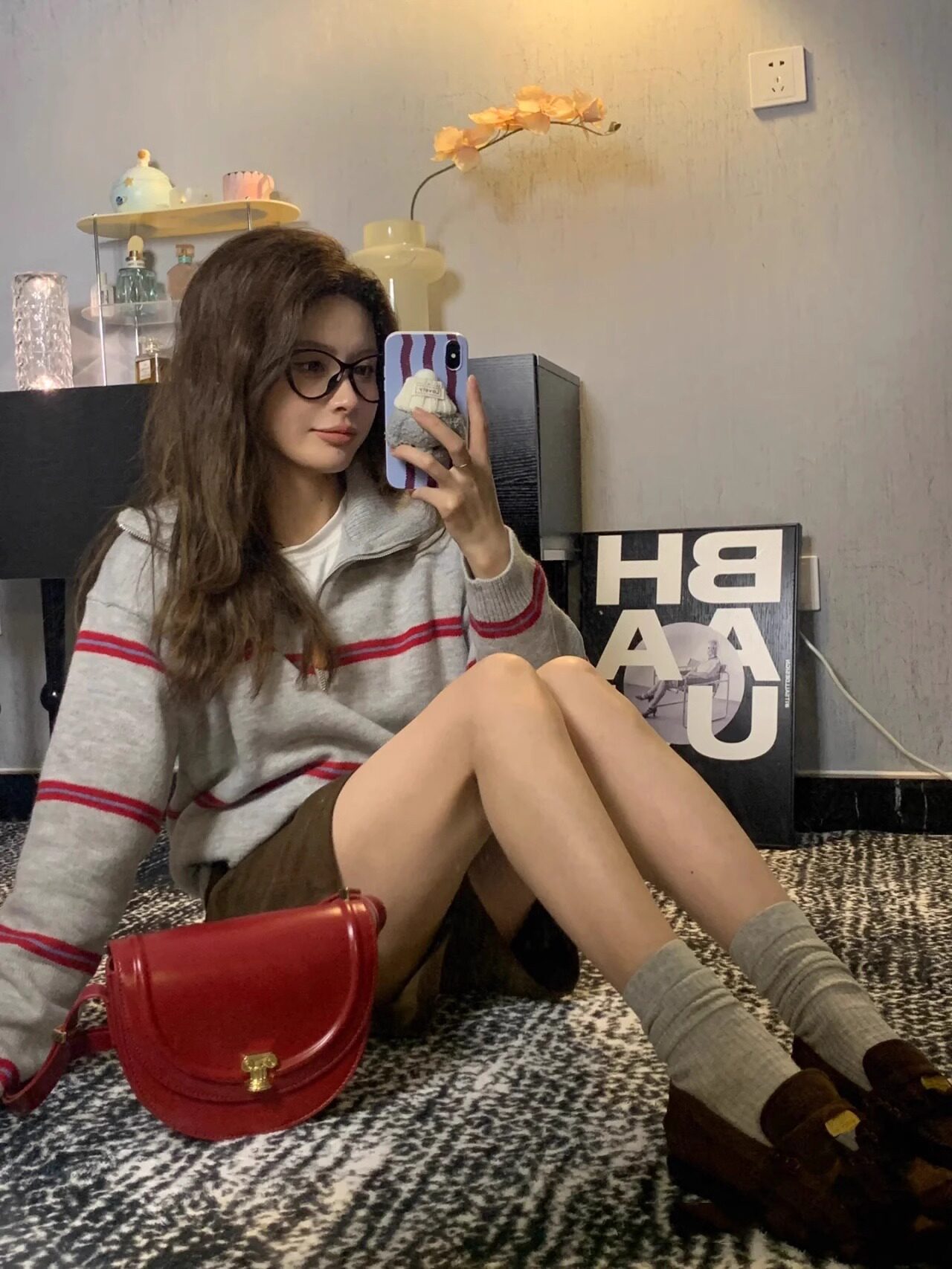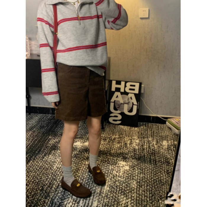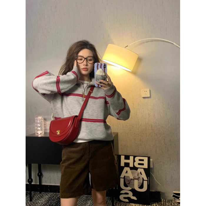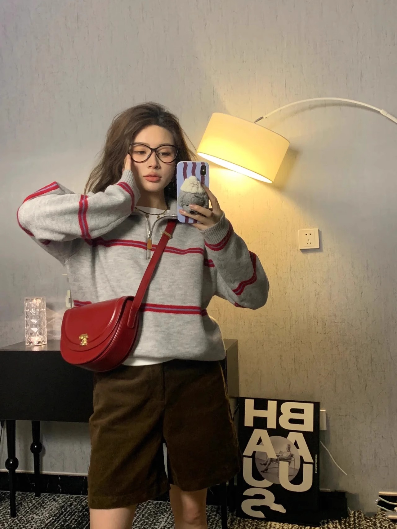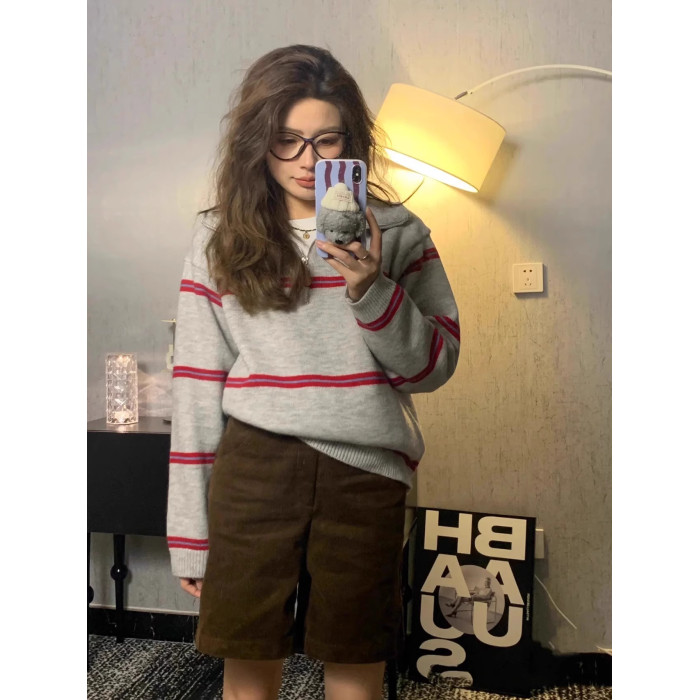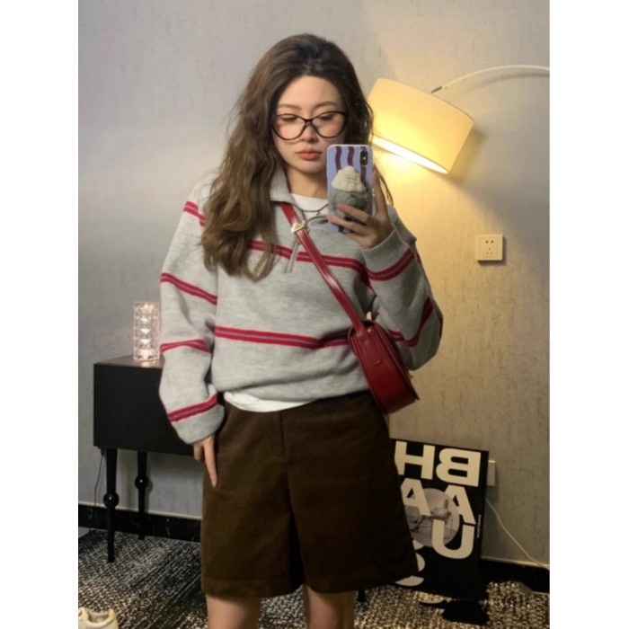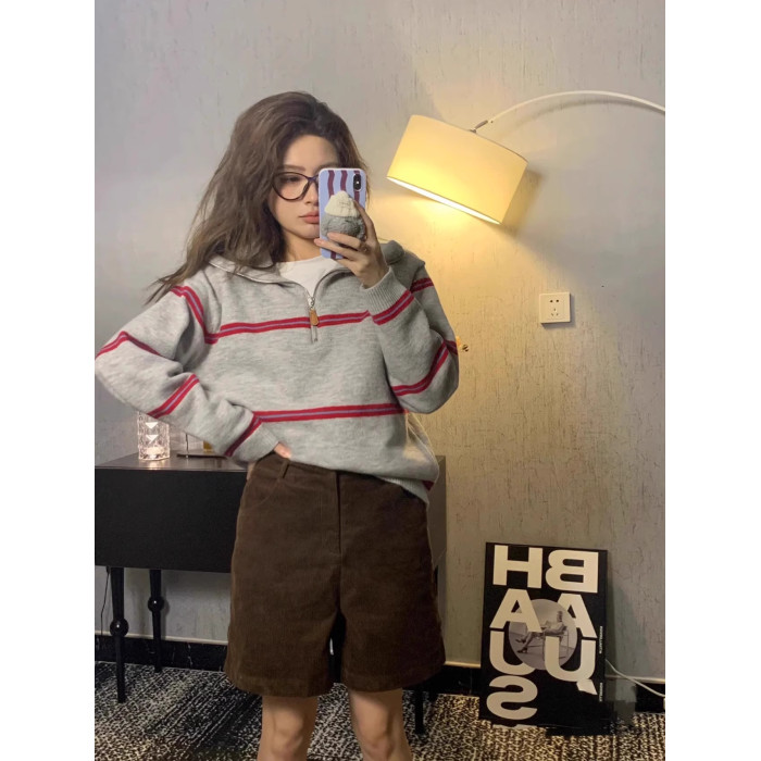 polo領半拉鍊條紋毛衣女裝秋冬慵懶風針織衫套頭針織衛衣2025新款