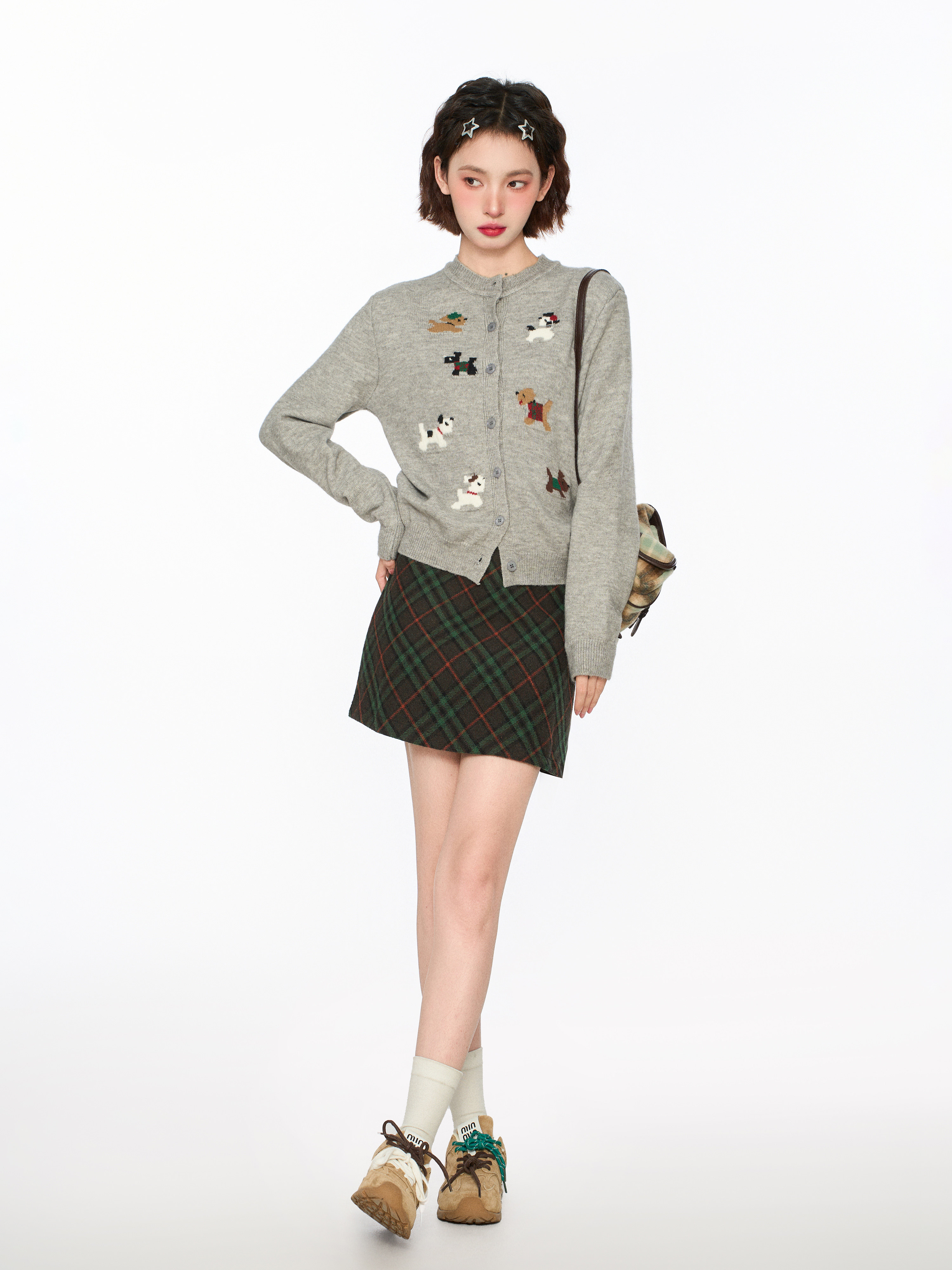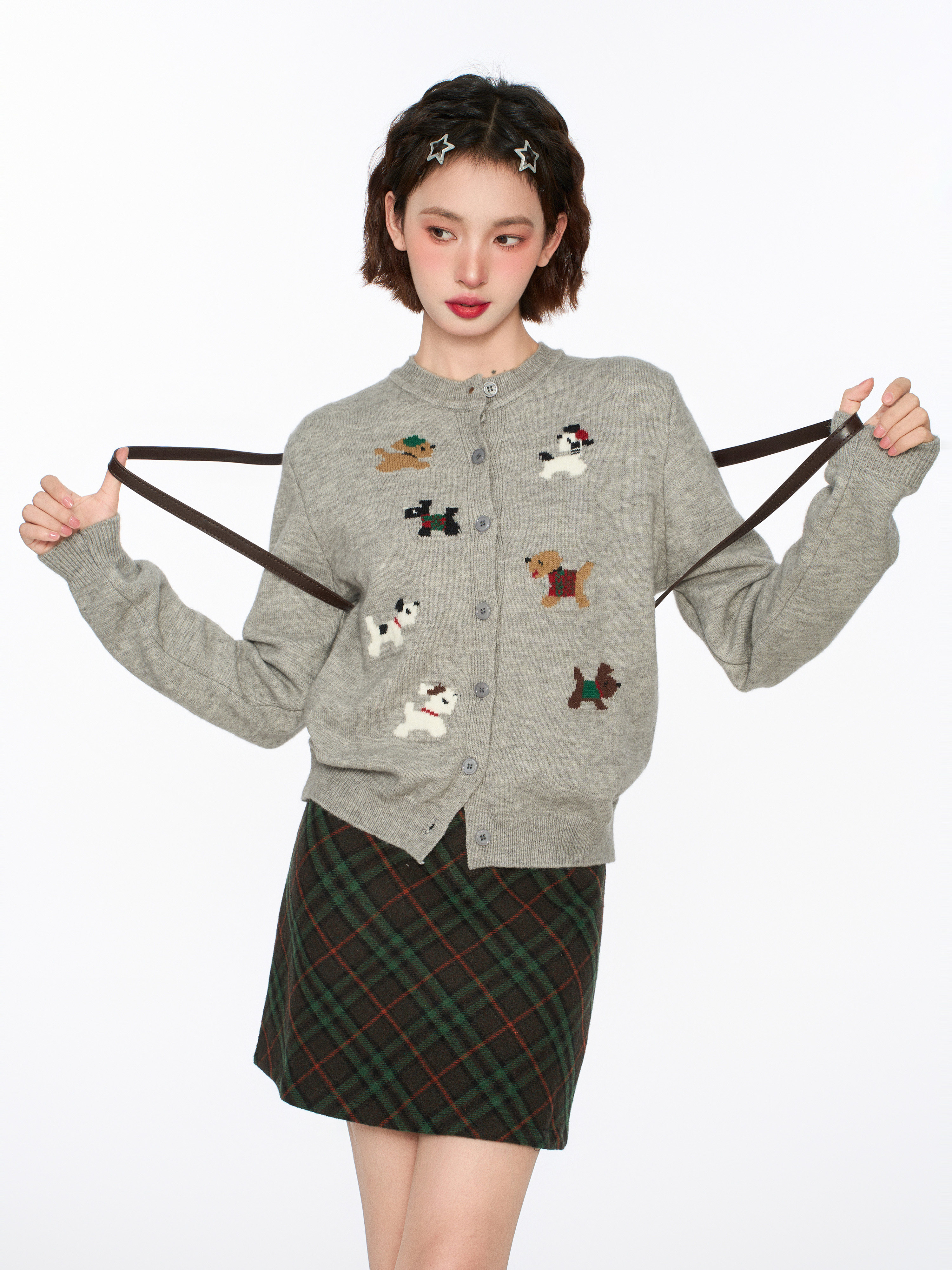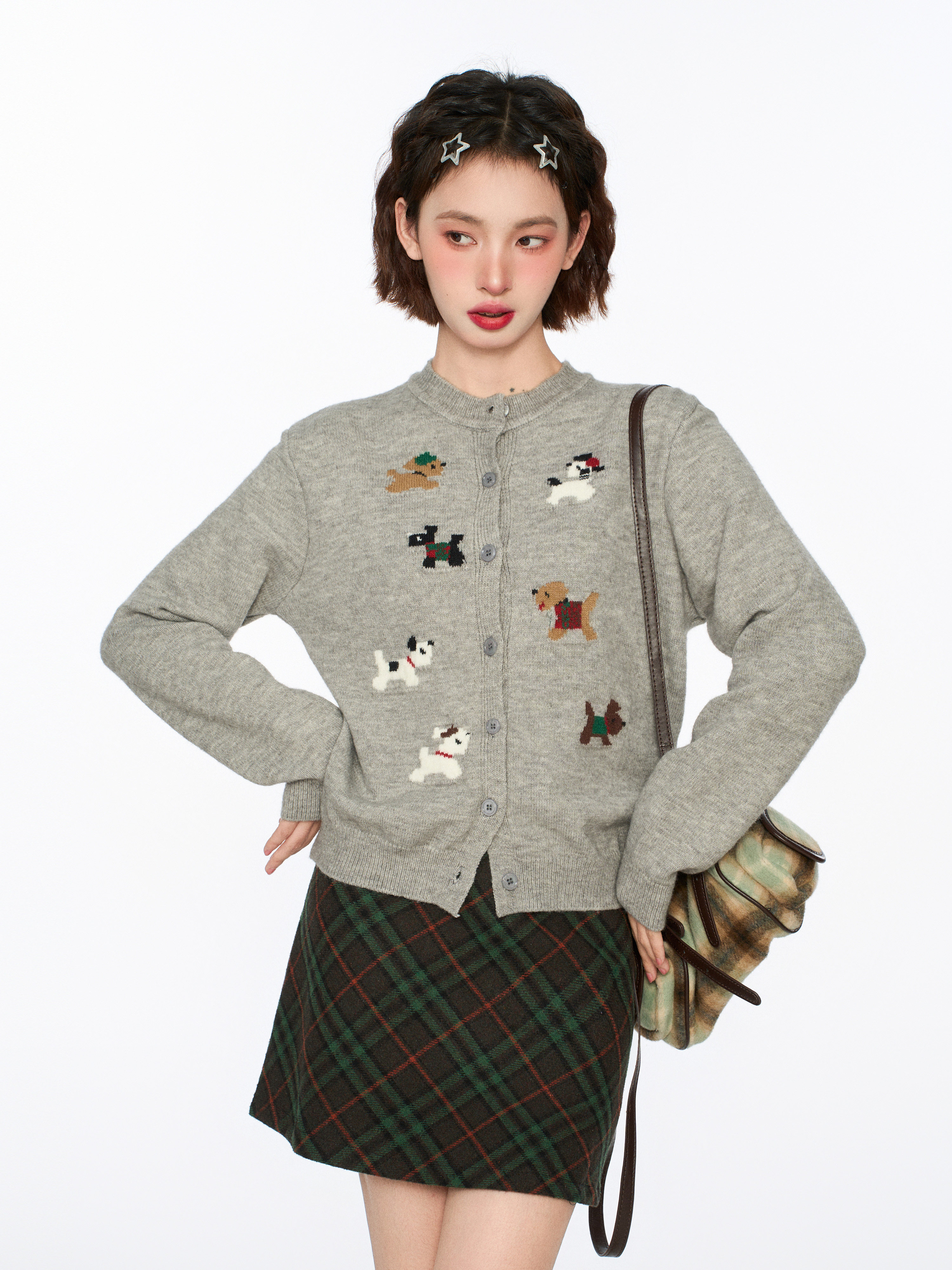 灰色小狗針織開衫毛衣外套女秋冬季小個子短款打底內搭羊毛針織衫
