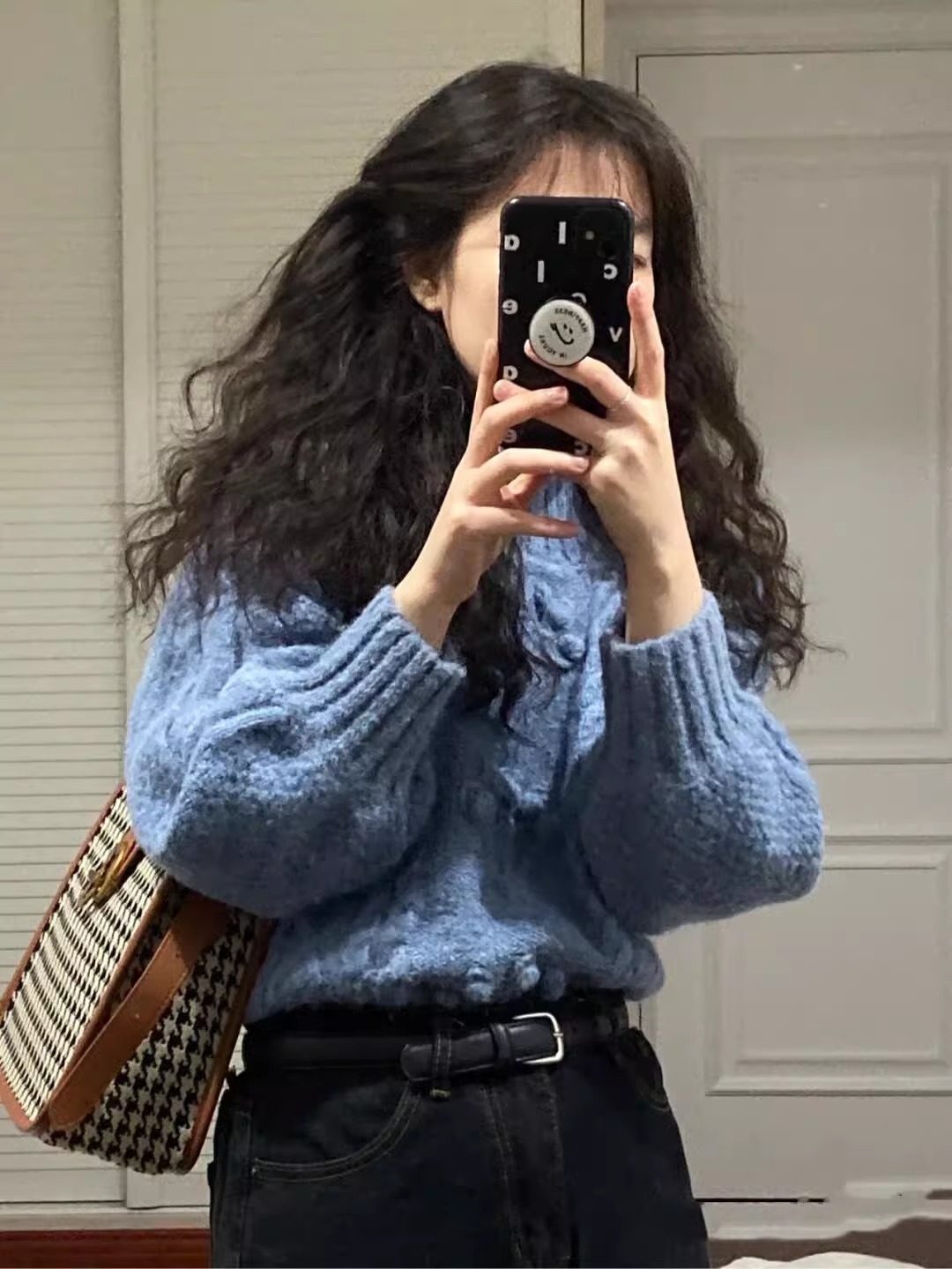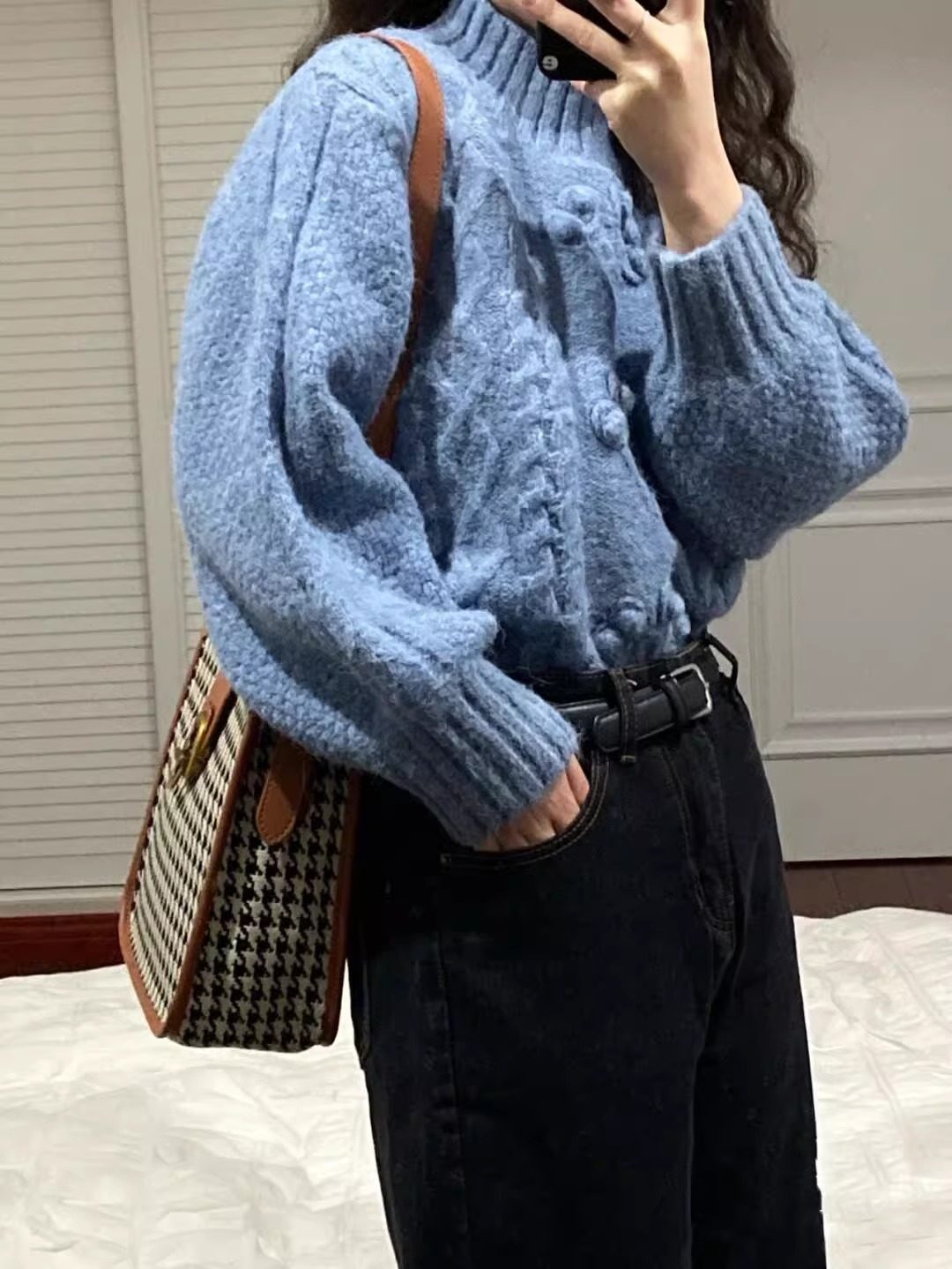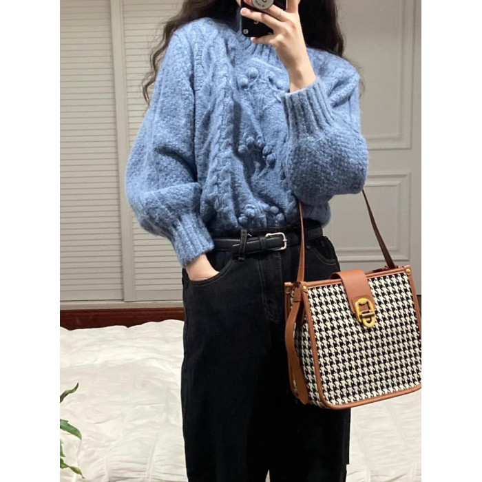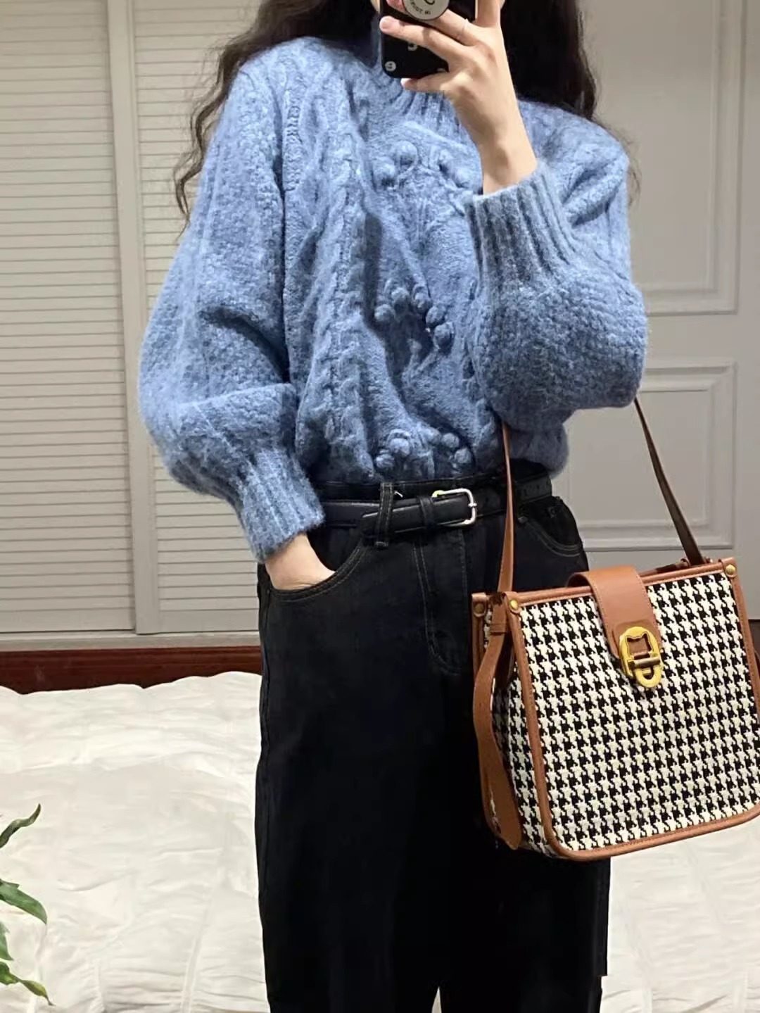 復古重工鉤花藍色麻花毛衣女秋冬外穿設計感針織衫小個子短款上衣