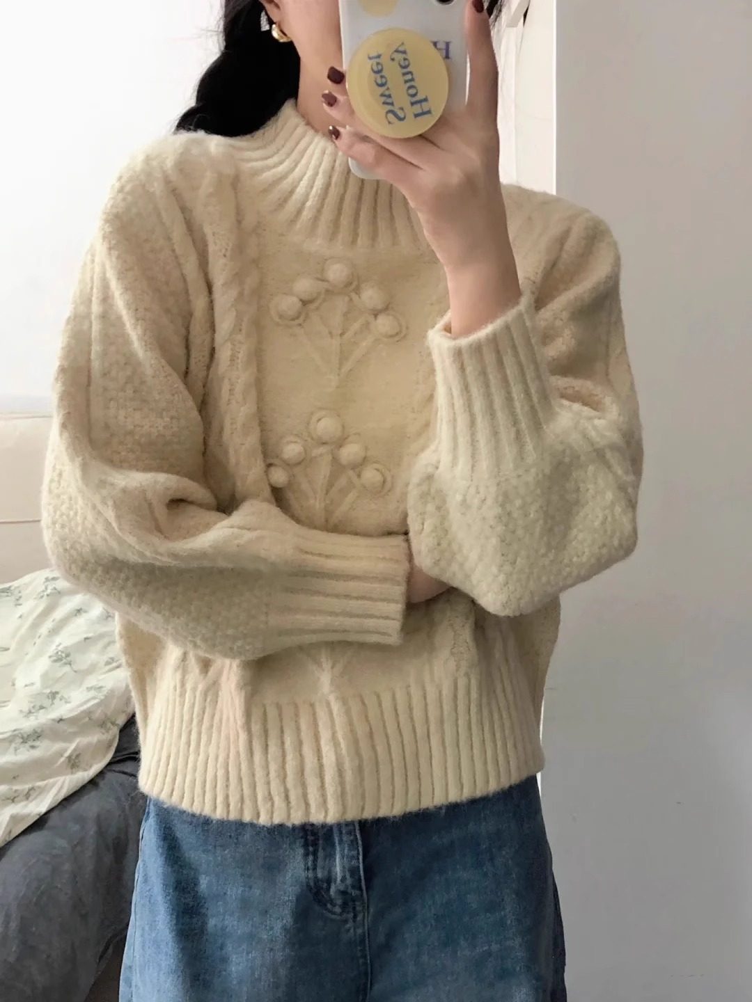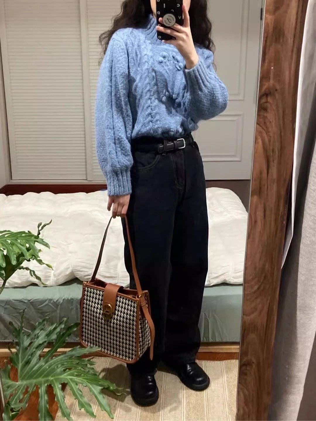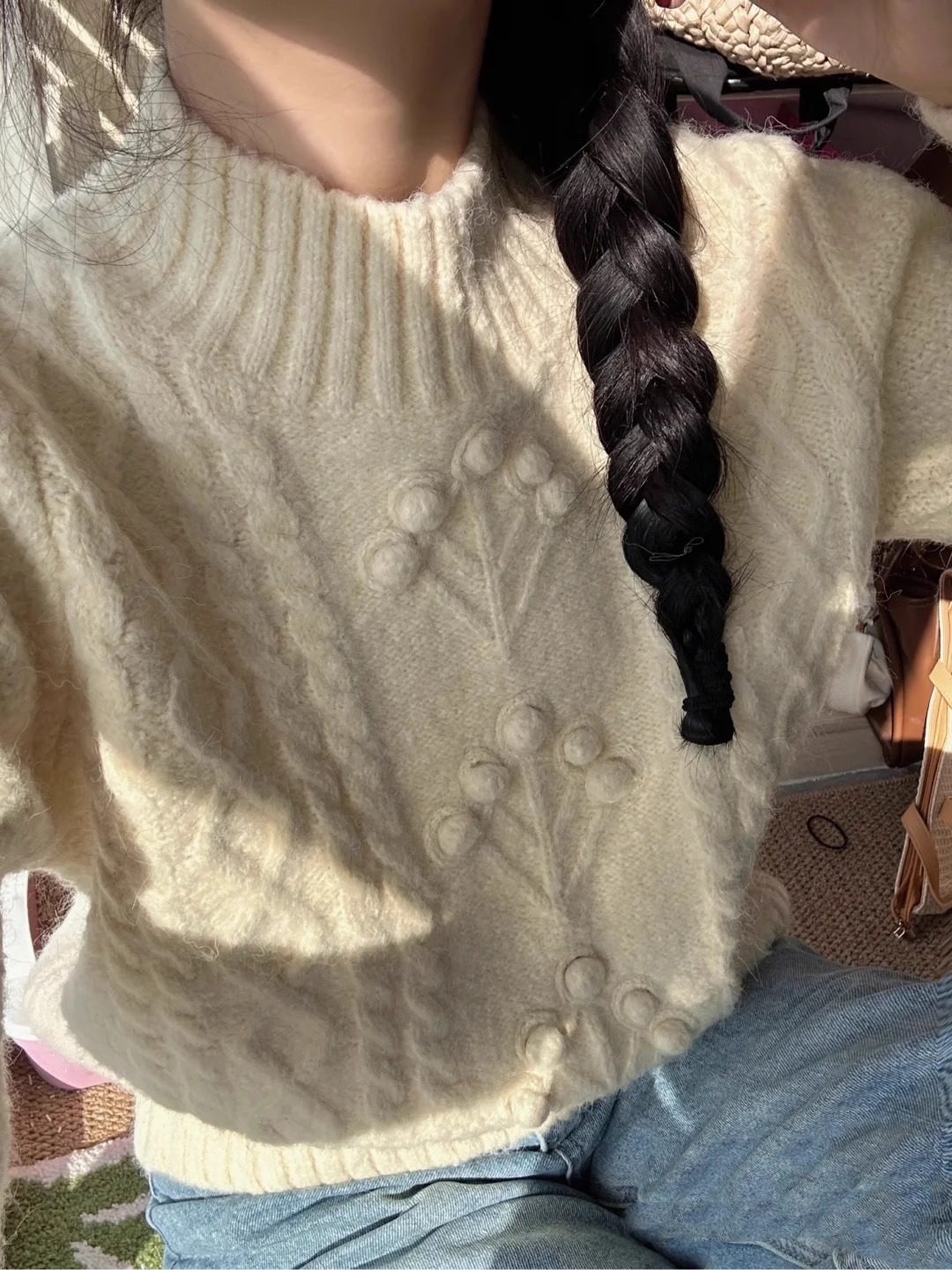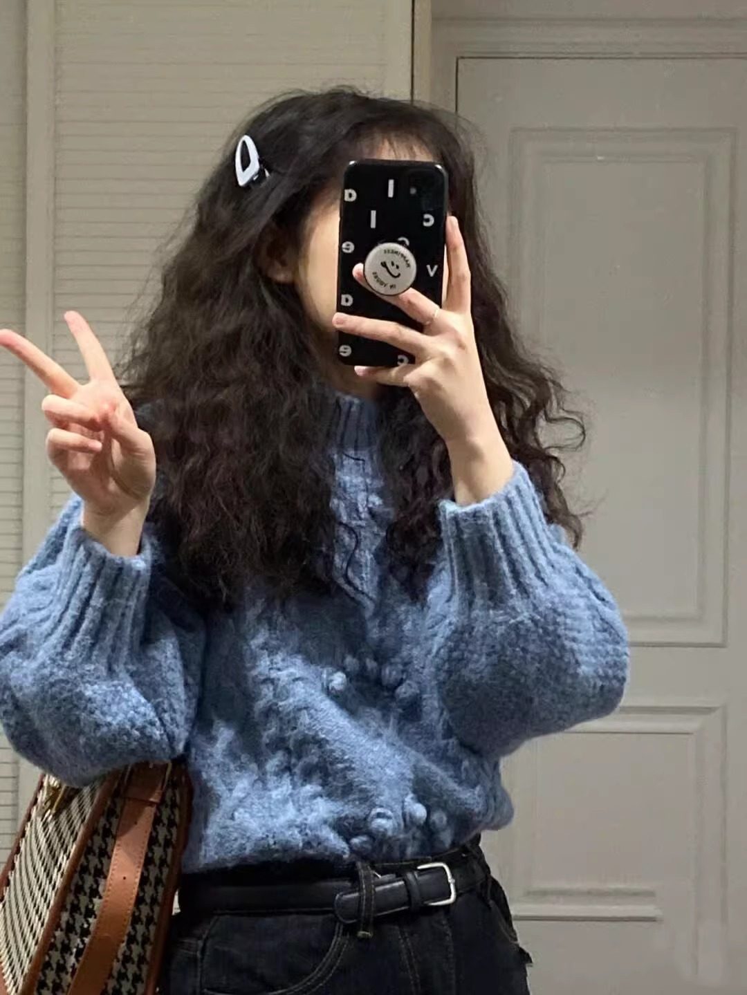 復古重工鉤花藍色麻花毛衣女秋冬外穿設計感針織衫小個子短款上衣