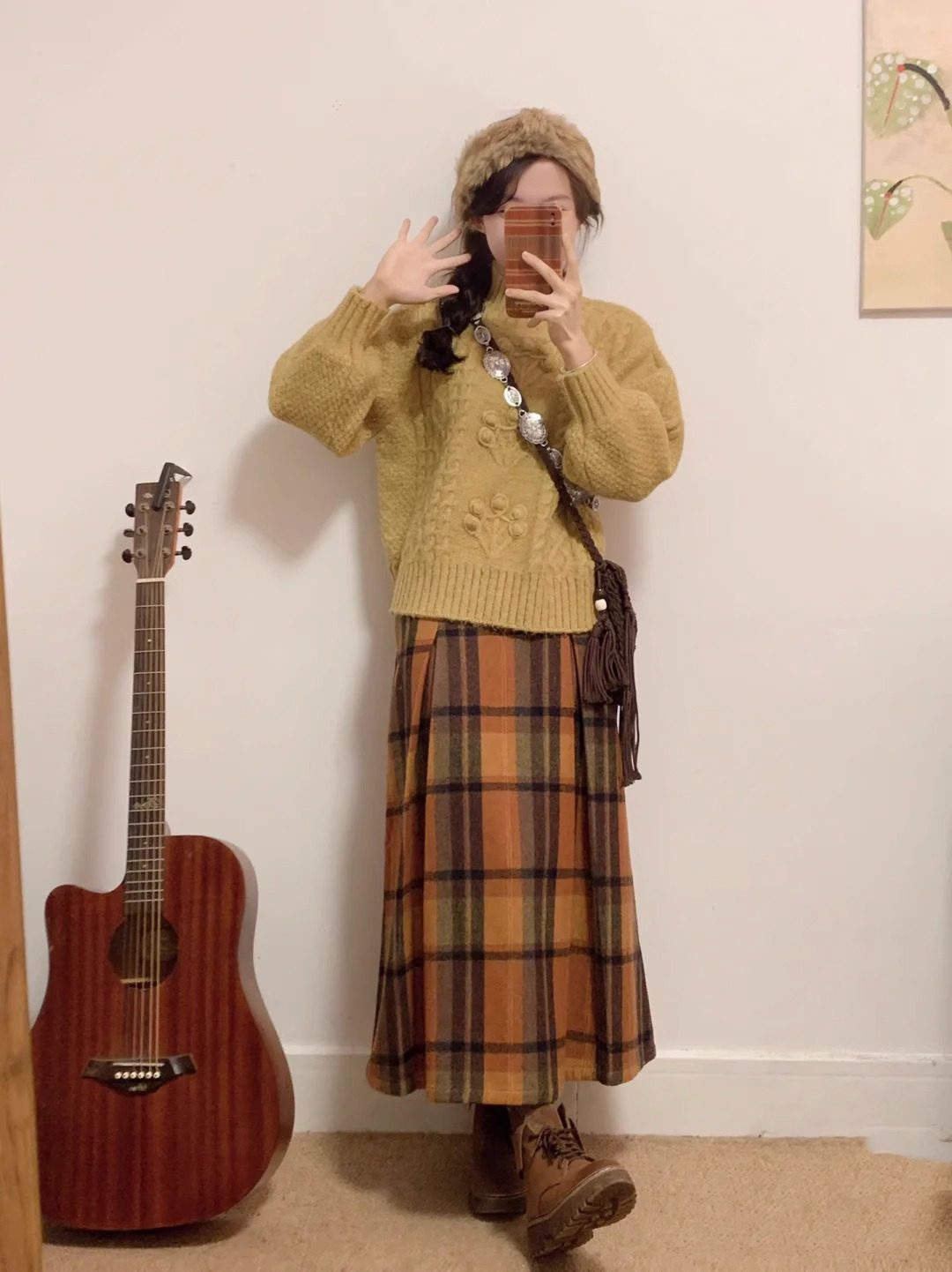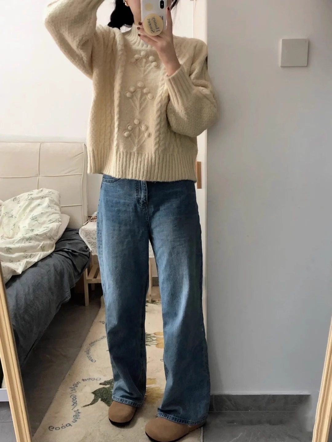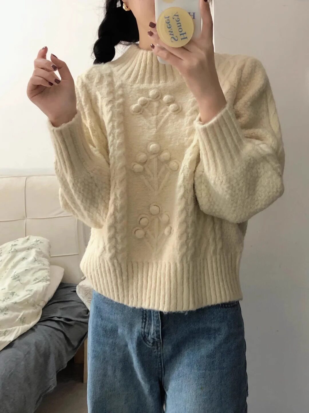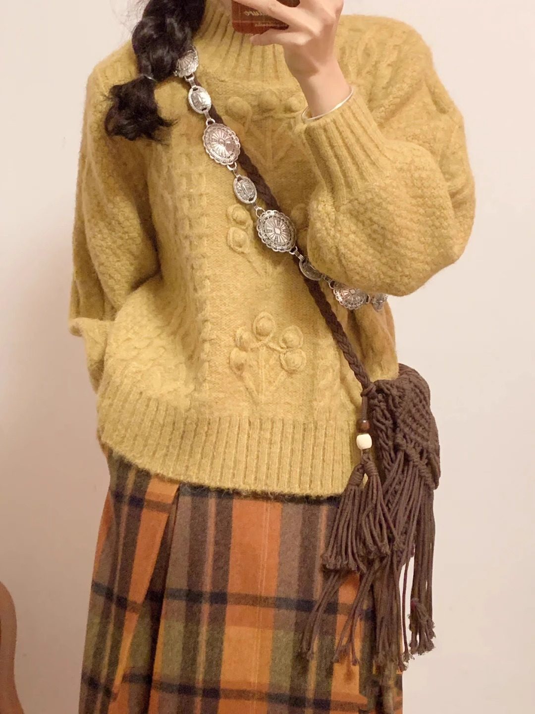 復古重工鉤花藍色麻花毛衣女秋冬外穿設計感針織衫小個子短款上衣