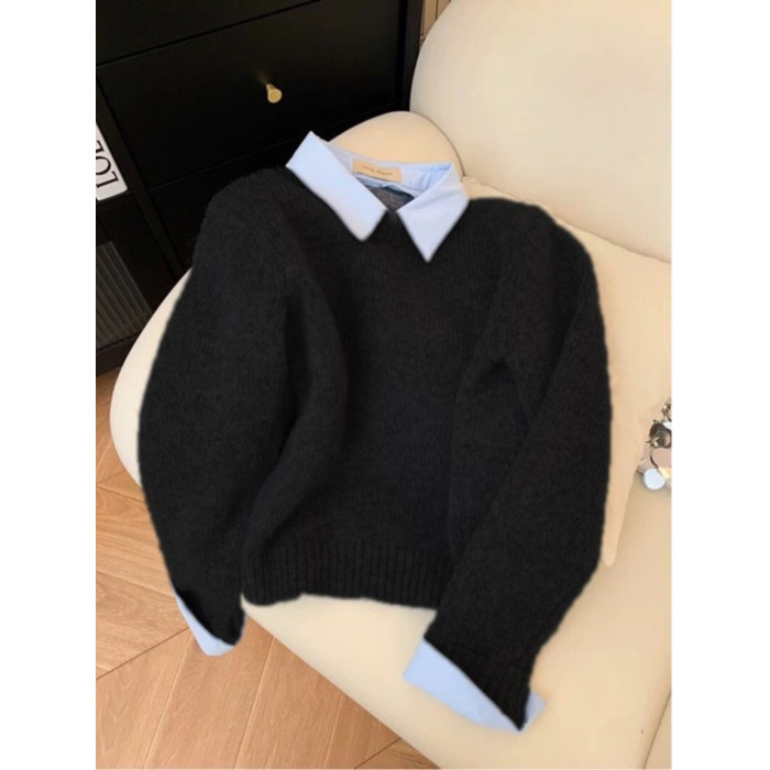 黑色polo領假兩件浣熊絨毛衣女秋冬韓系慵嬾學院風內搭針織衫上衣