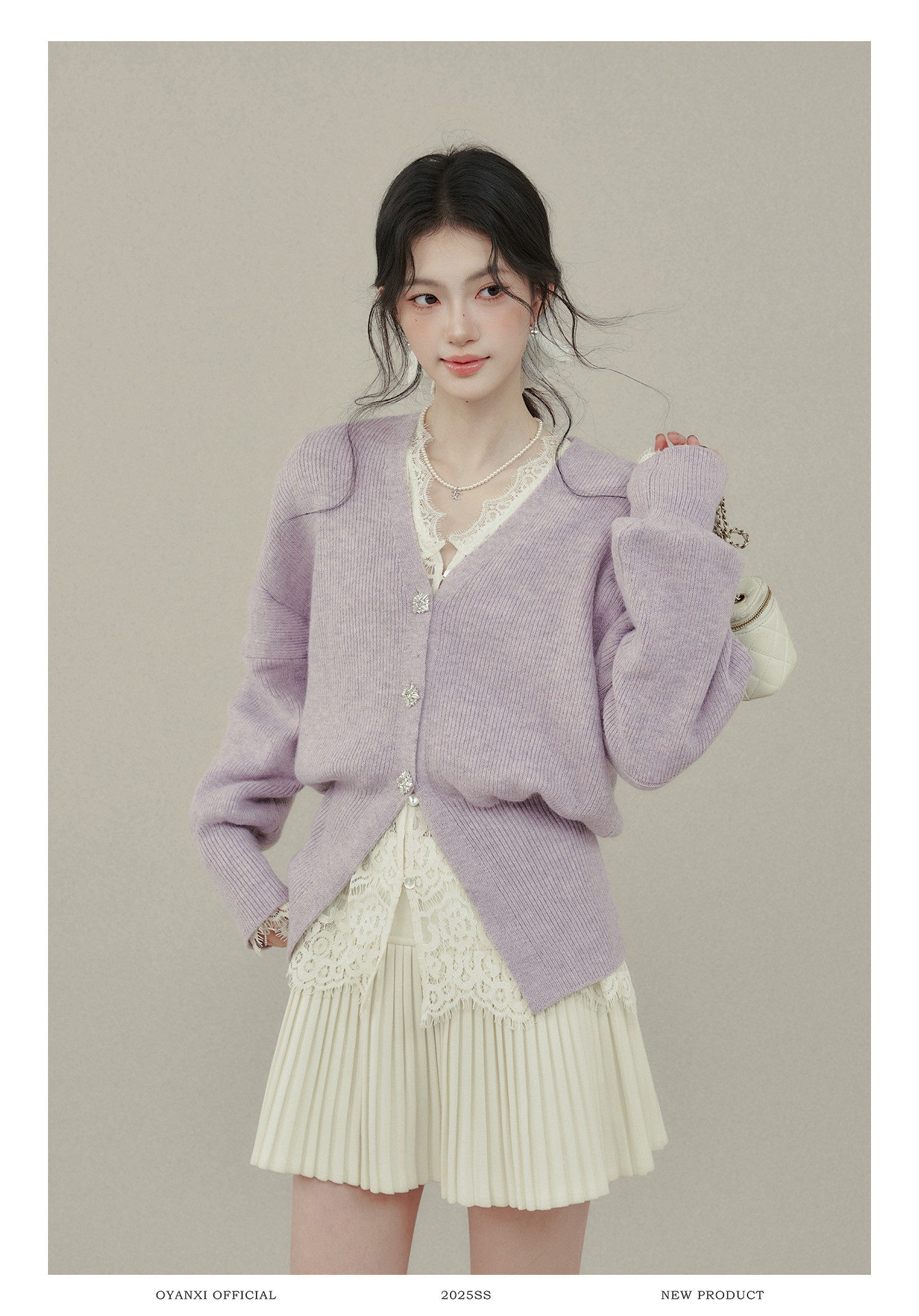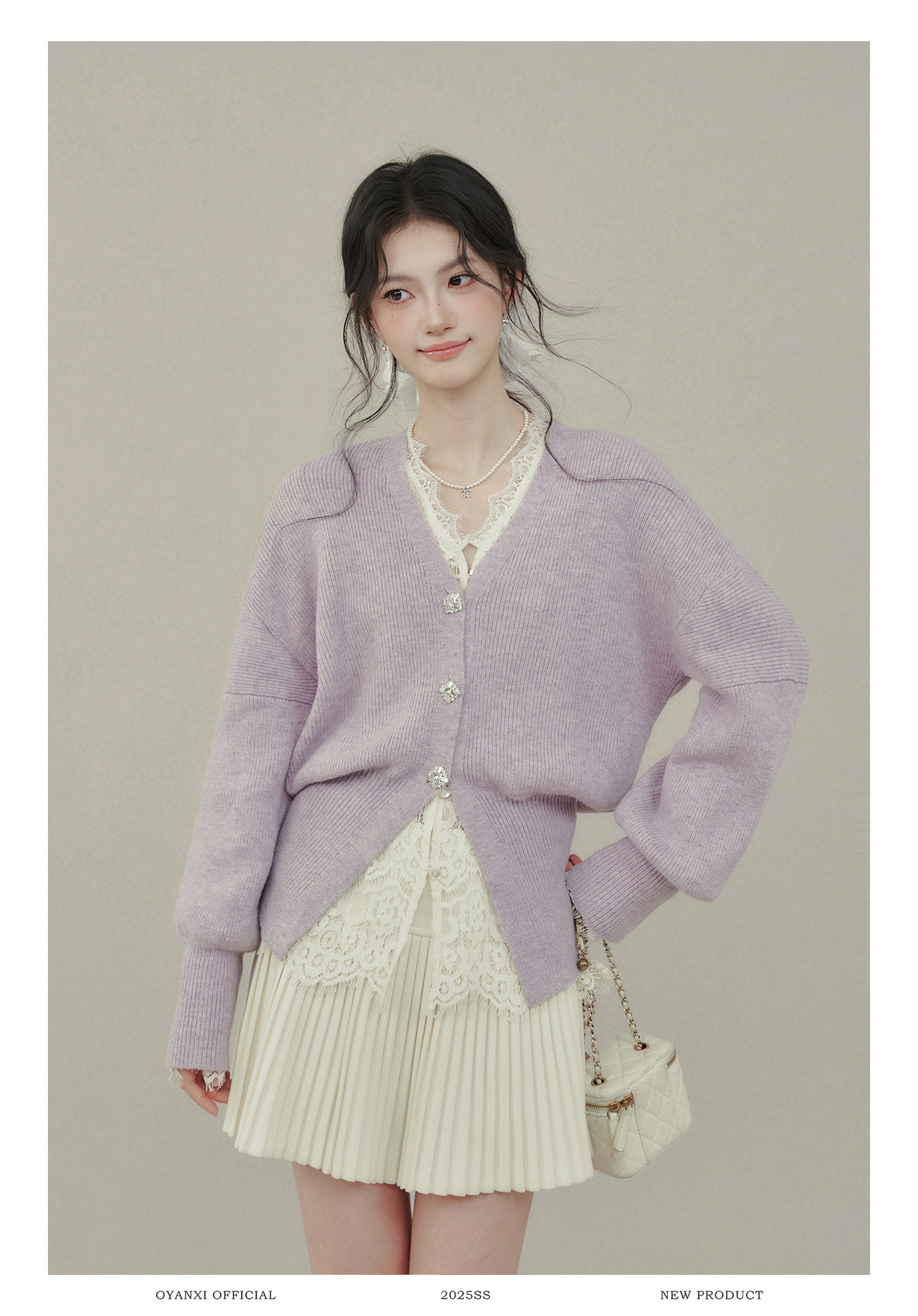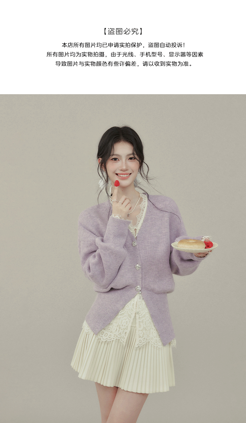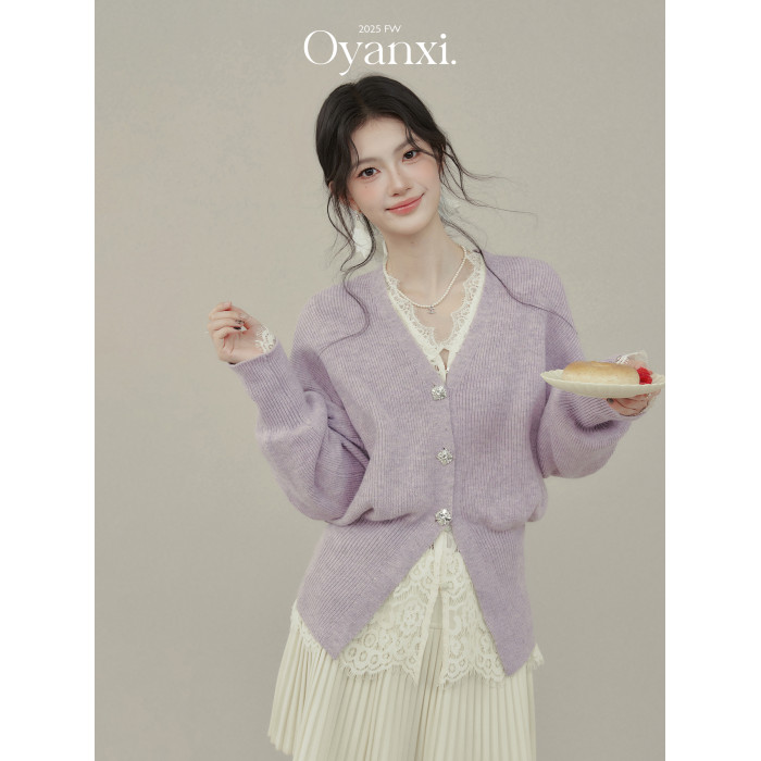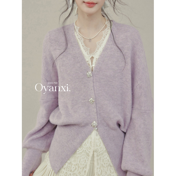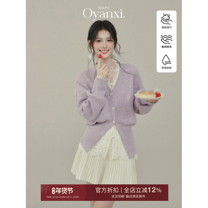 歐陽喜《法式高貴》紫色V領毛衣開衫女冬新款內搭外穿打底衫上衣