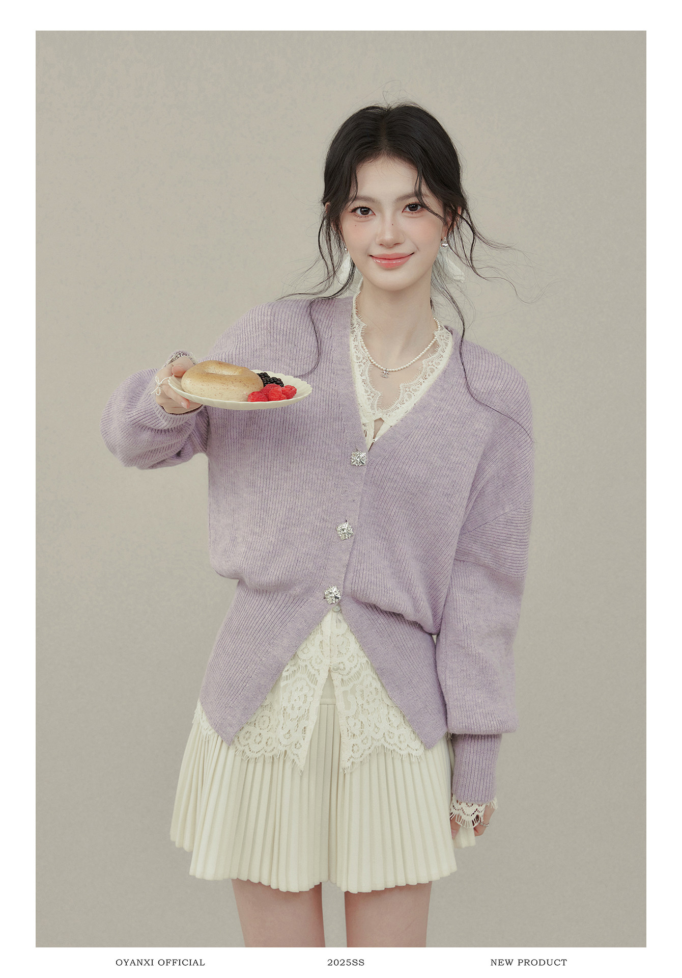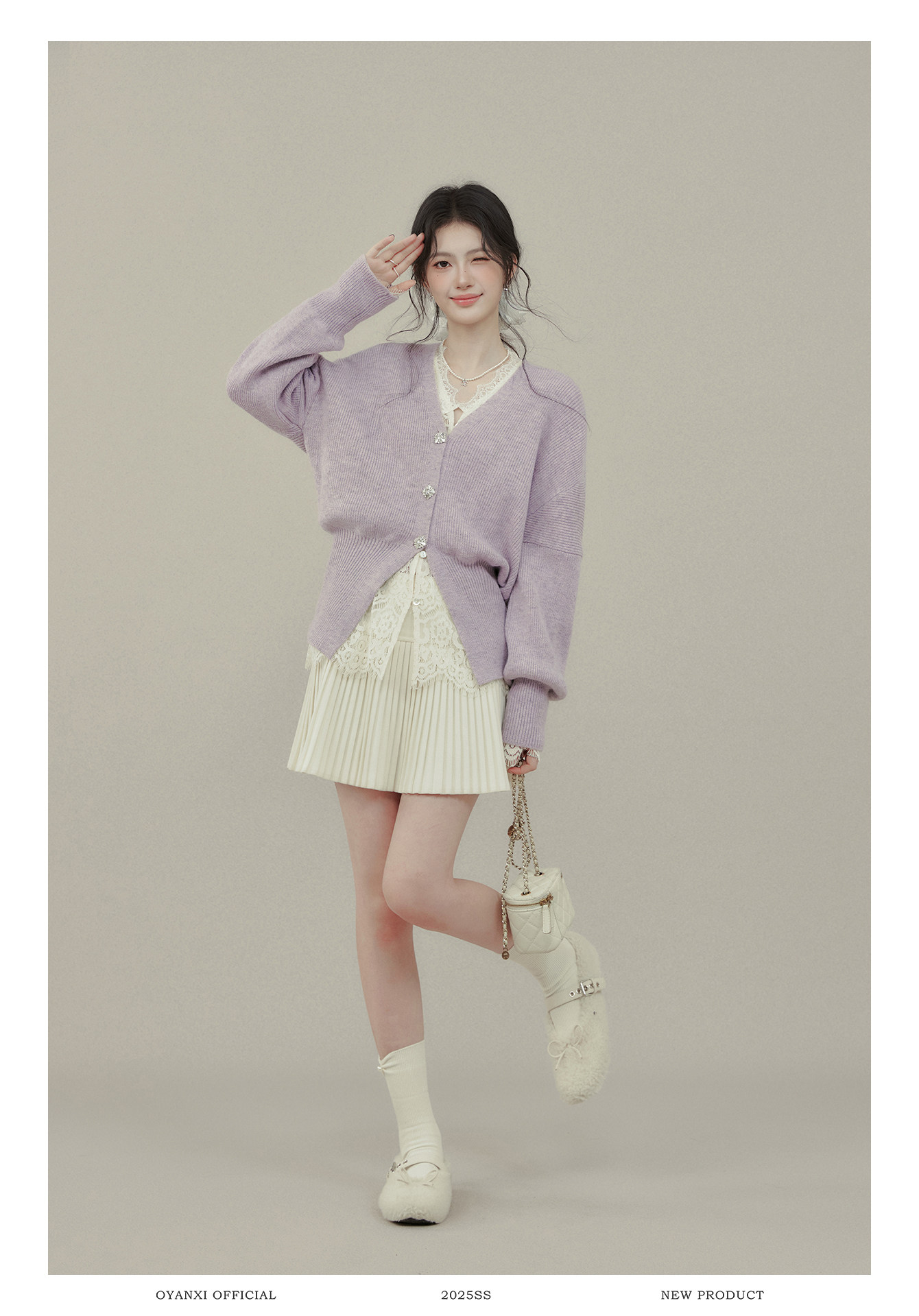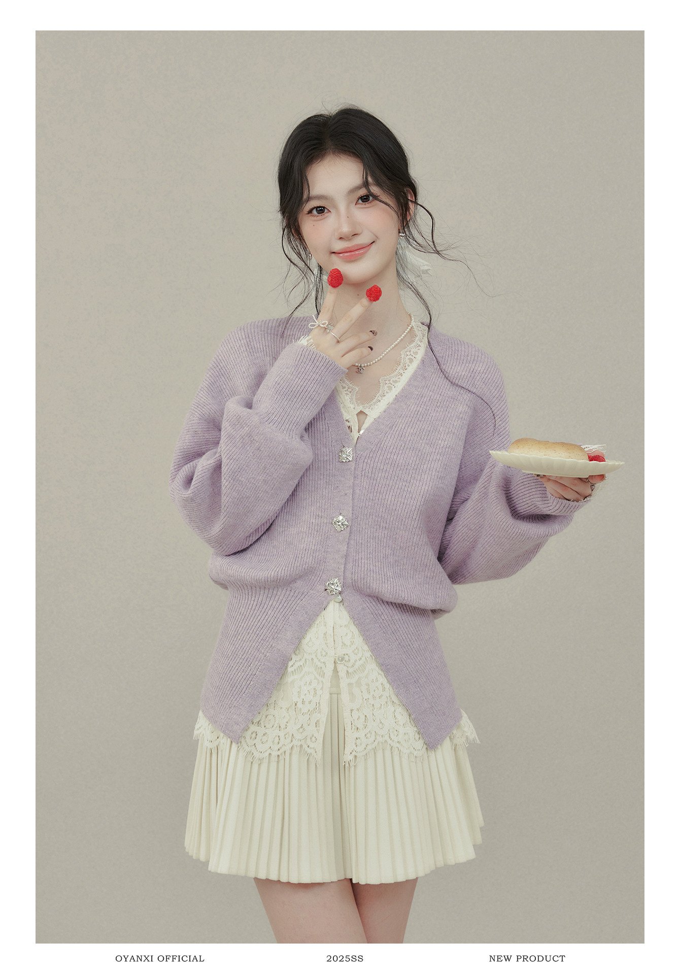 歐陽喜《法式高貴》紫色V領毛衣開衫女冬新款內搭外穿打底衫上衣