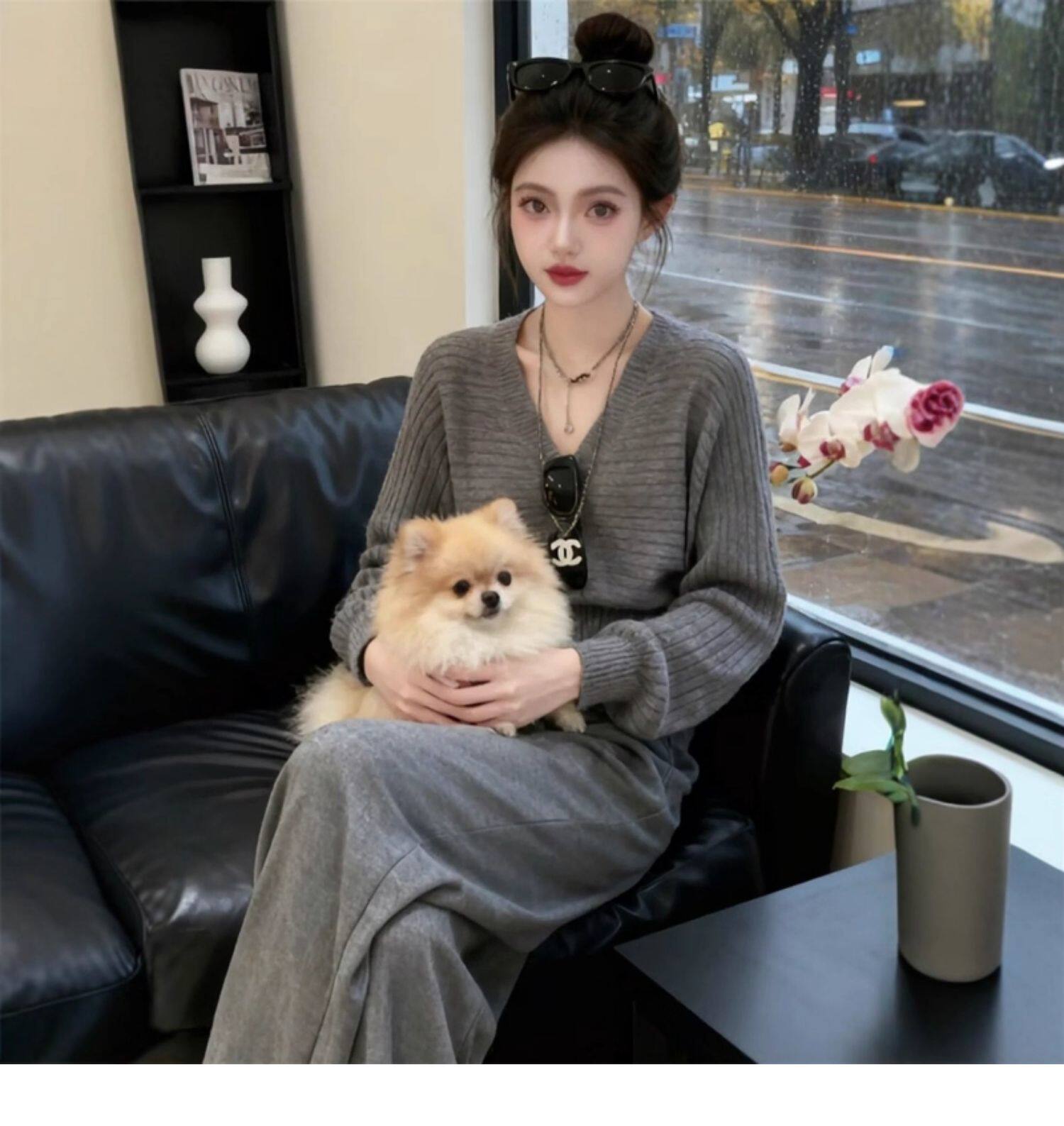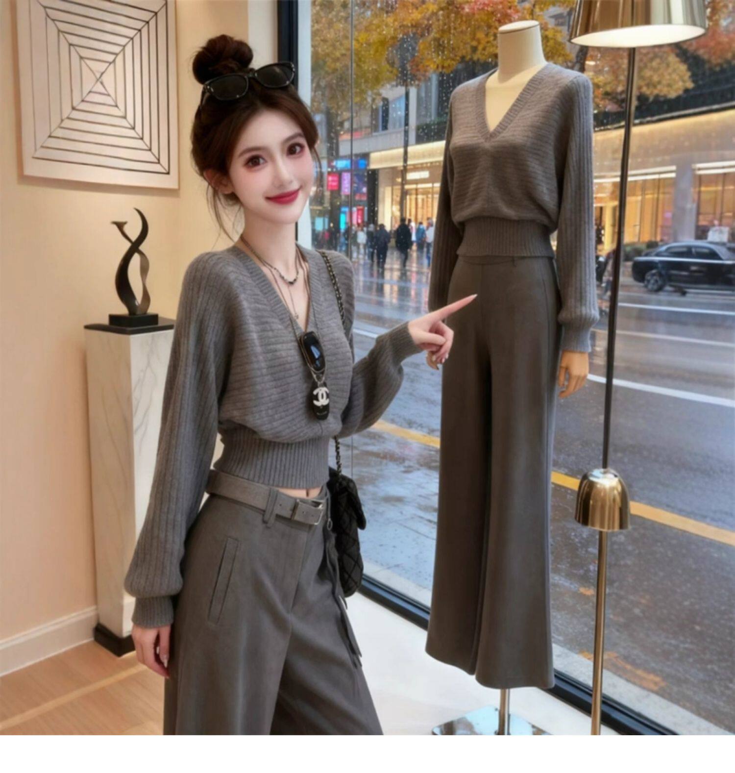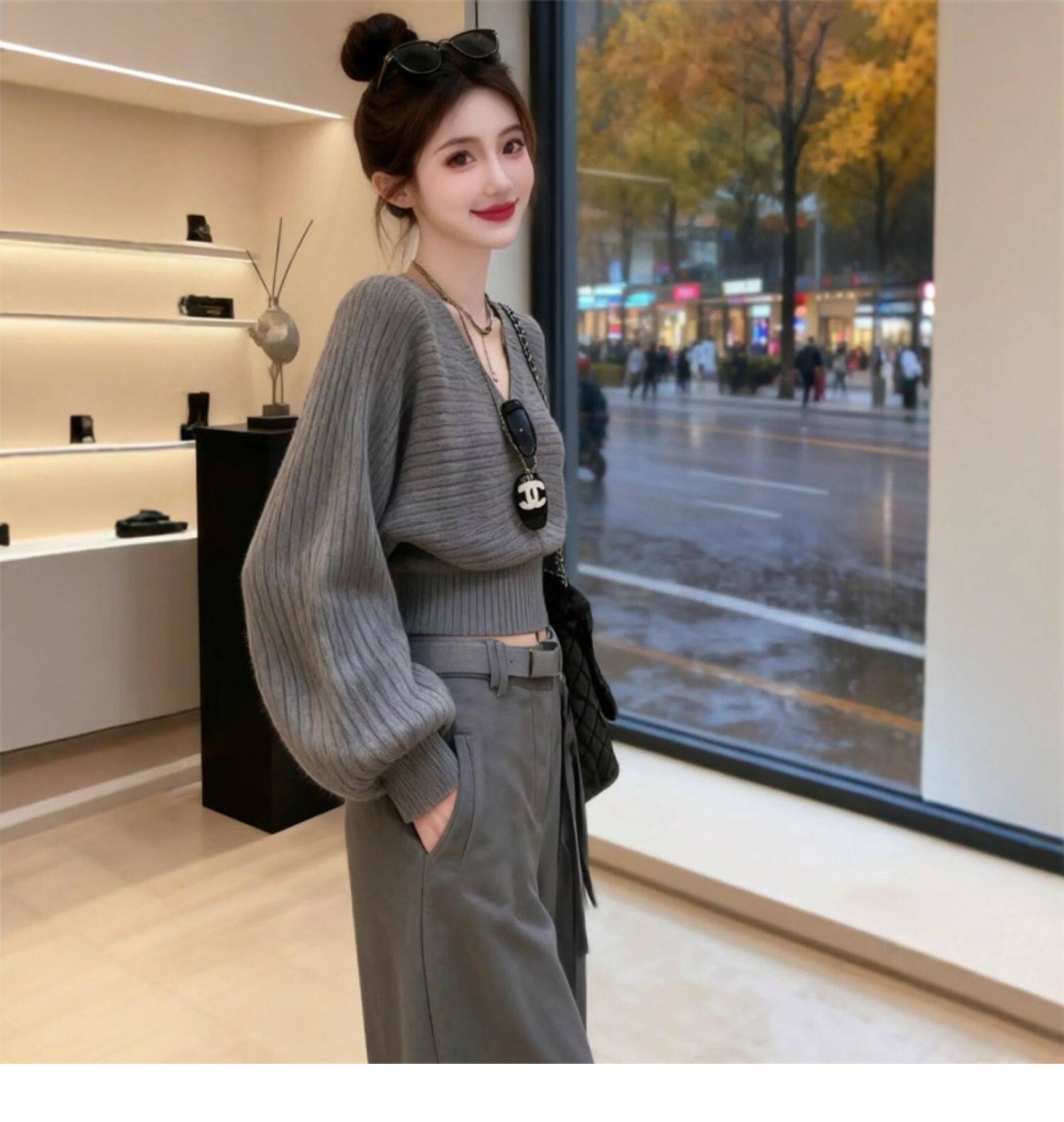 灰色V領收腰短款毛衣女春季高級感韓系慵懶顯瘦針織衫內搭小上衣