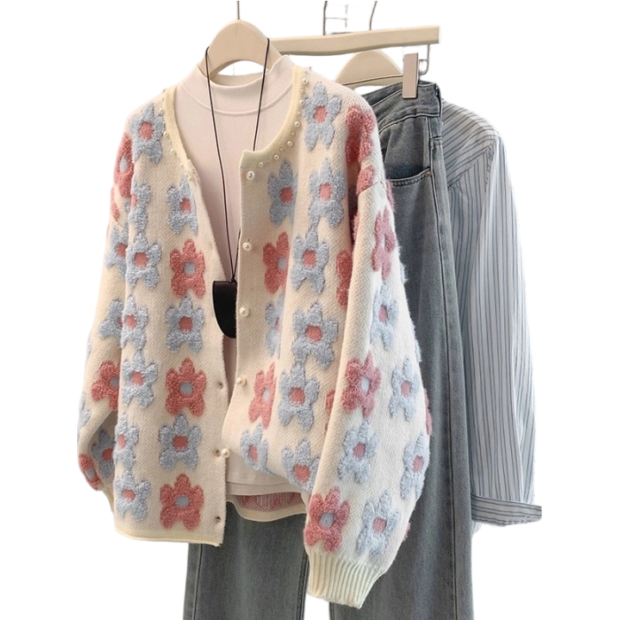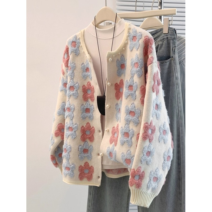 花朵刺綉正肩針織開衫女2026早春季新款大碼胖mm減齡奶乖毛衣外套