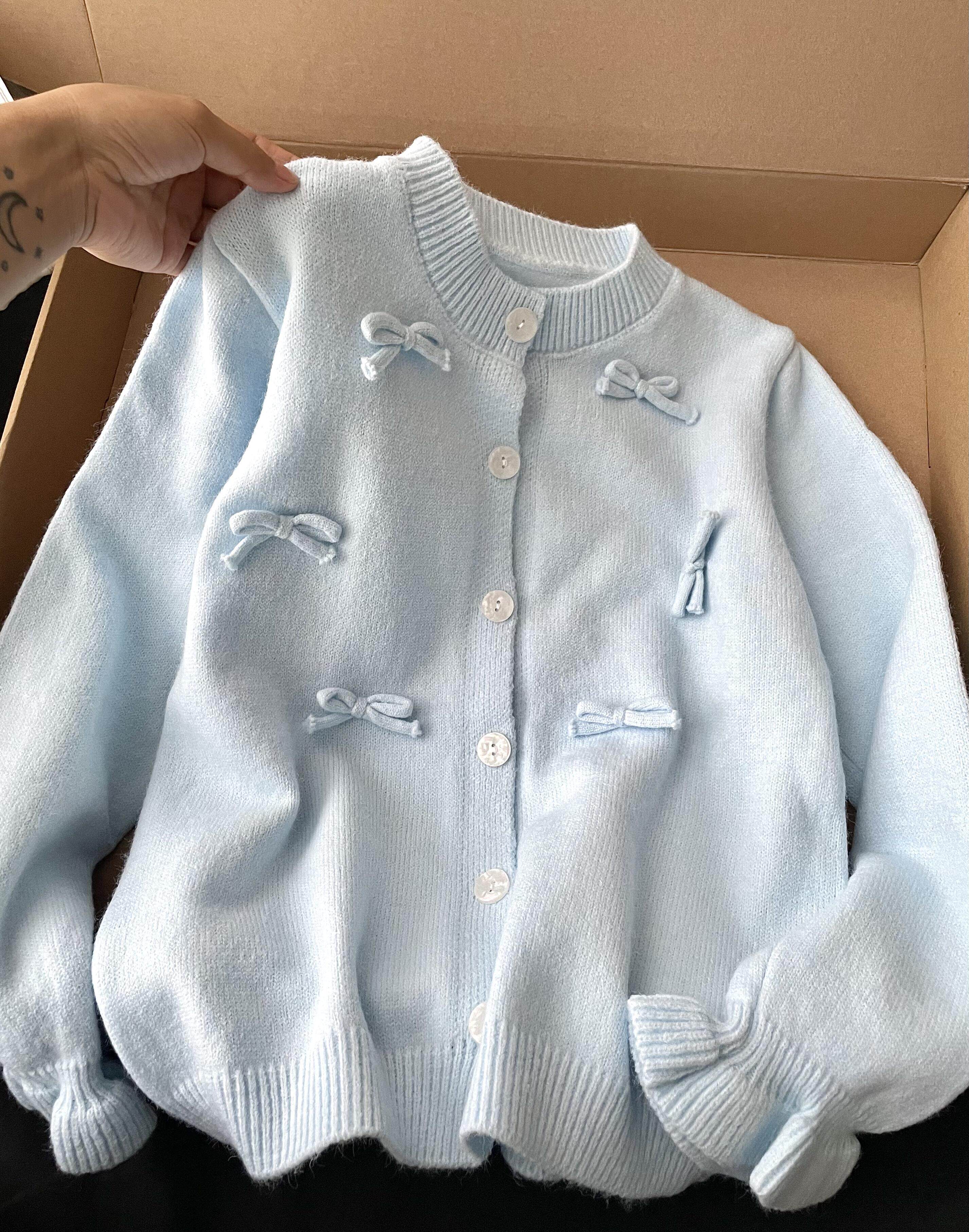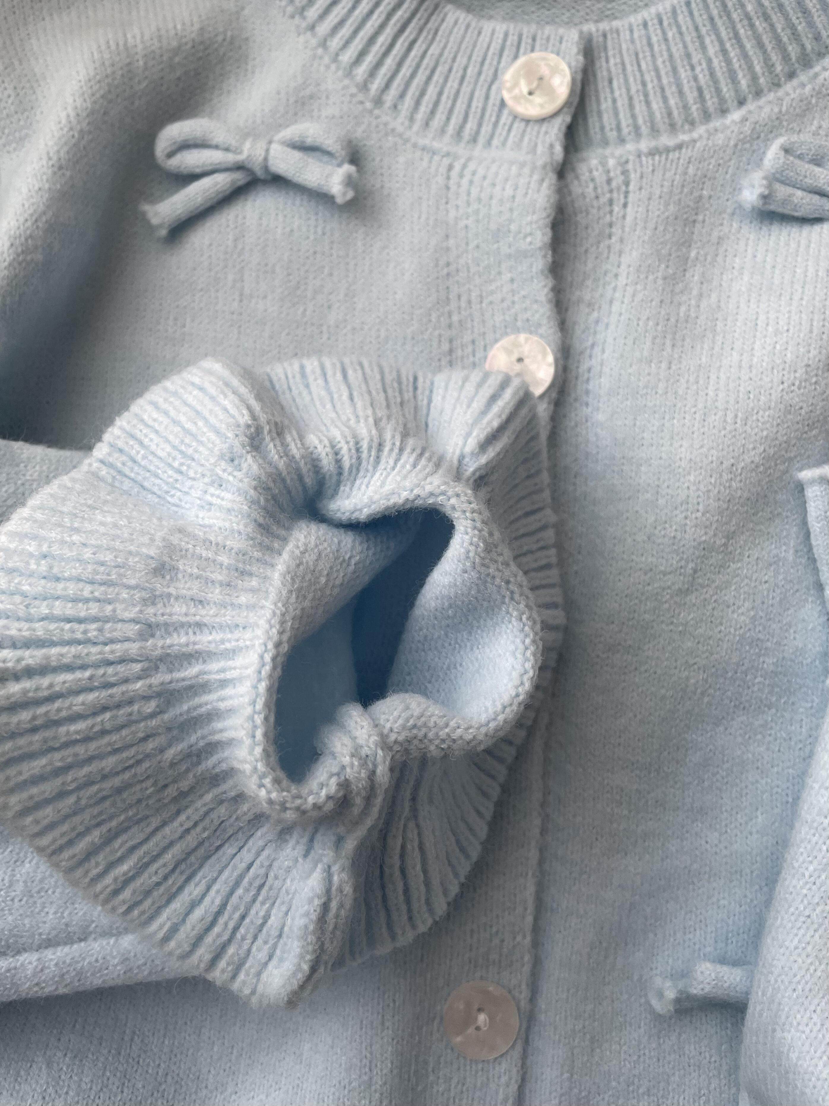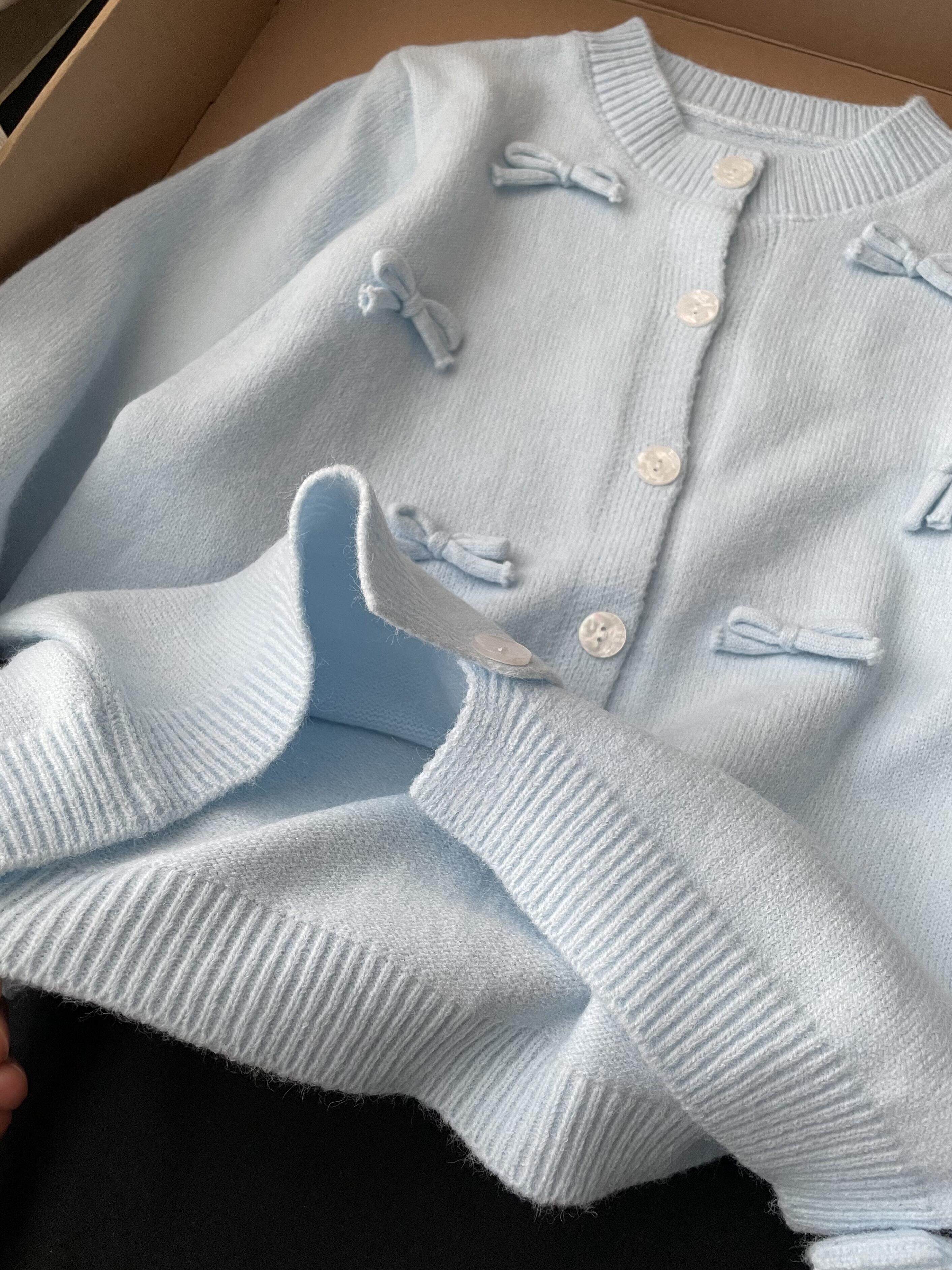 上身巨舒服!韓系baby藍色針織開衫秋冬寬松慵懶風蝴蝶結毛衣外套