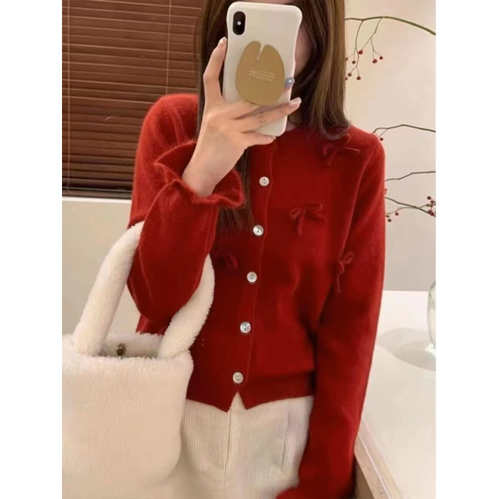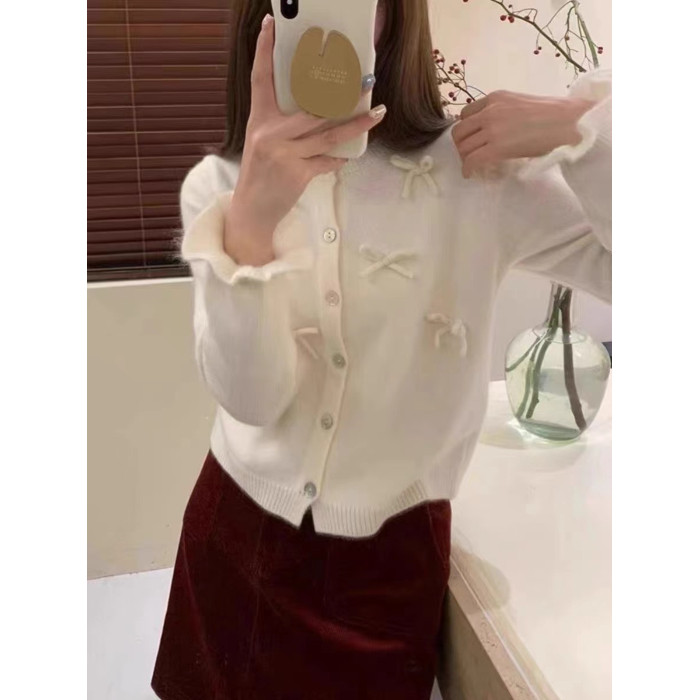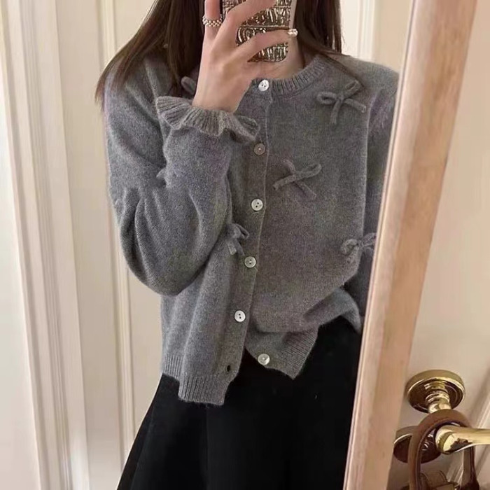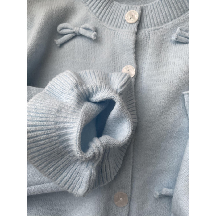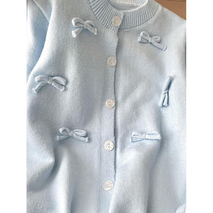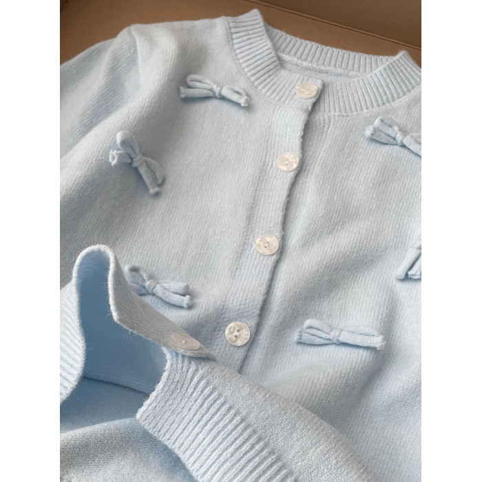 上身巨舒服!韓系baby藍色針織開衫秋冬寬松慵懶風蝴蝶結毛衣外套