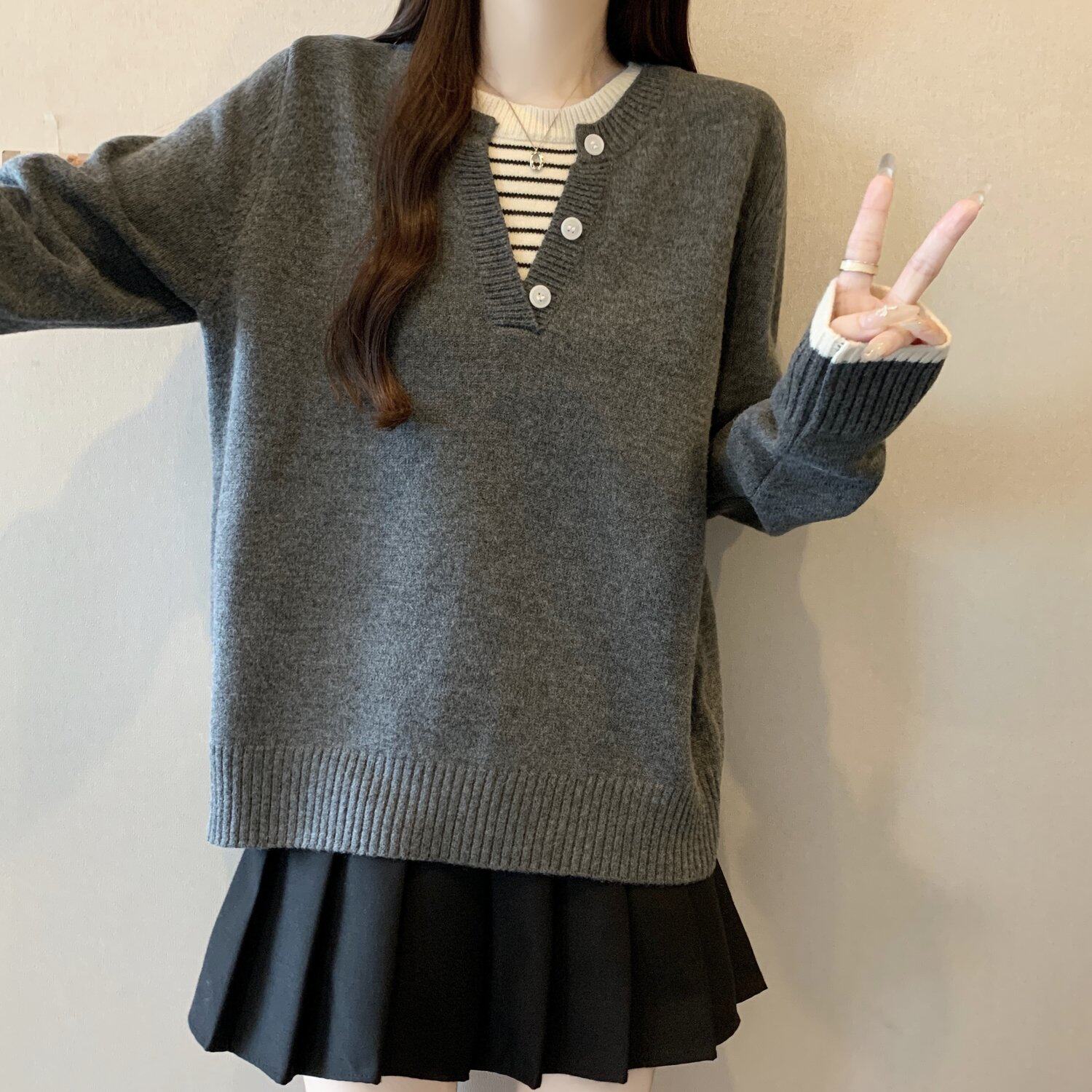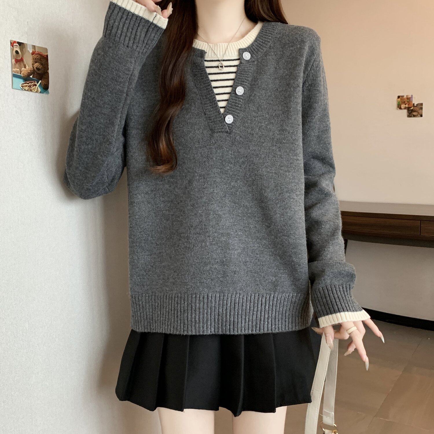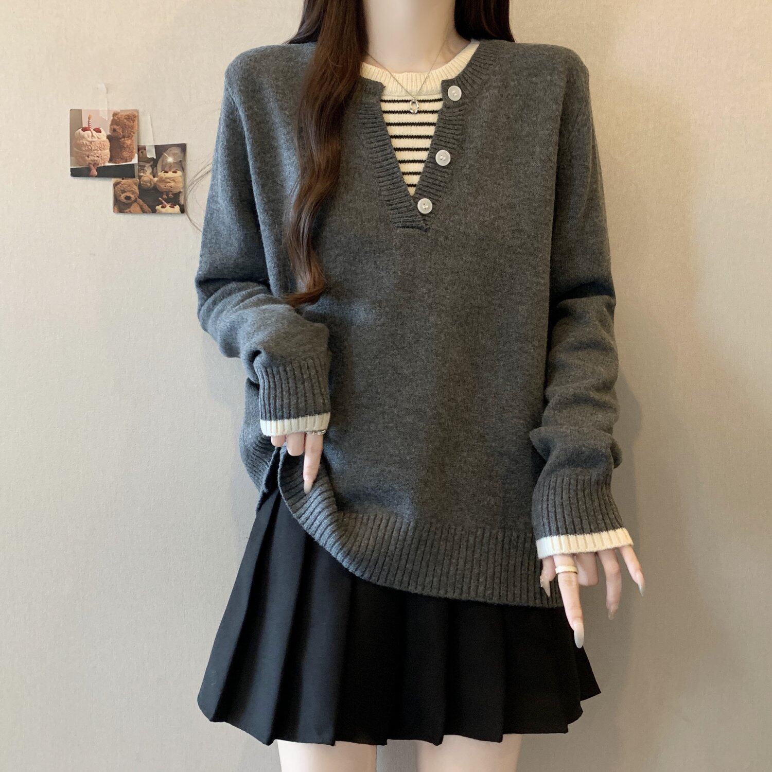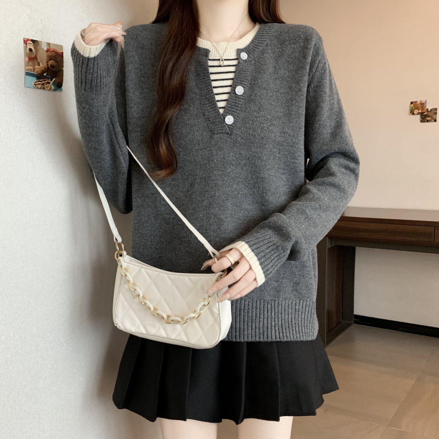 秋冬2025新款假兩件灰色長袖針織衫大碼女裝胖mm寬松顯瘦毛衣上衣