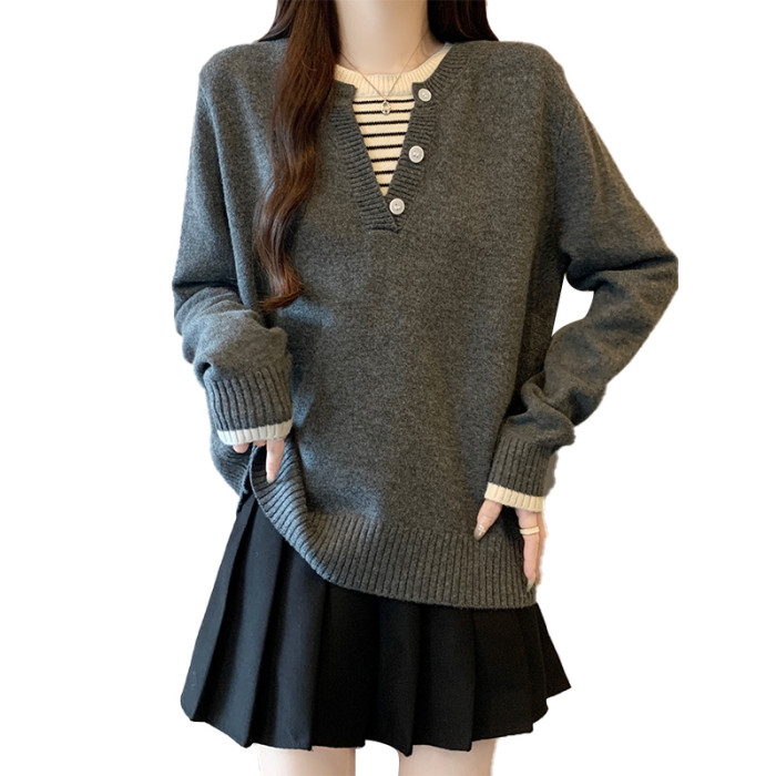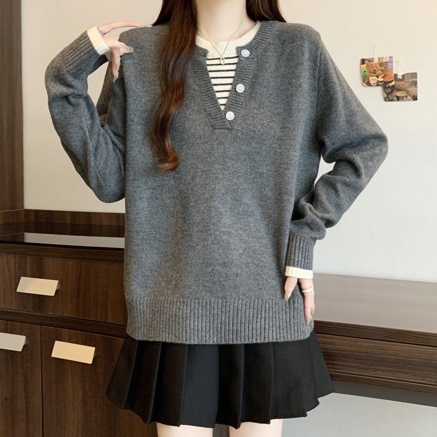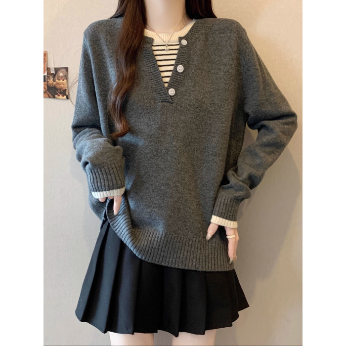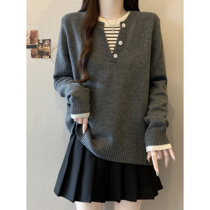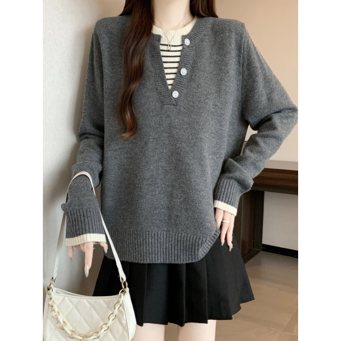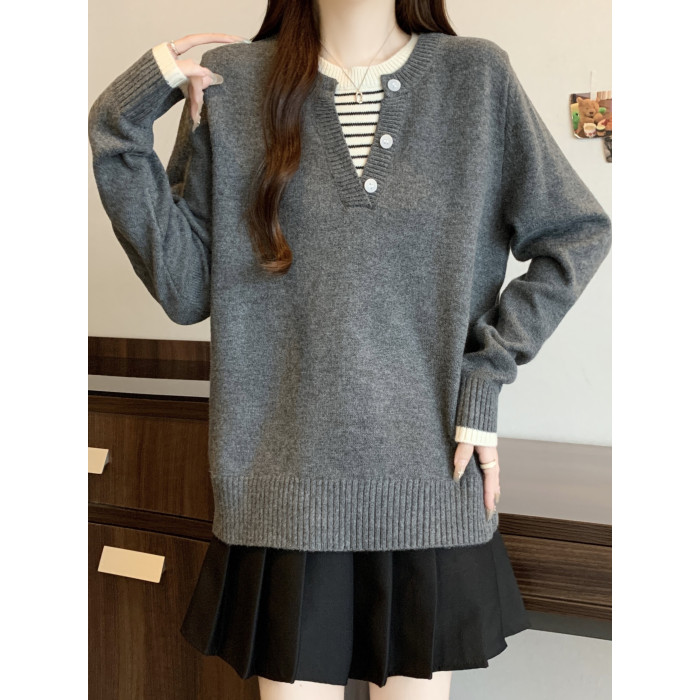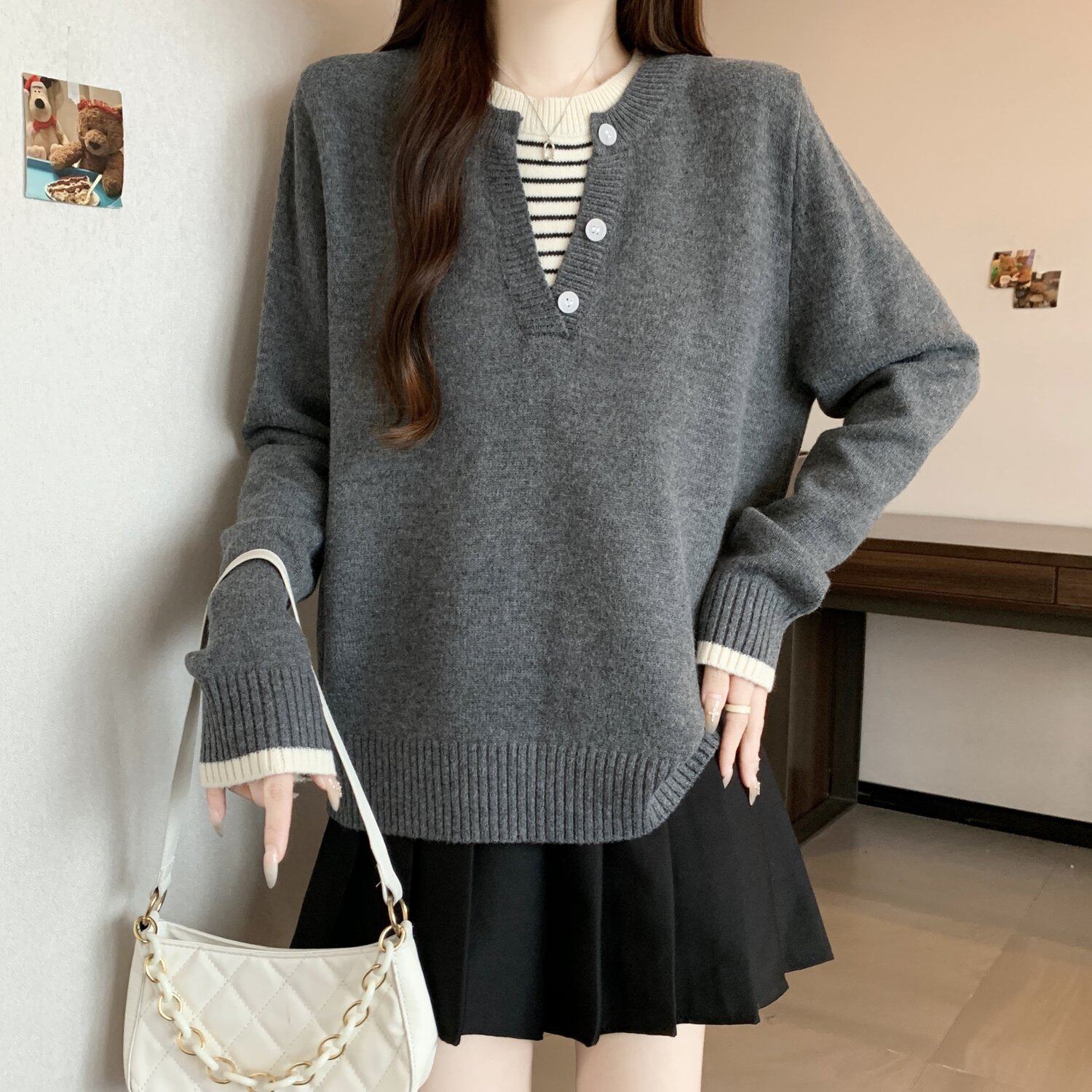 秋冬2025新款假兩件灰色長袖針織衫大碼女裝胖mm寬松顯瘦毛衣上衣