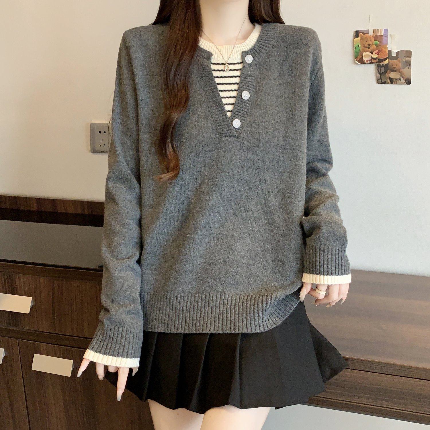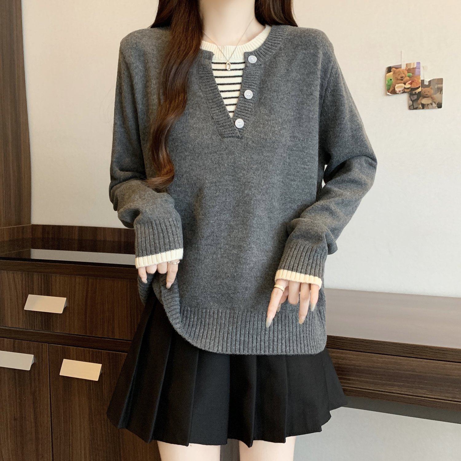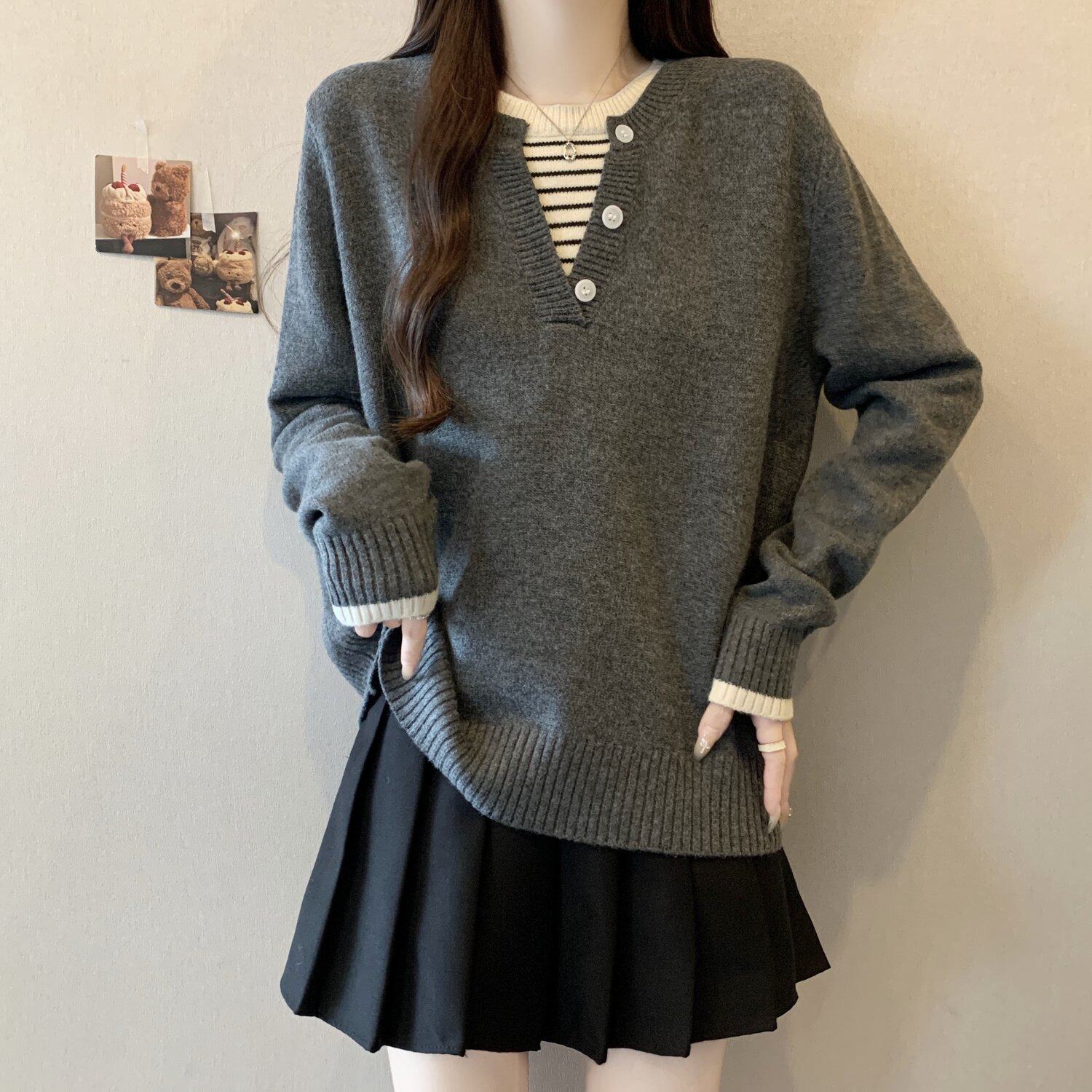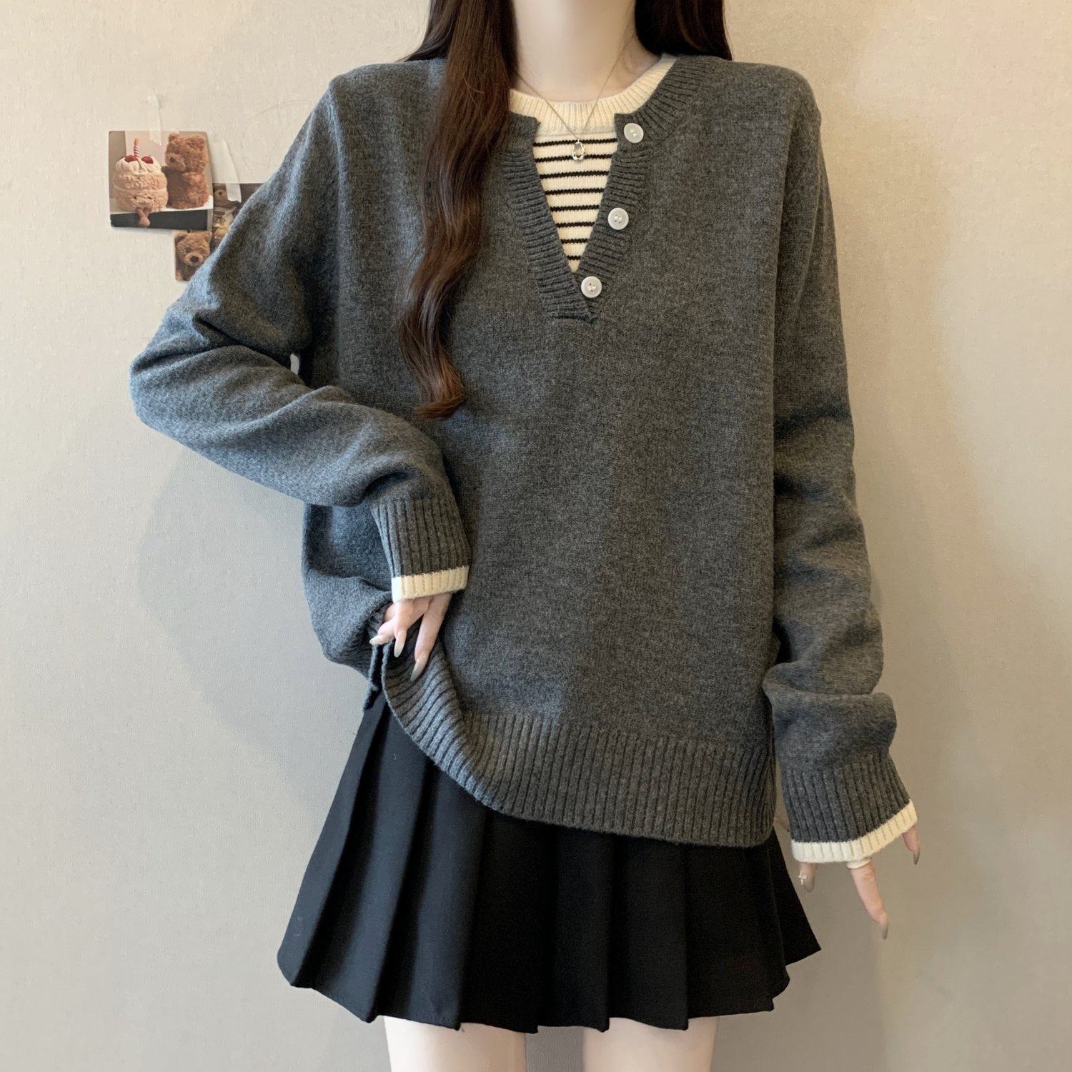 秋冬2025新款假兩件灰色長袖針織衫大碼女裝胖mm寬松顯瘦毛衣上衣