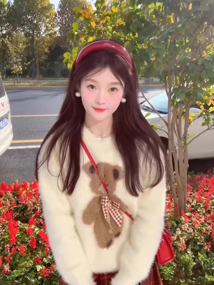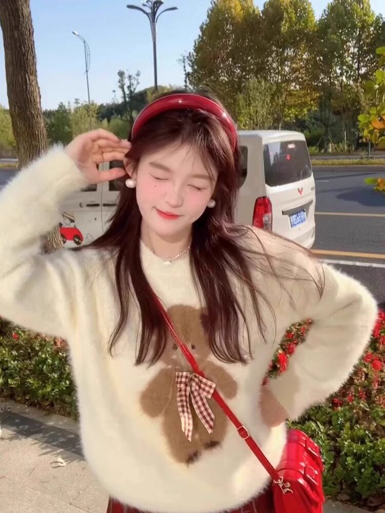 甜美軟糯馬海毛小熊圓領毛衣女套頭加厚小個子內搭針織衫秋冬上衣