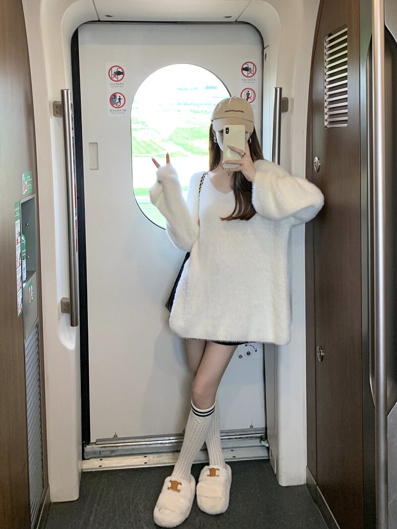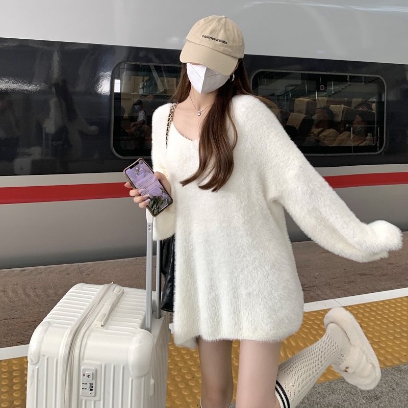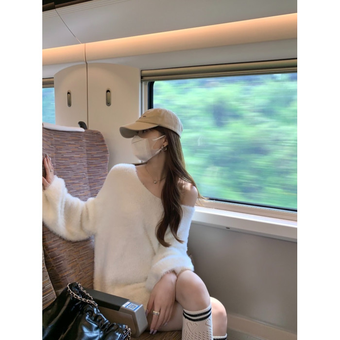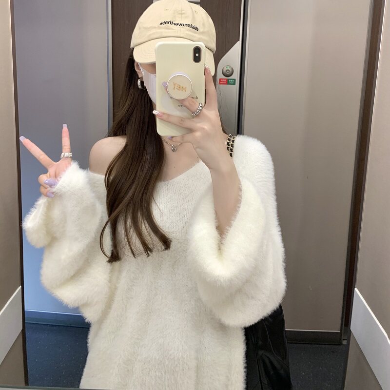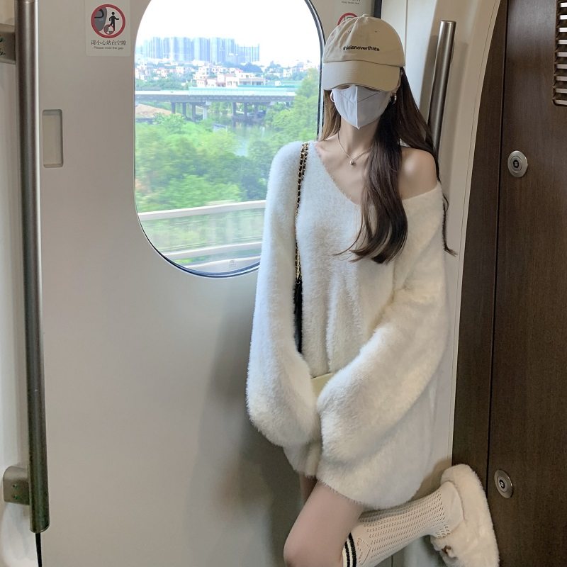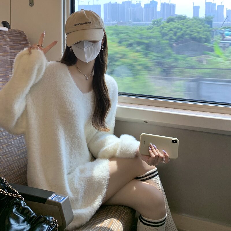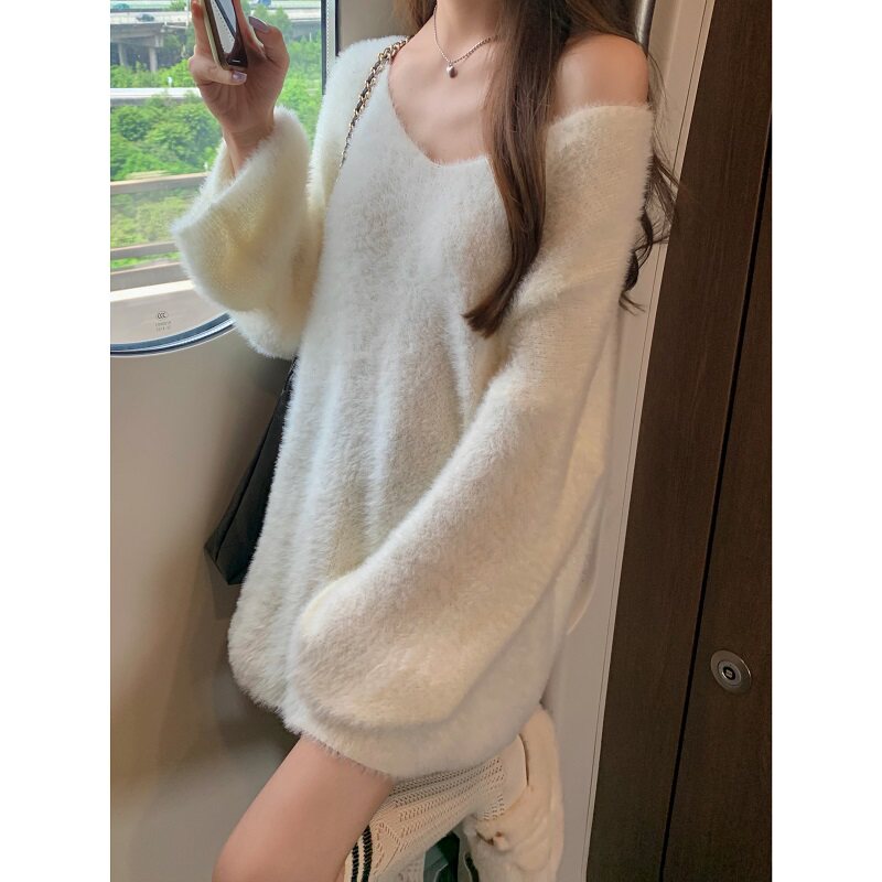 PPHOME溫柔風軟糯仿貂毛V領毛衣女秋季純欲寬松慵懶風針織衫上衣