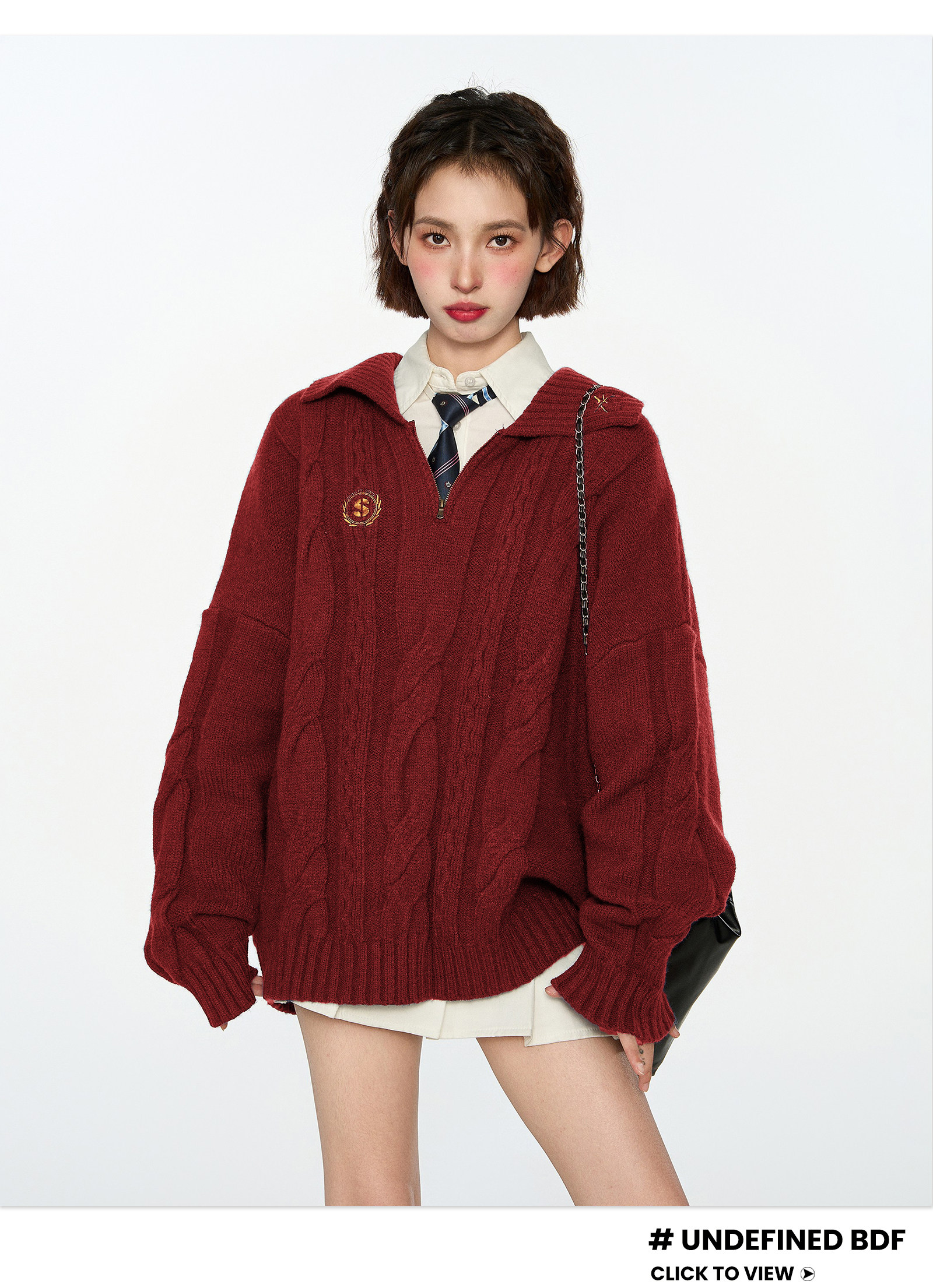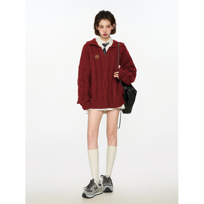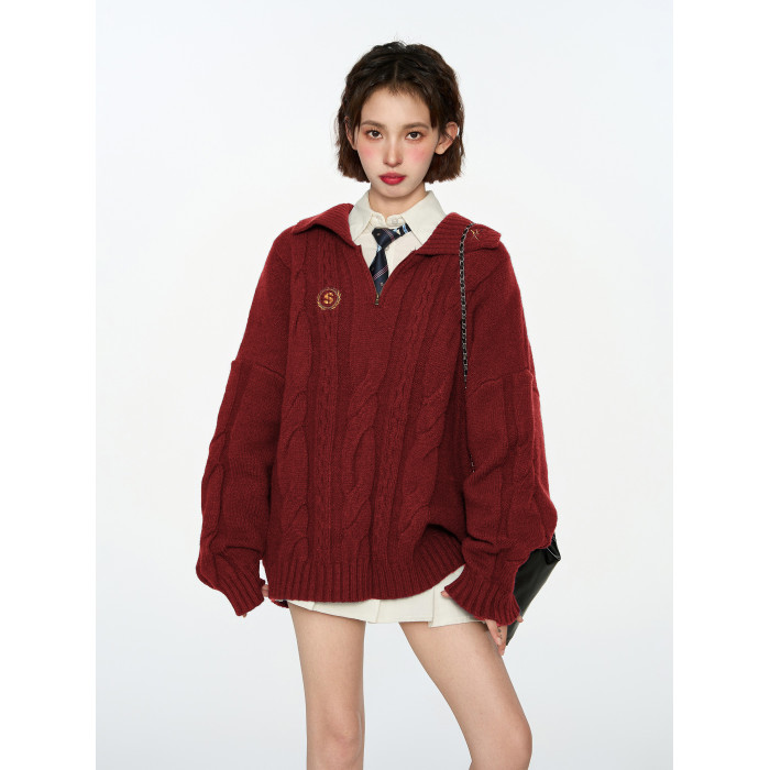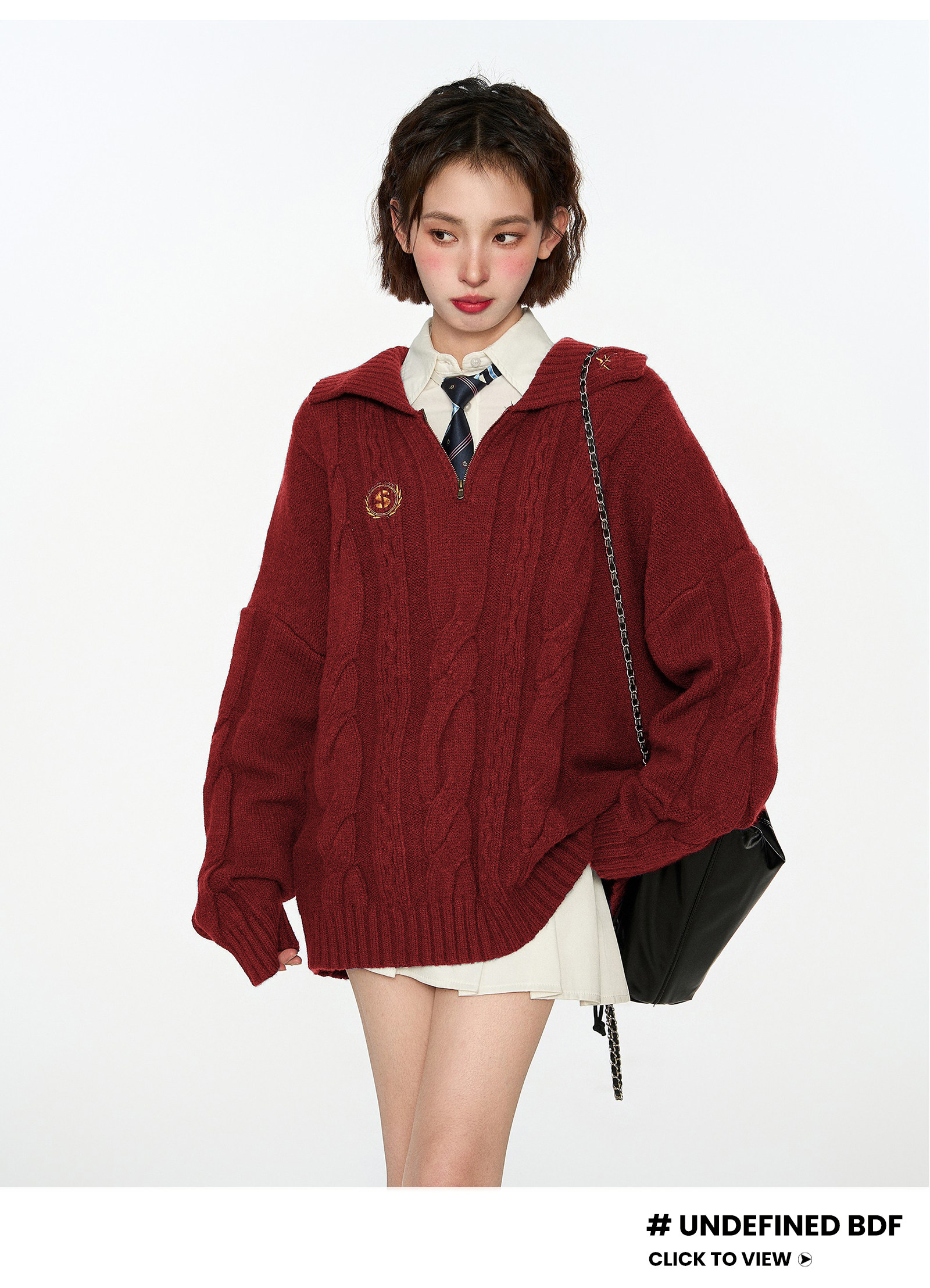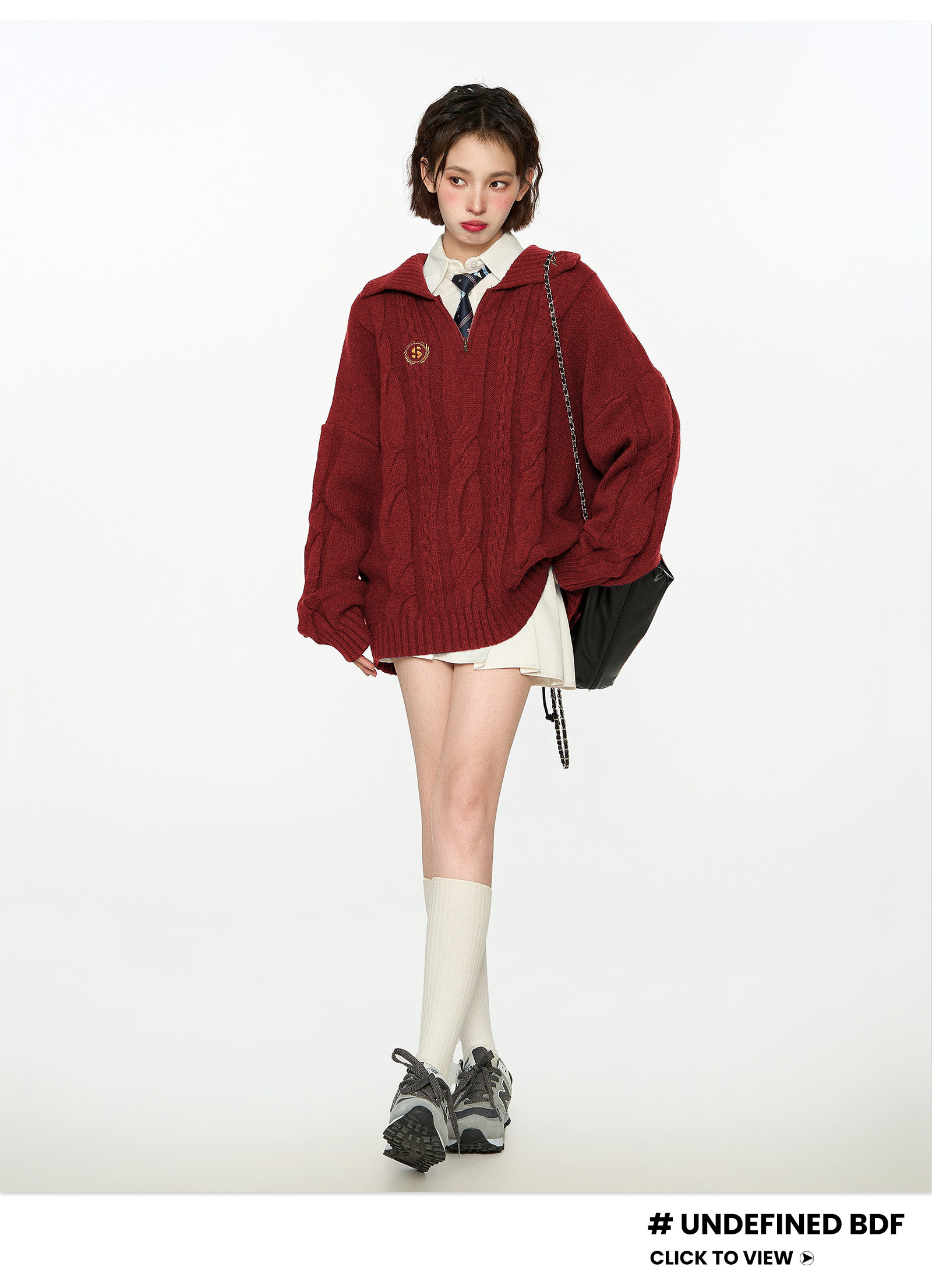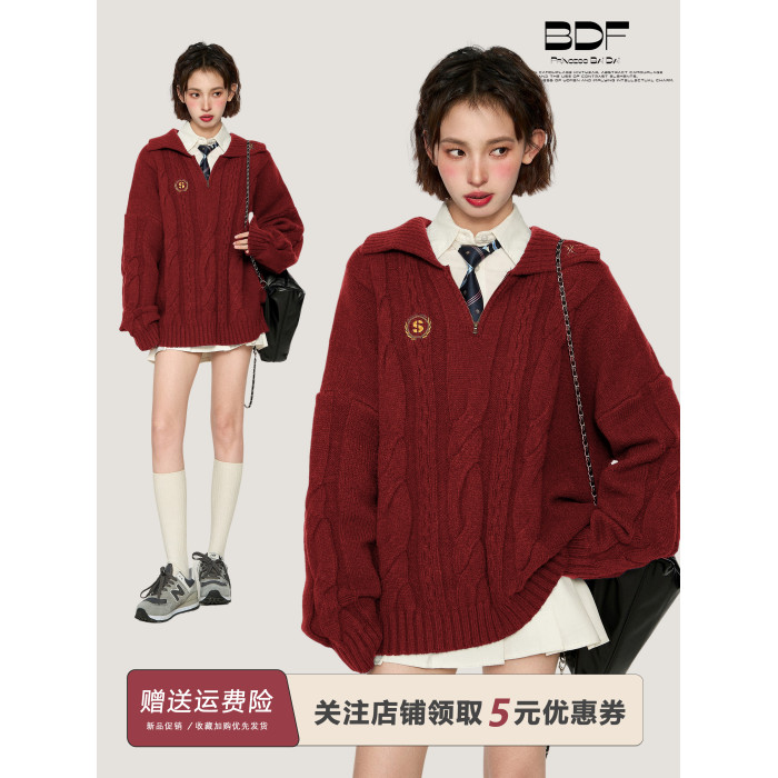 聖誕紅色polo翻領針織毛衣女秋冬季v領加厚過年本命年學院風上衣