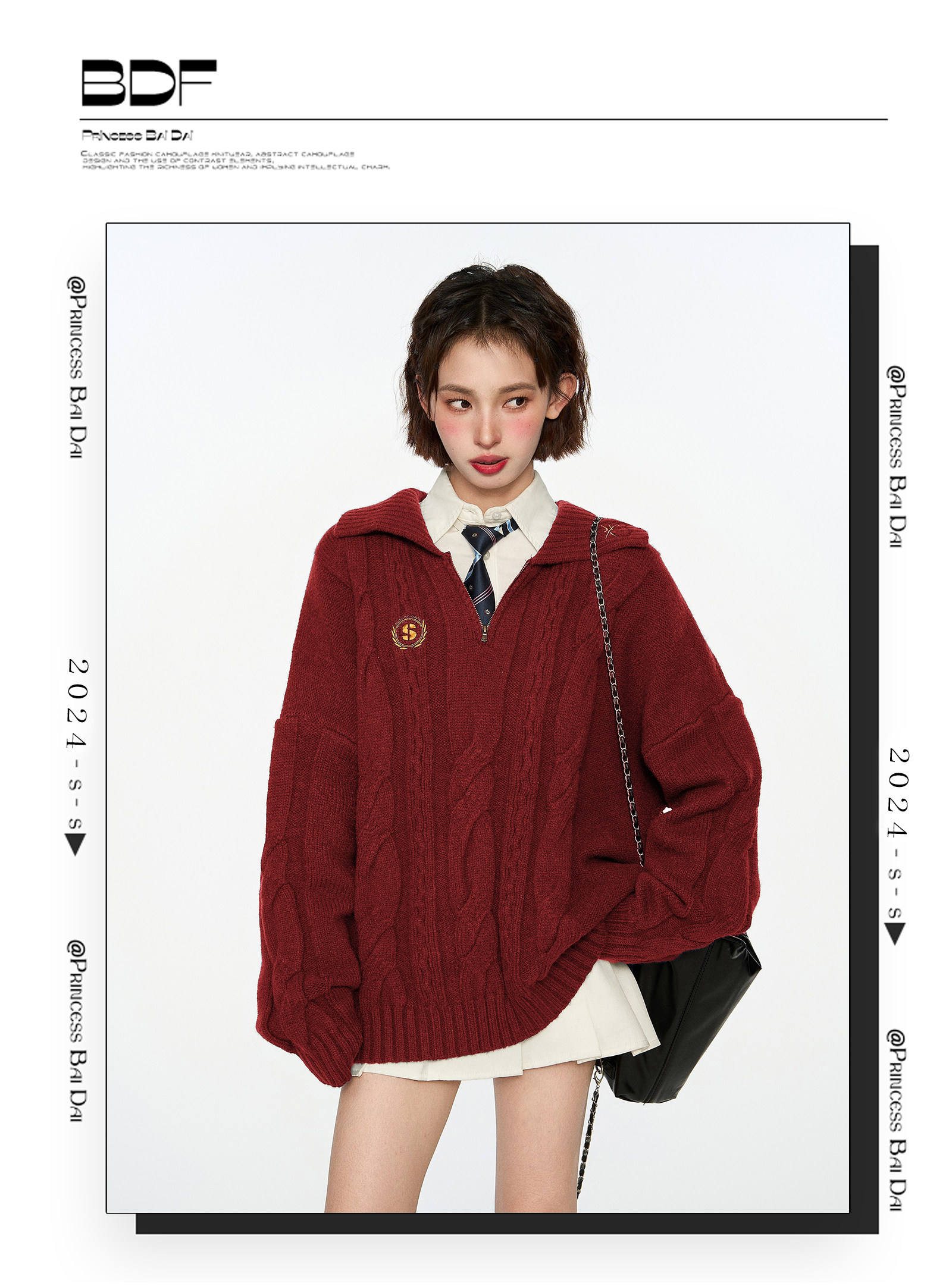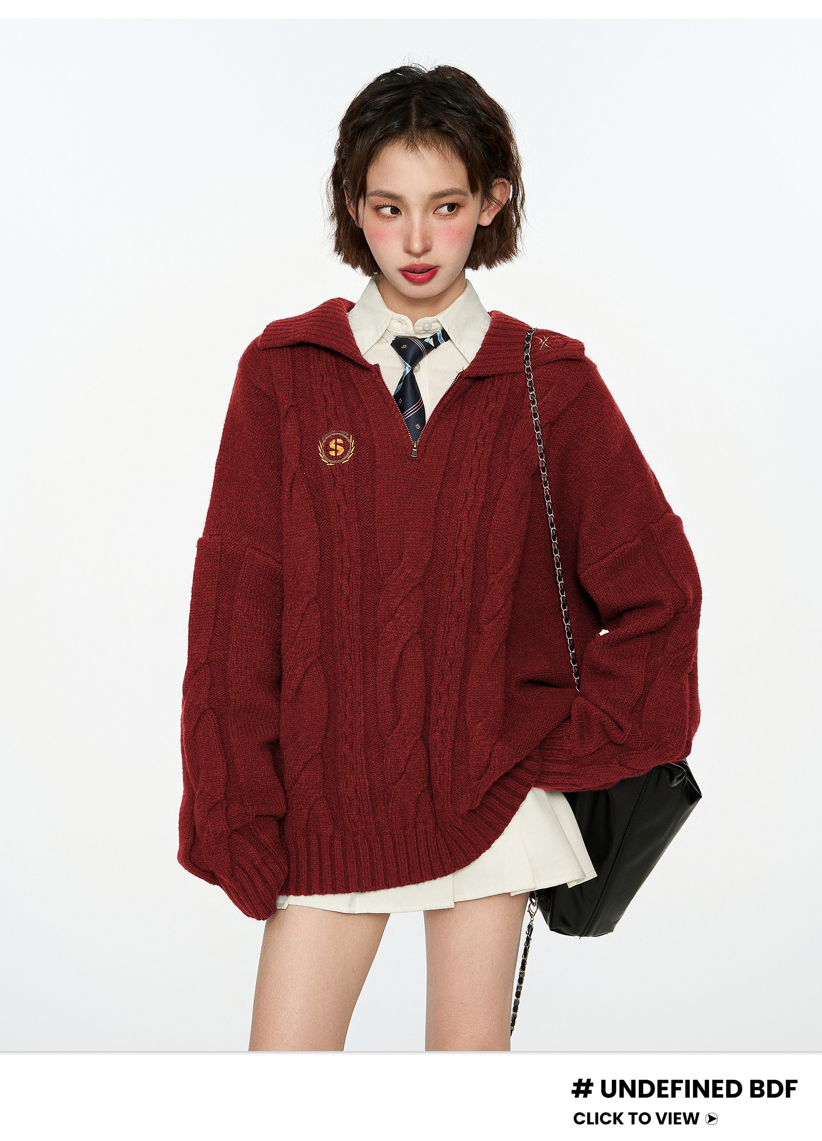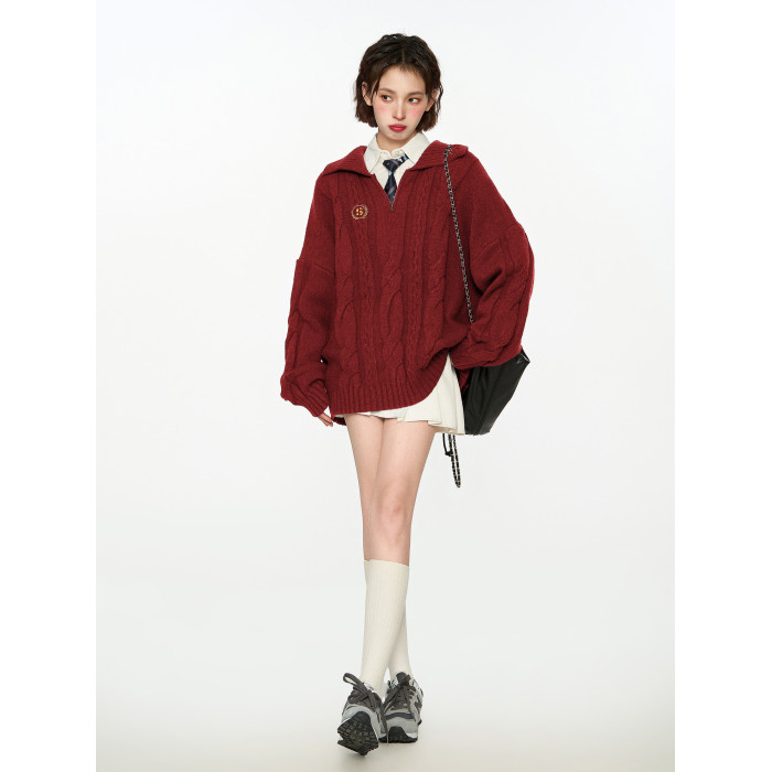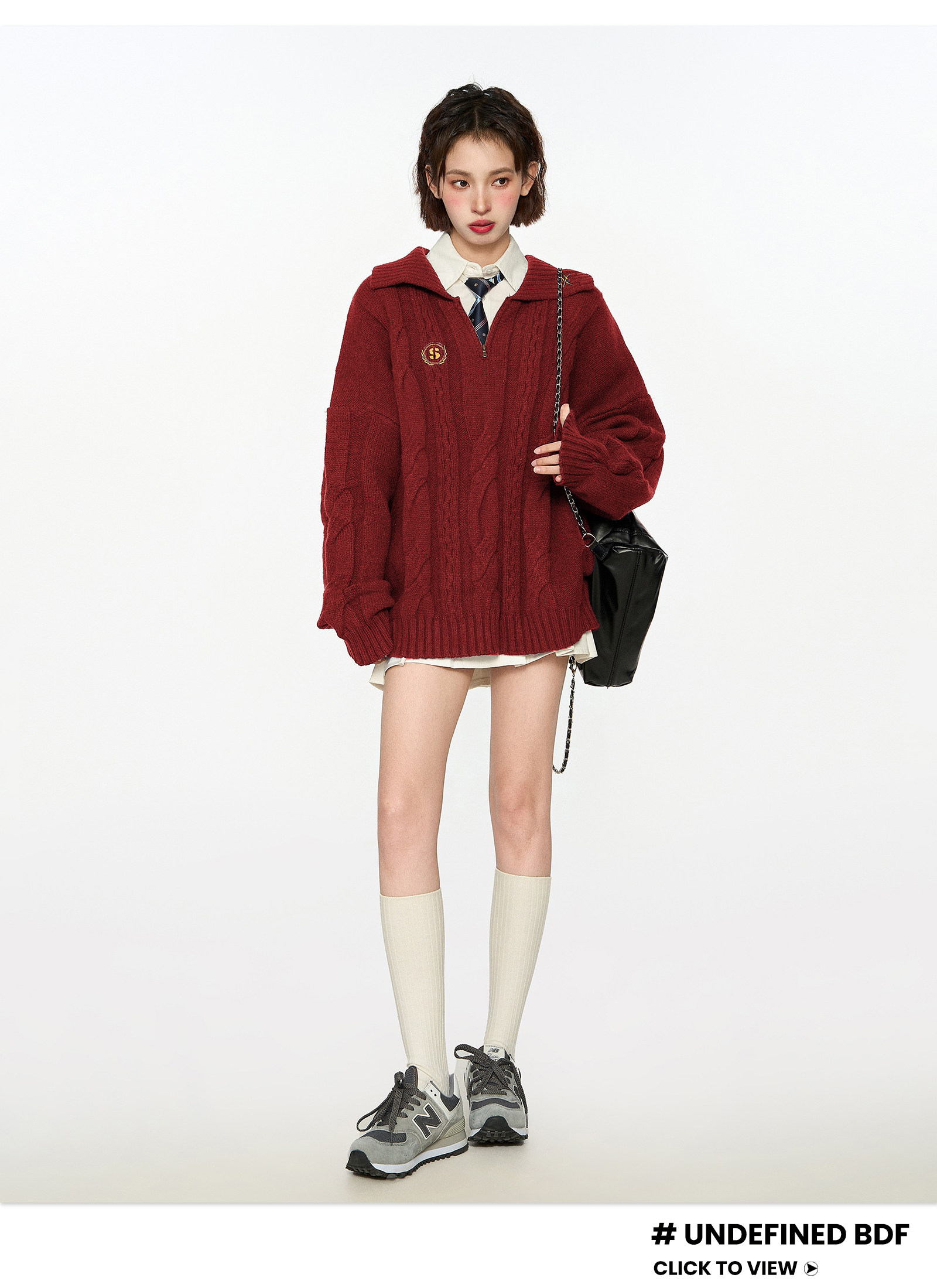 聖誕紅色polo翻領針織毛衣女秋冬季v領加厚過年本命年學院風上衣