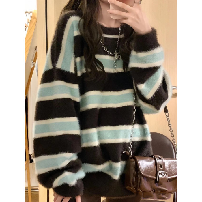 軟糯溫柔條紋慵懶風秋冬新款毛衣女寬松復古仿水貂絨甜辣針織衫厚