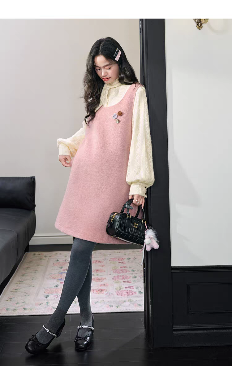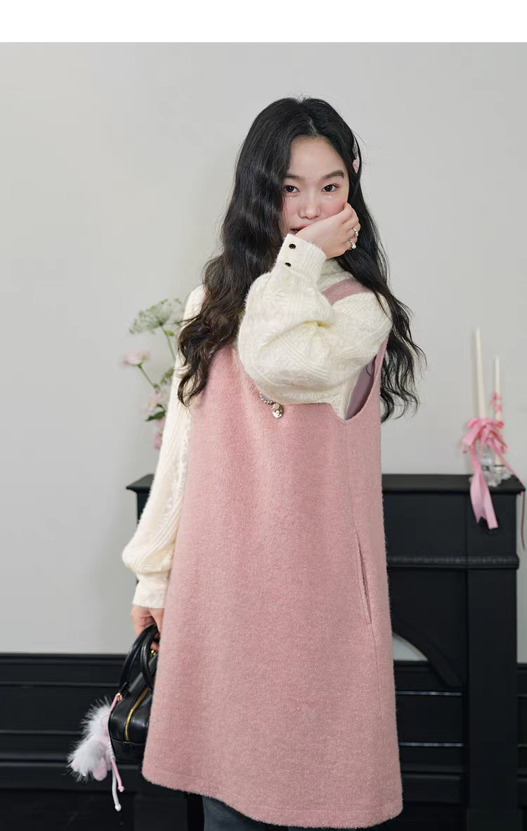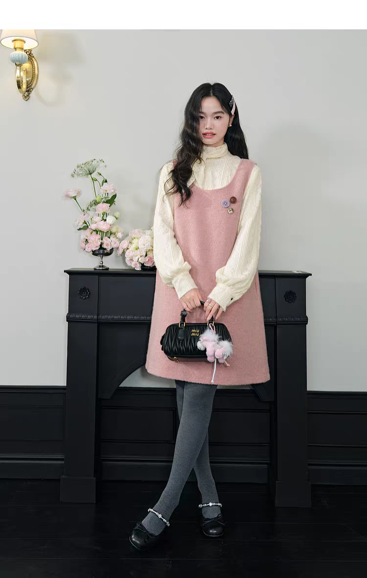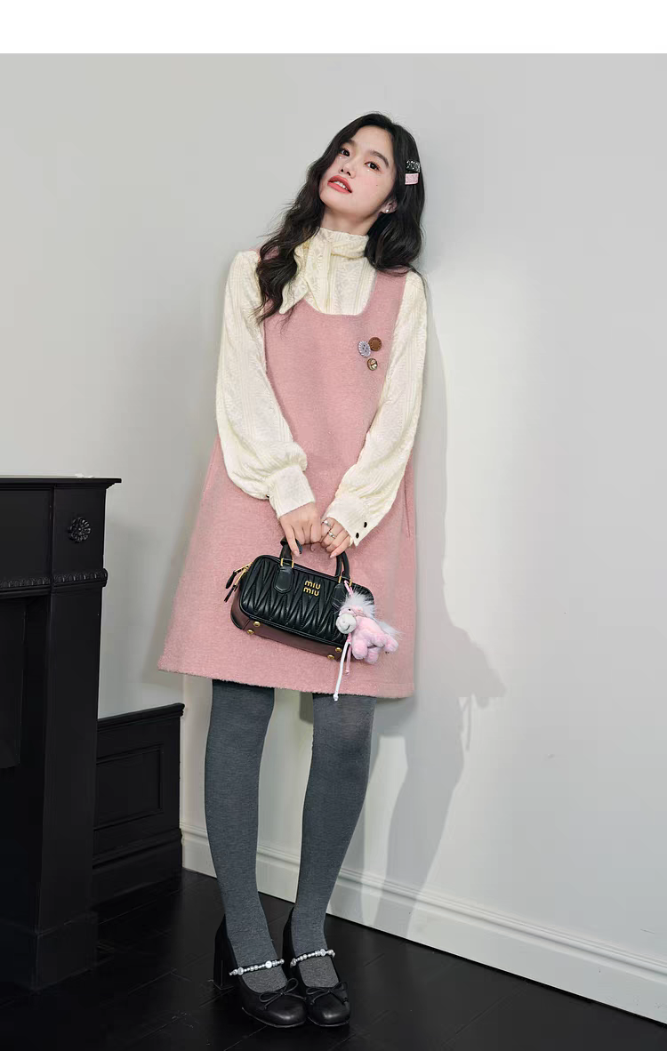 粉色新年氛圍感穿搭背心裙短裙女2026秋冬季新款外塔毛呢連衣裙子