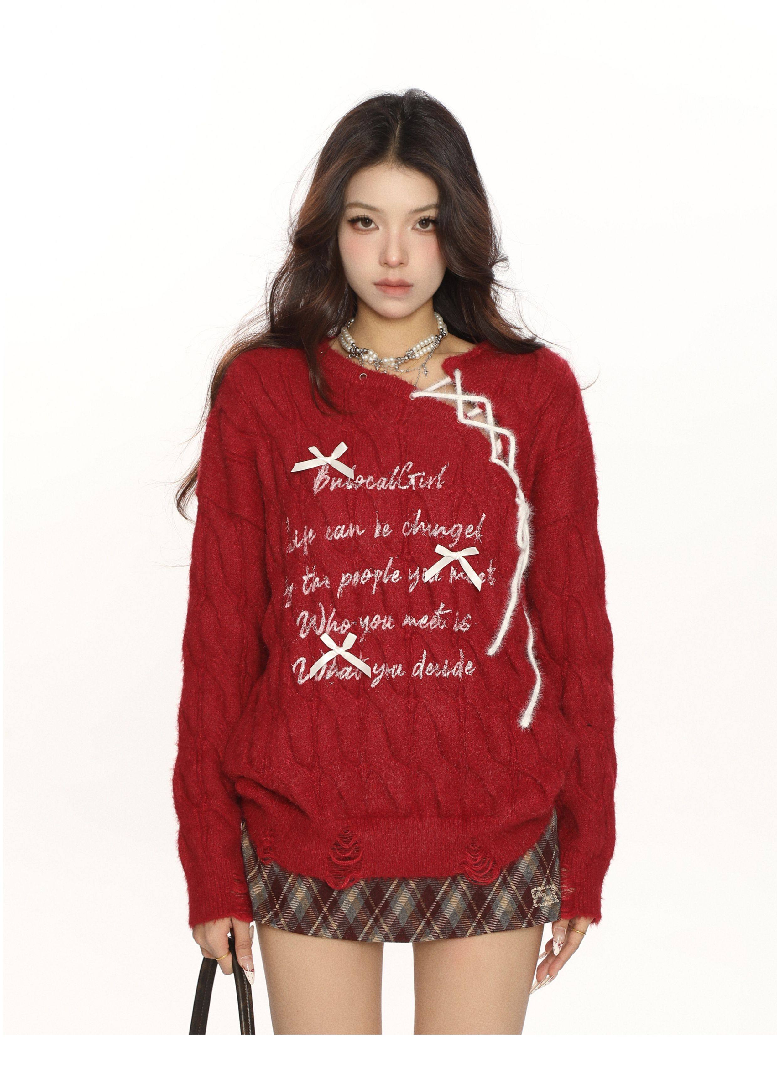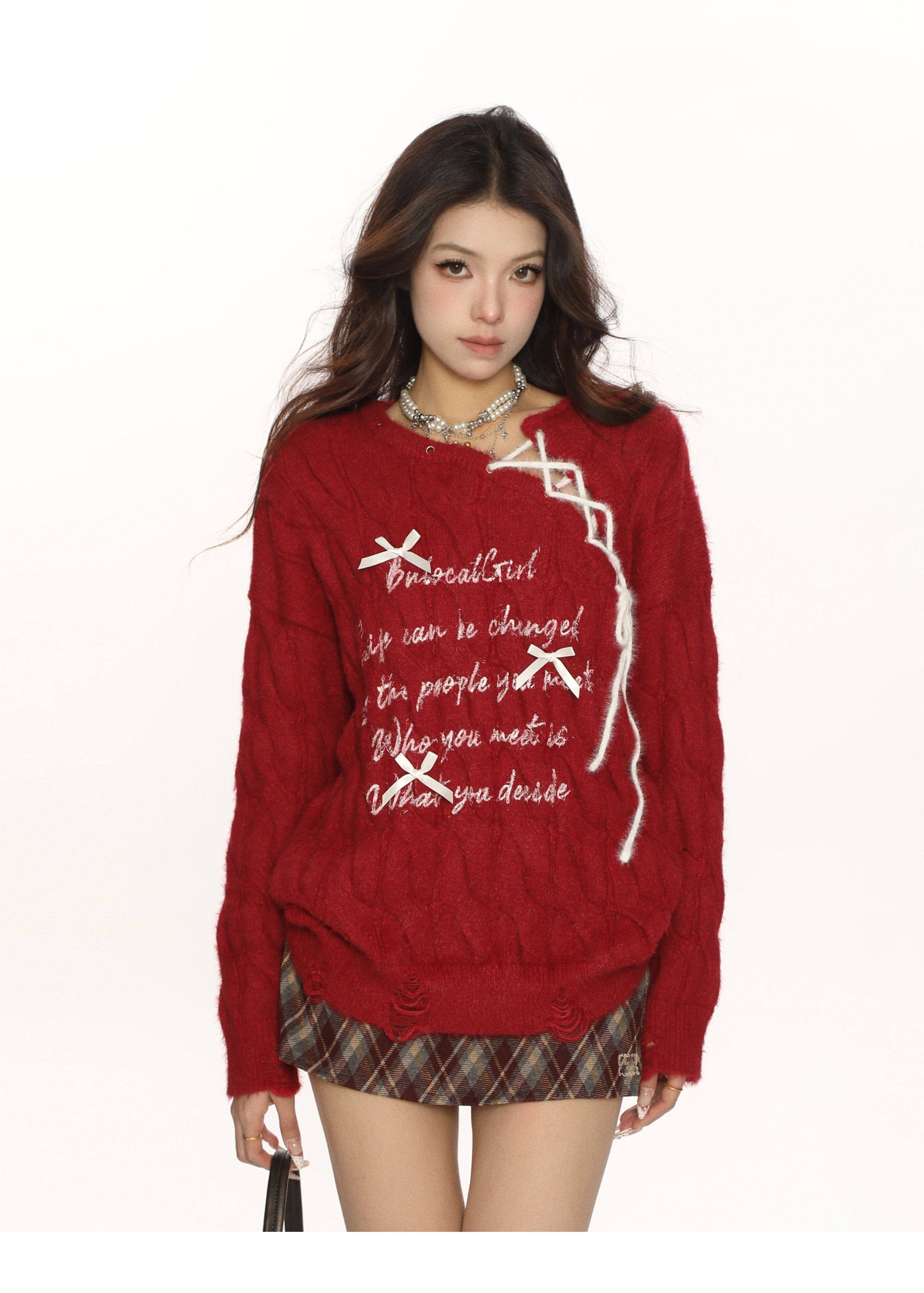 BIGGOLD紅色新年戰袍蝴蝶結綁帶毛衣女秋冬慵嬾風軟糯針織衫上衣
