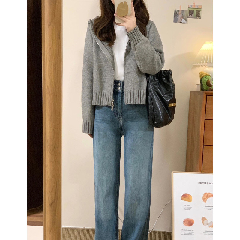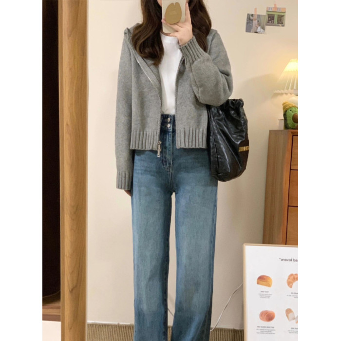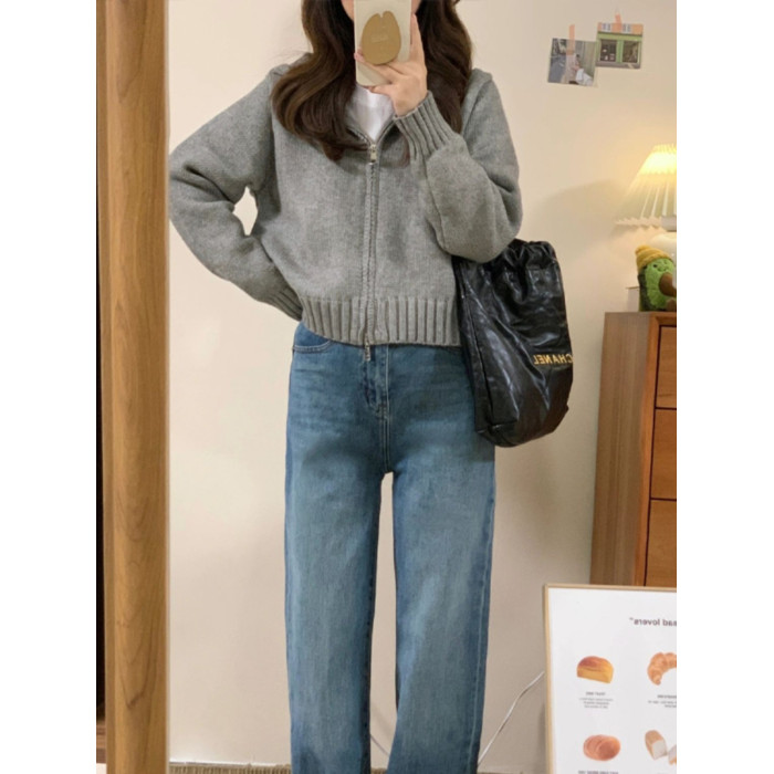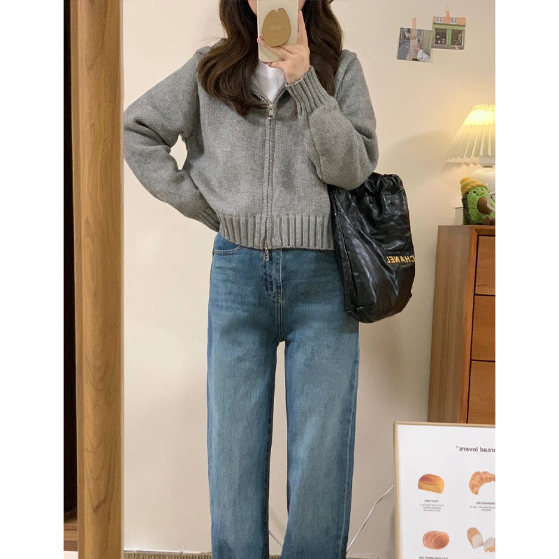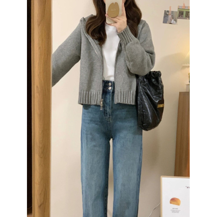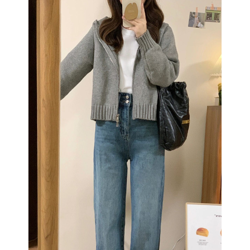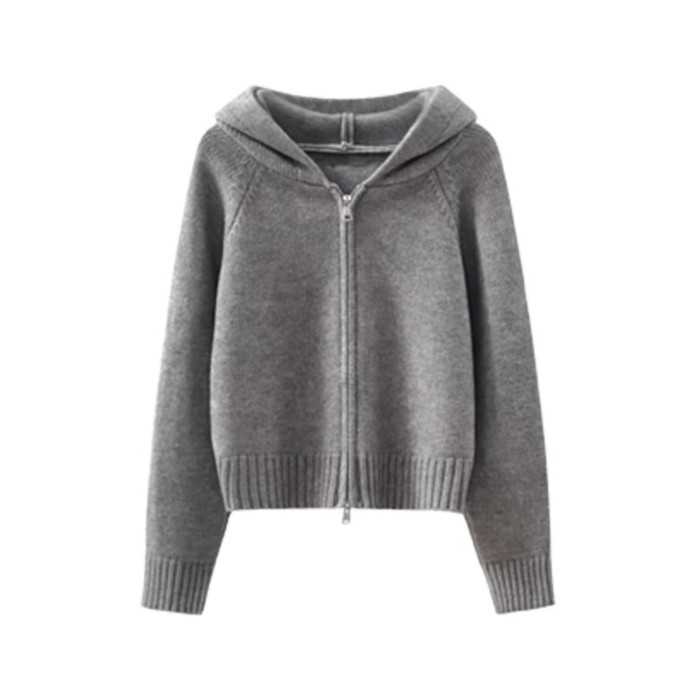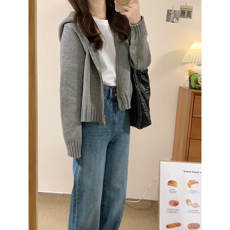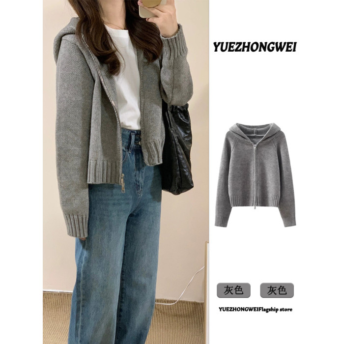 灰色拉鍊連帽毛衣開衫外套女款2025新款秋冬季慵嬾風短款針織上衣