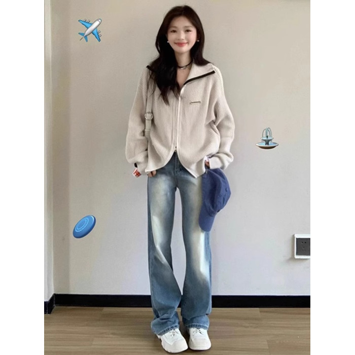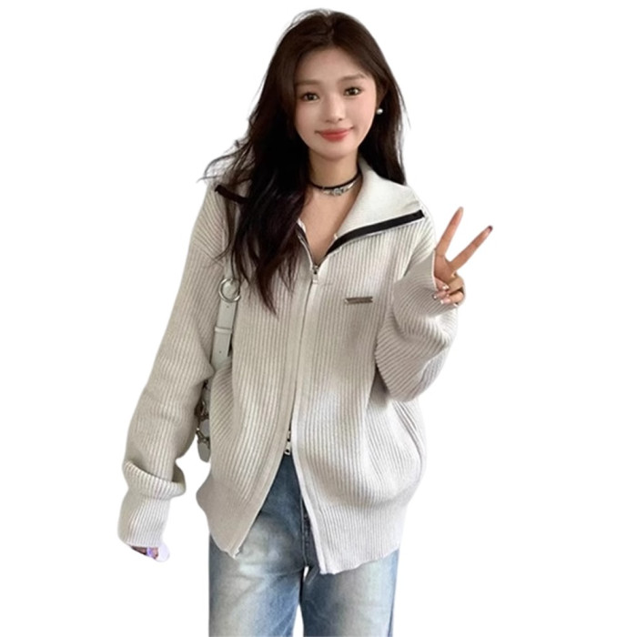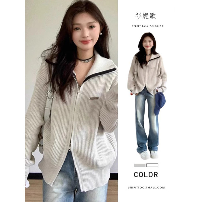 灰色毛衣針織開衫早秋2025女拉鍊外套外搭長袖上衣女設計感慵懶風