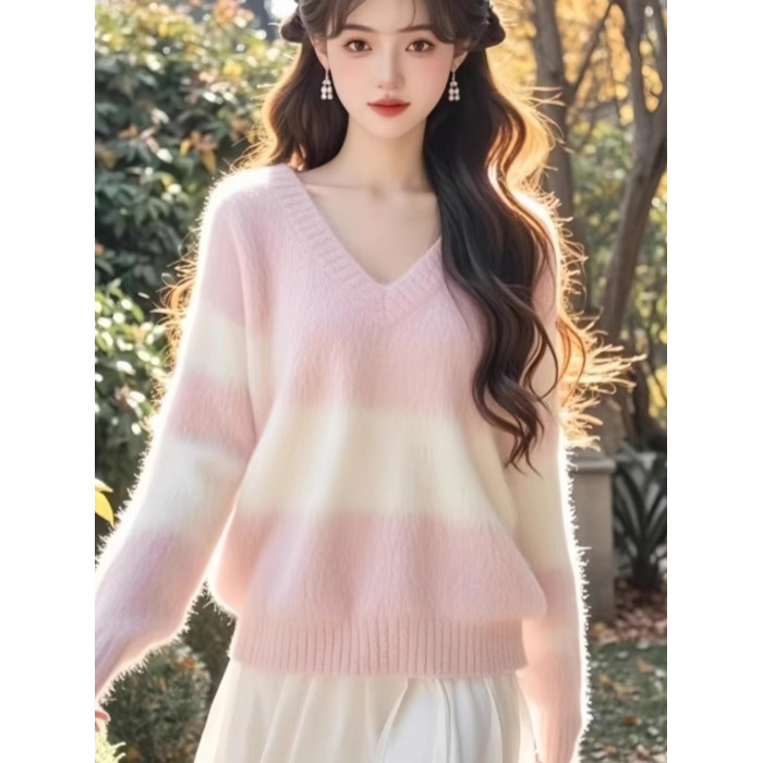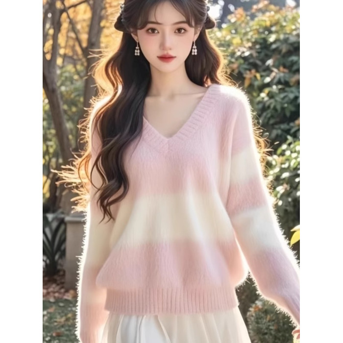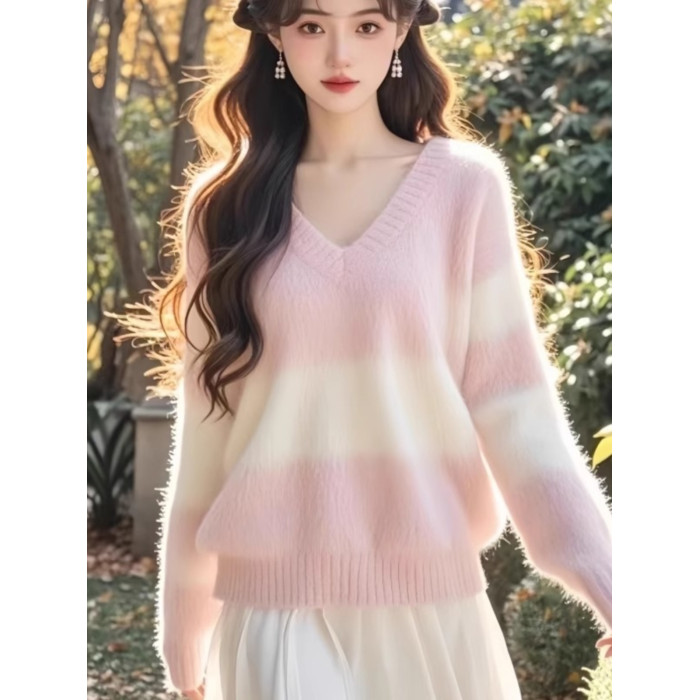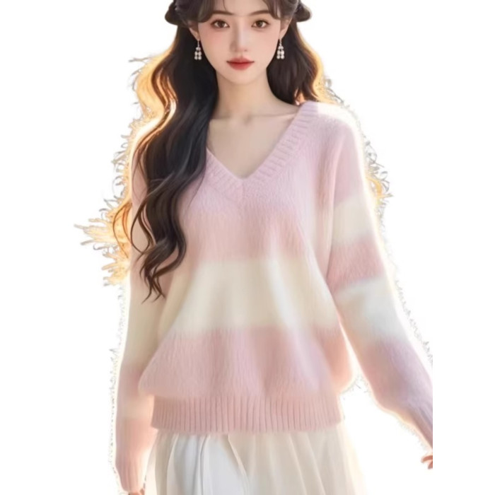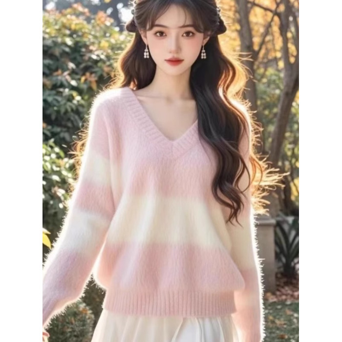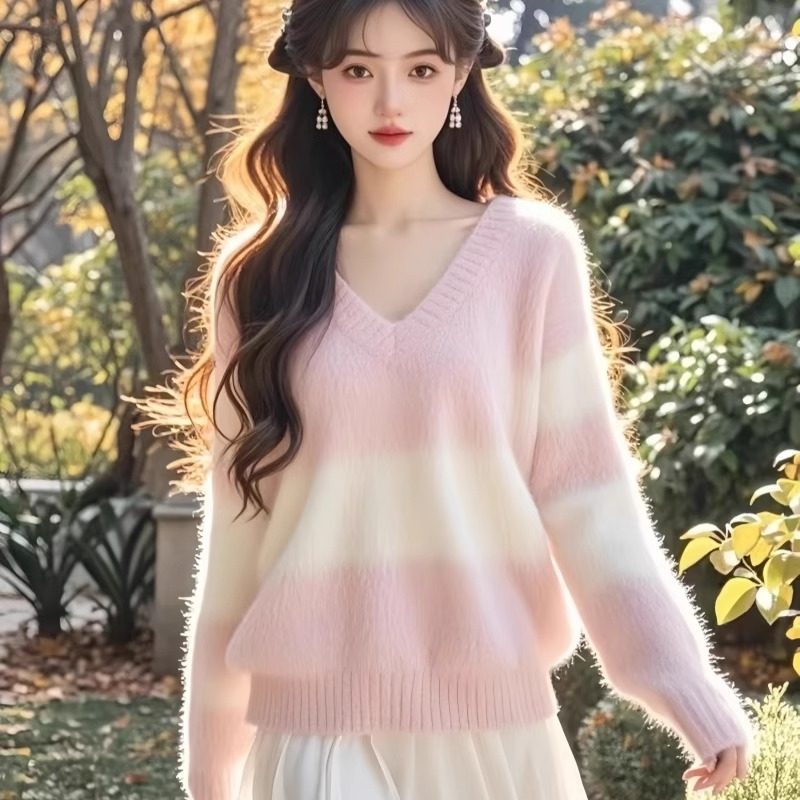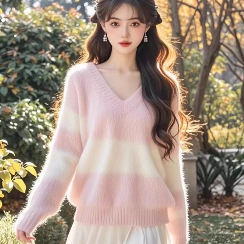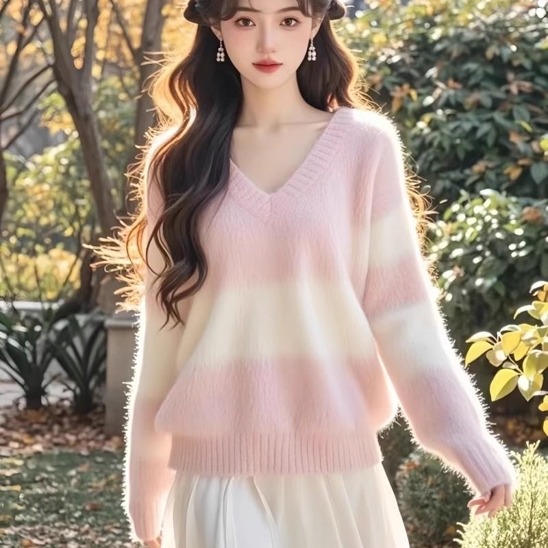馬海毛軟糯粉色v領毛衣女秋冬大碼胖mm溫柔風內搭針織衫長袖上衣