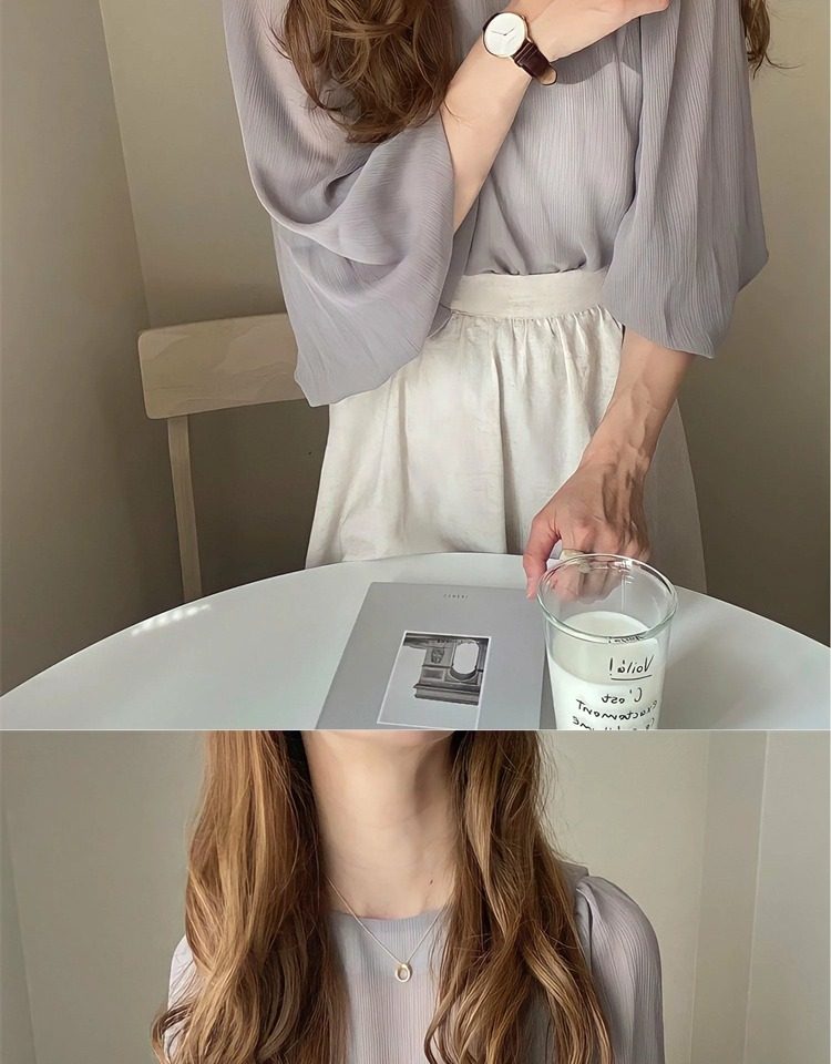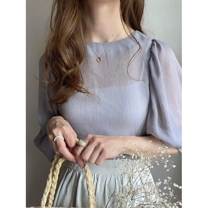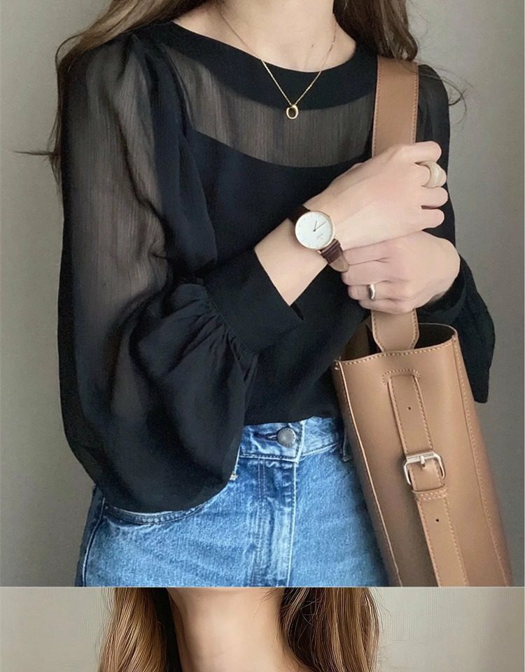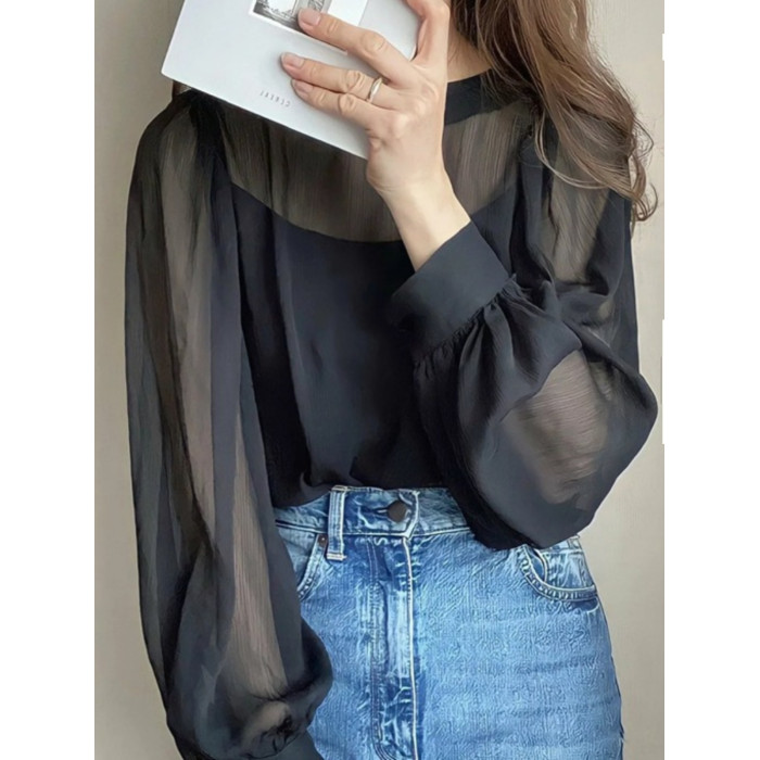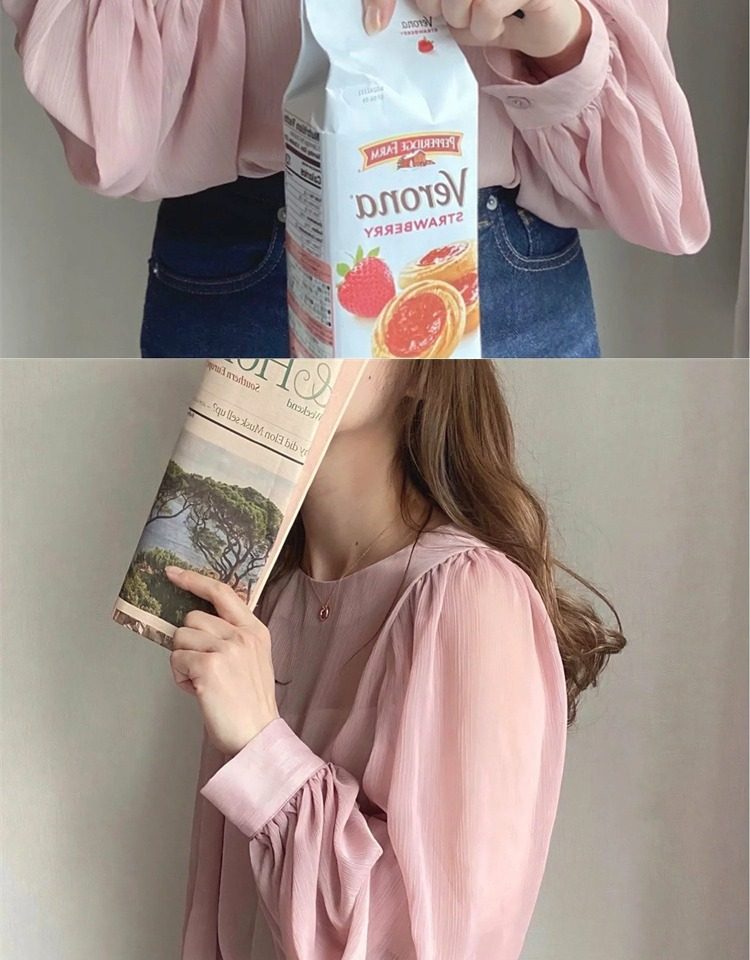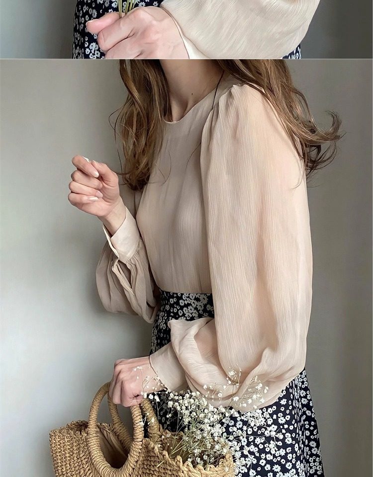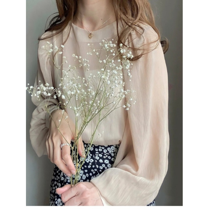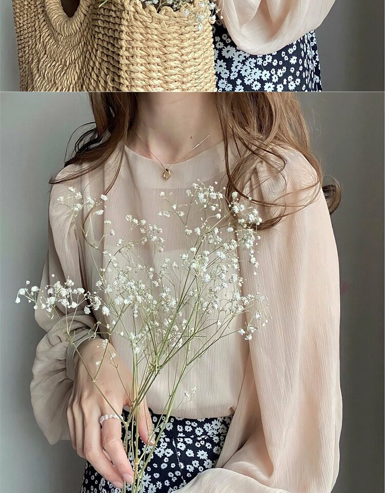 甜美韓國時尚圓領透視粉色寬鬆燈籠長袖雪紡衫防曬衣海邊沙灘罩衫