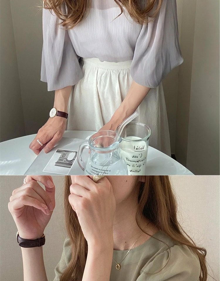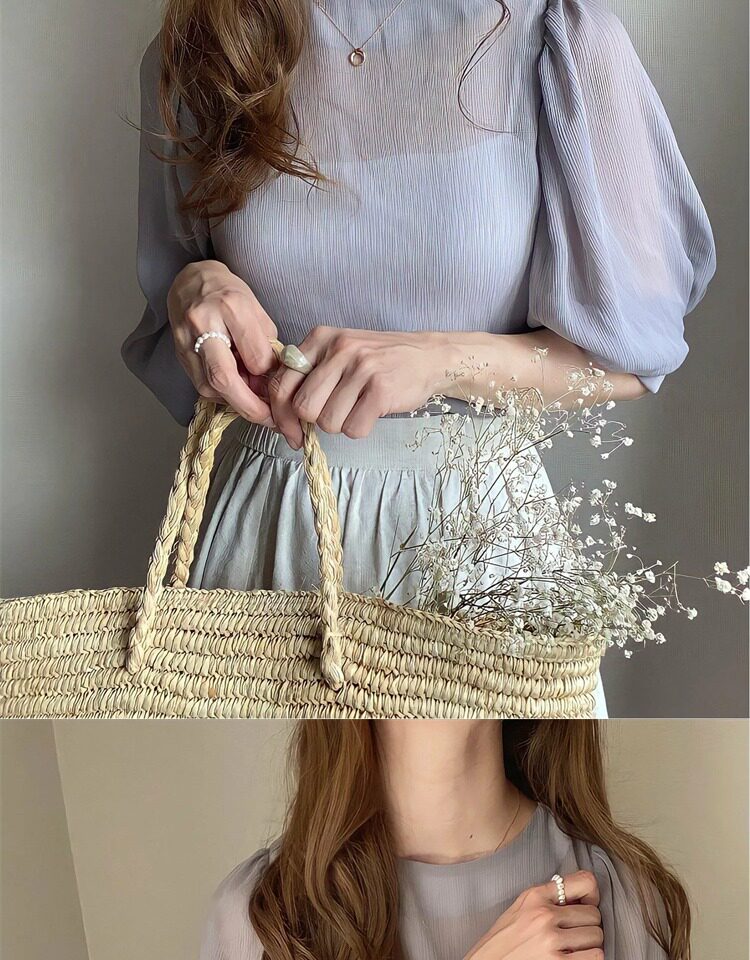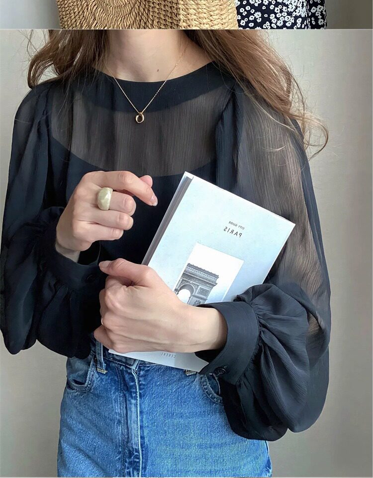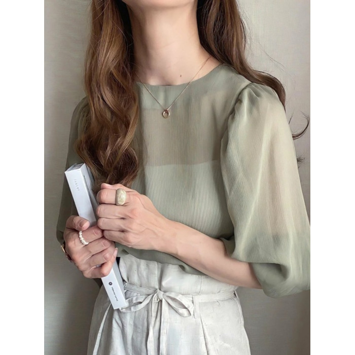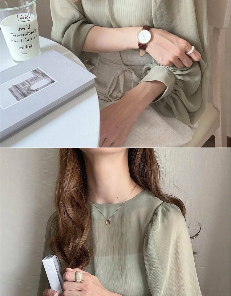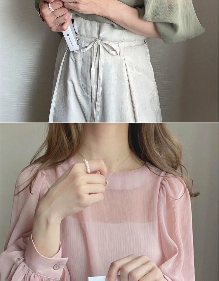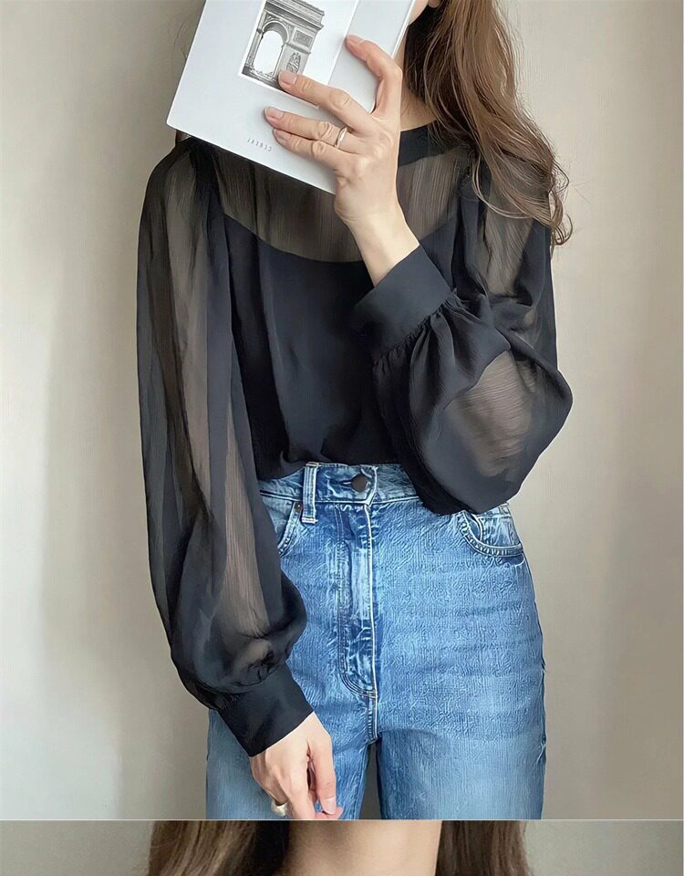 甜美韓國時尚圓領透視粉色寬鬆燈籠長袖雪紡衫防曬衣海邊沙灘罩衫