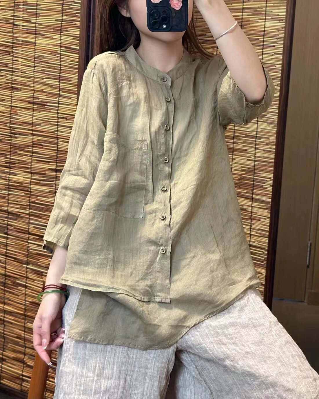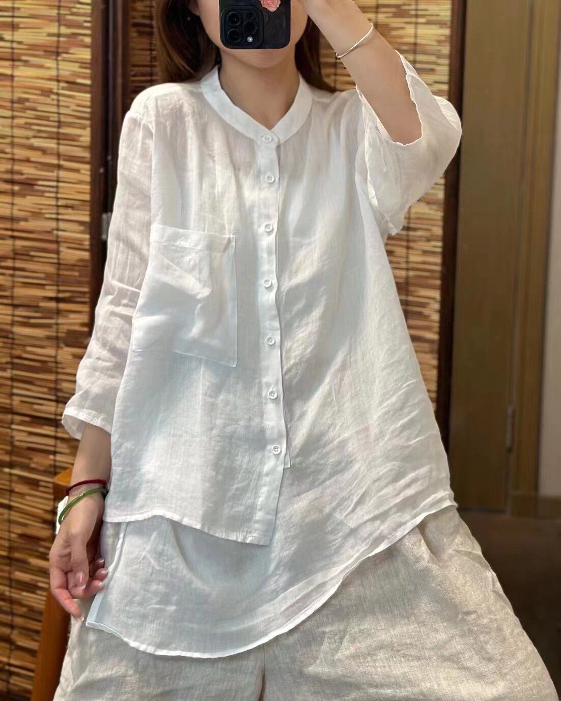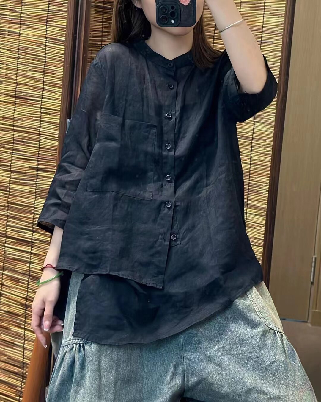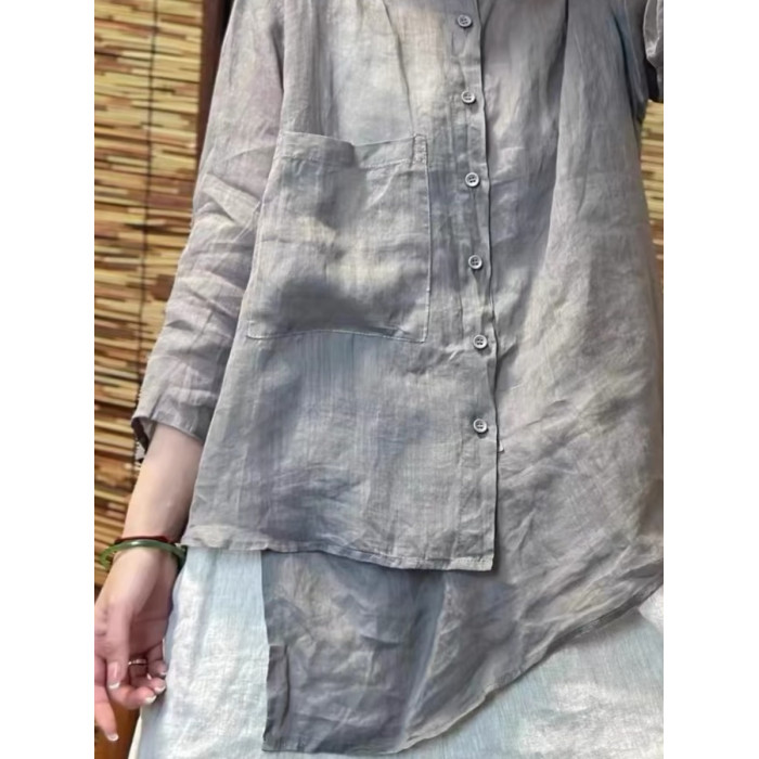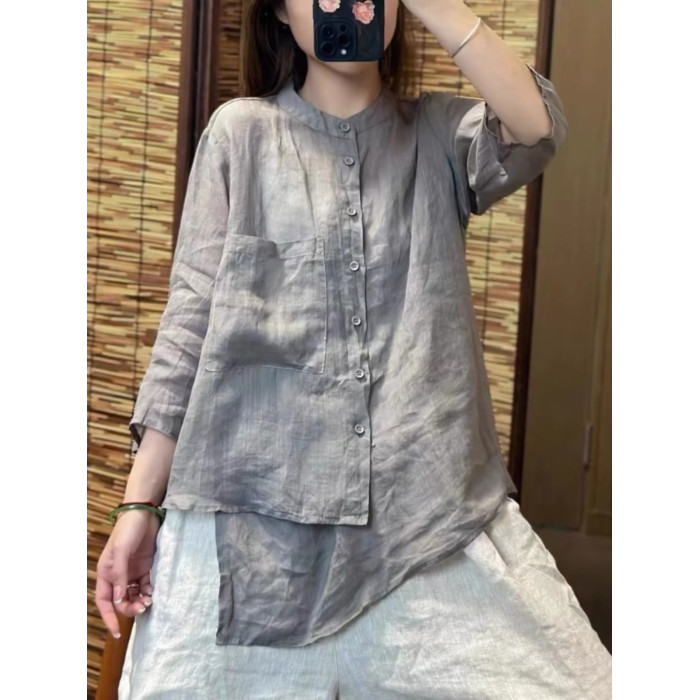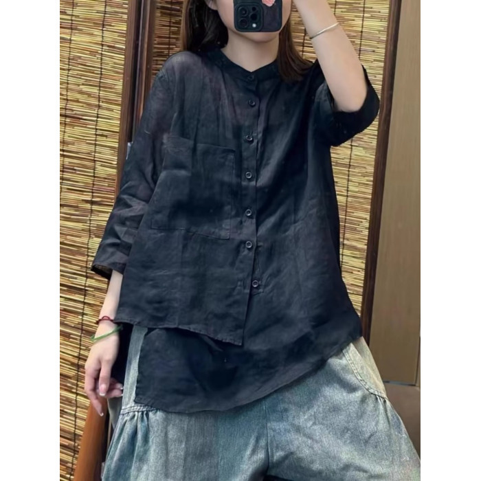 純色苧麻七分袖襯衫女士夏季輕薄透氣亞麻立領襯衣顯瘦不規則上衣
