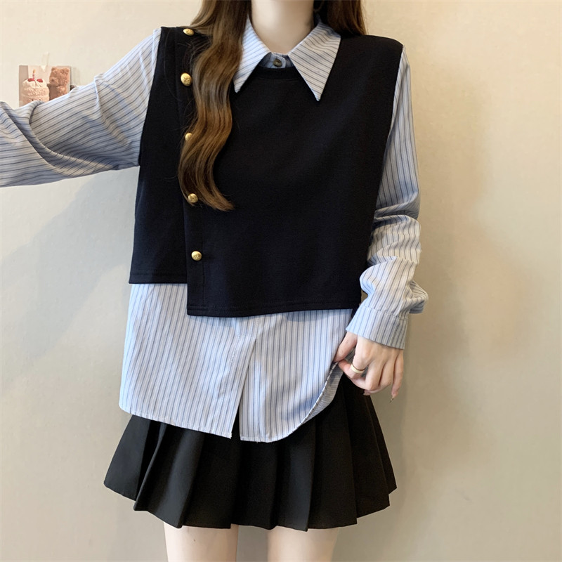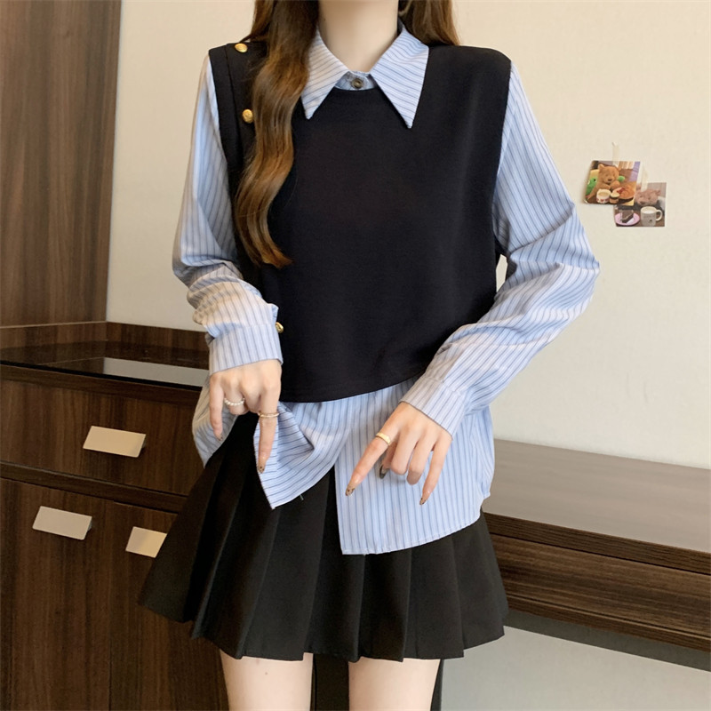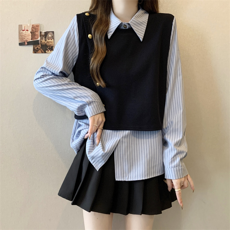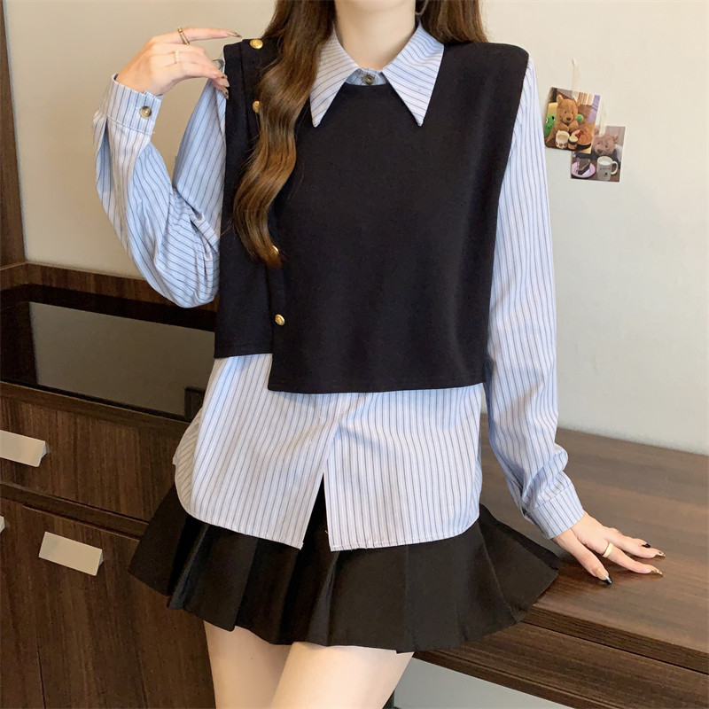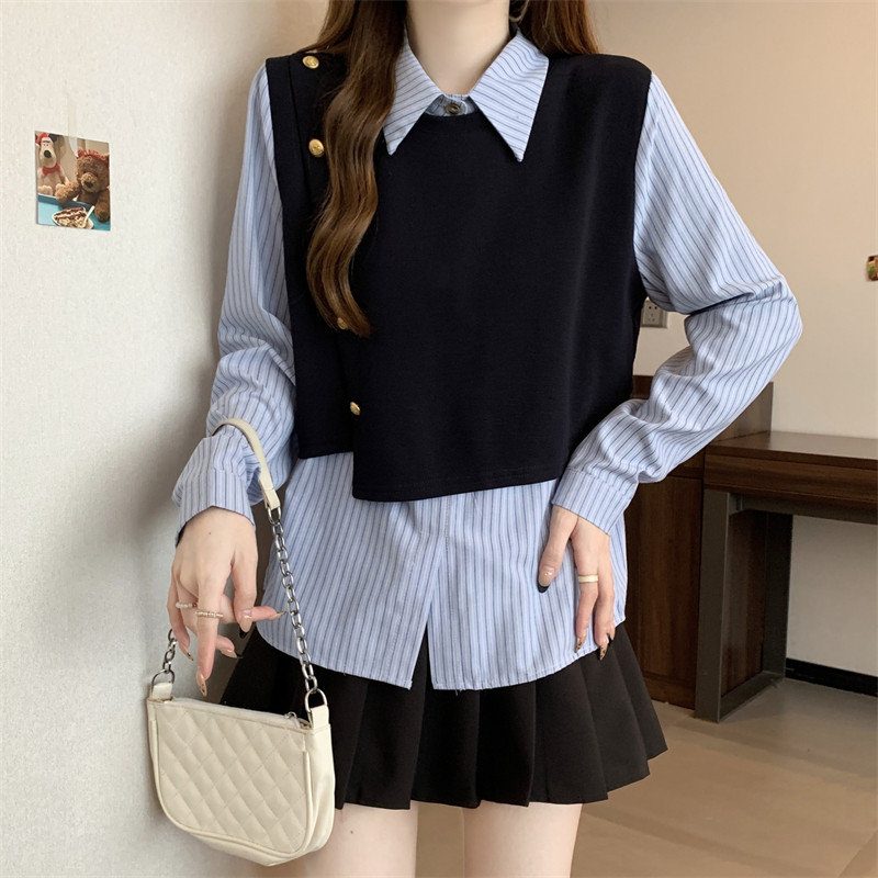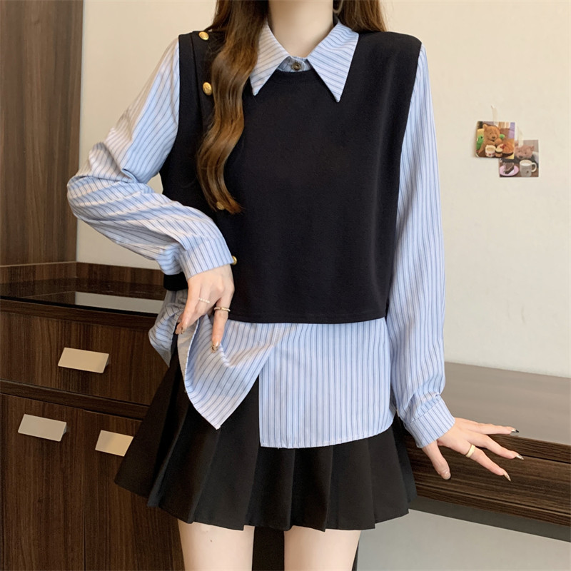 假兩件條紋針織拼接襯衫女2026春秋新款大碼胖mm洋氣遮肉小衫上衣