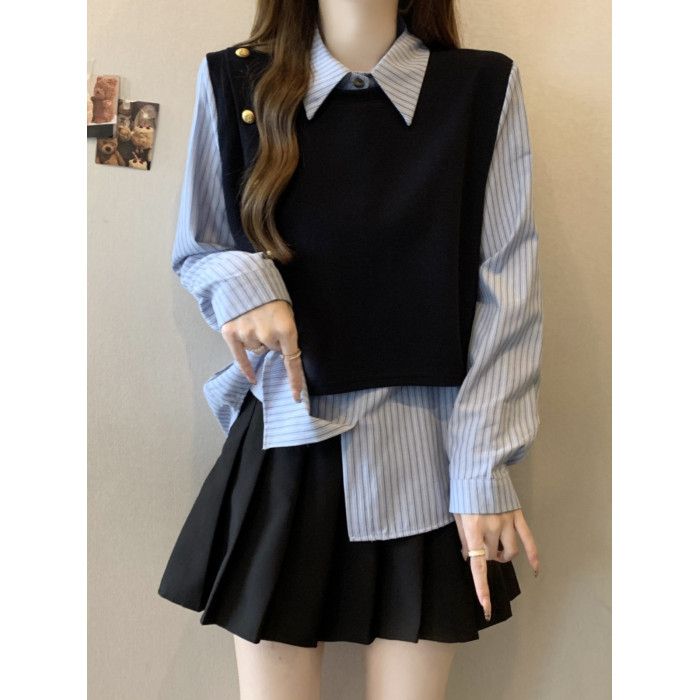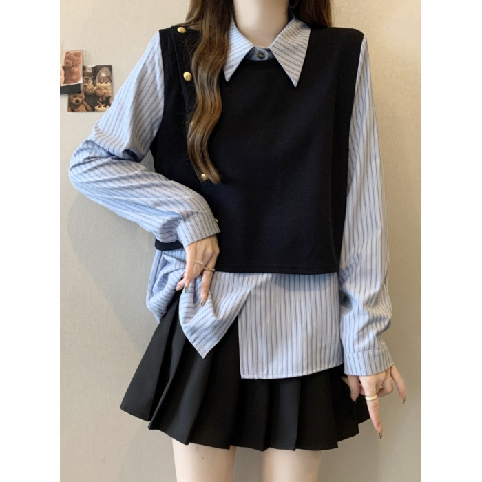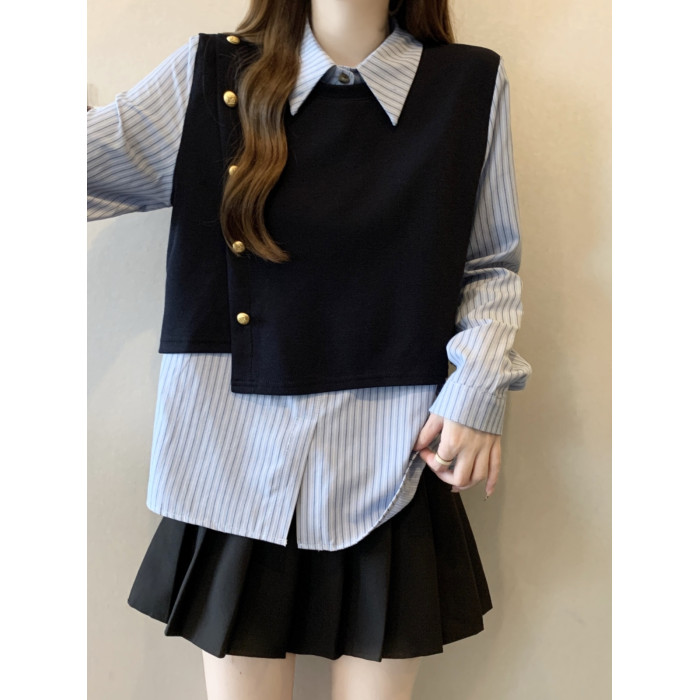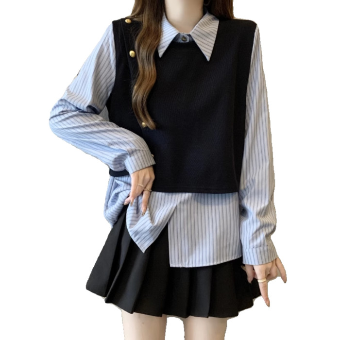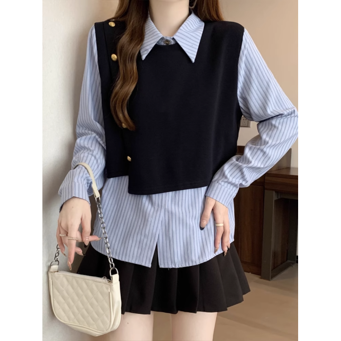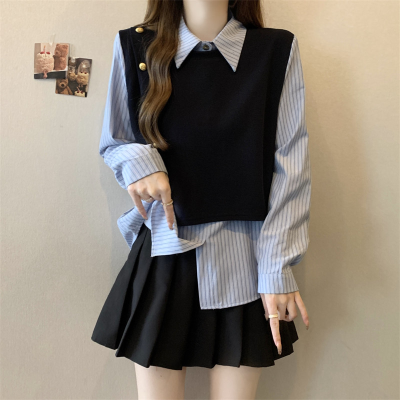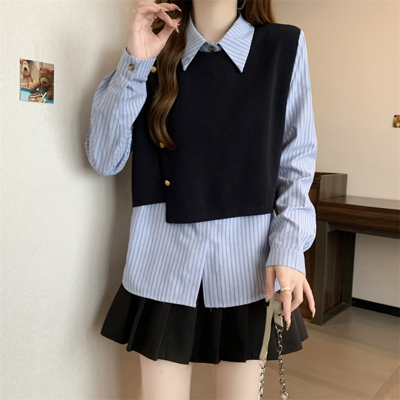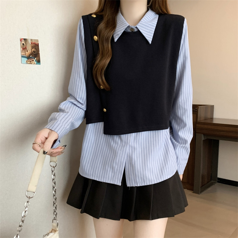 假兩件條紋針織拼接襯衫女2026春秋新款大碼胖mm洋氣遮肉小衫上衣