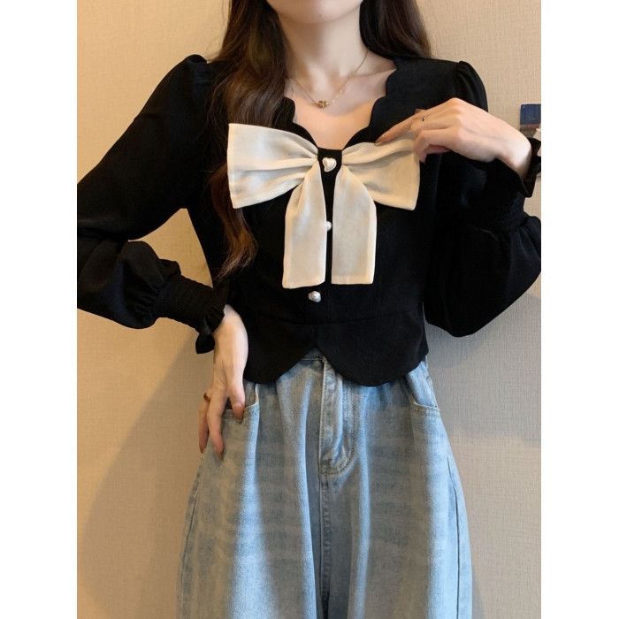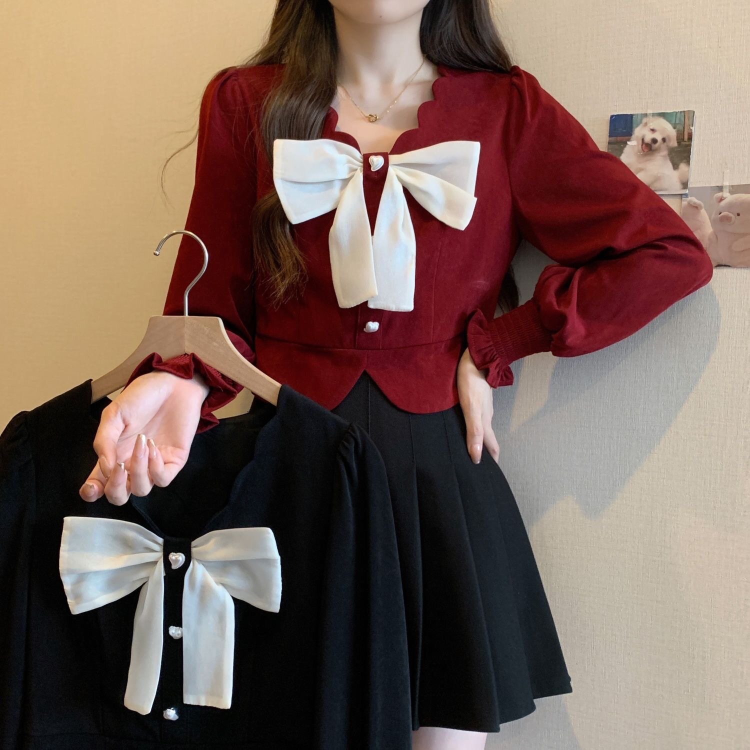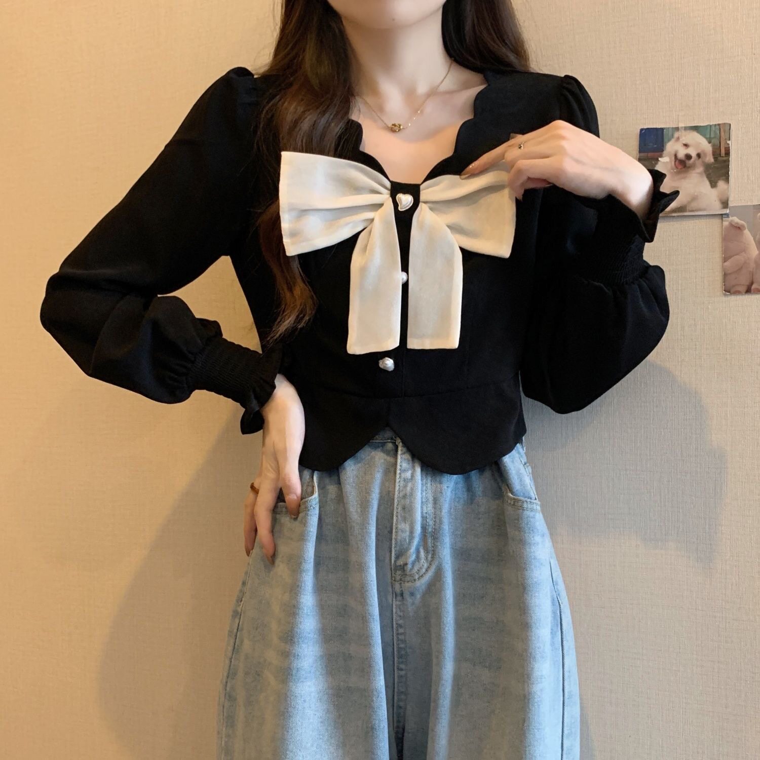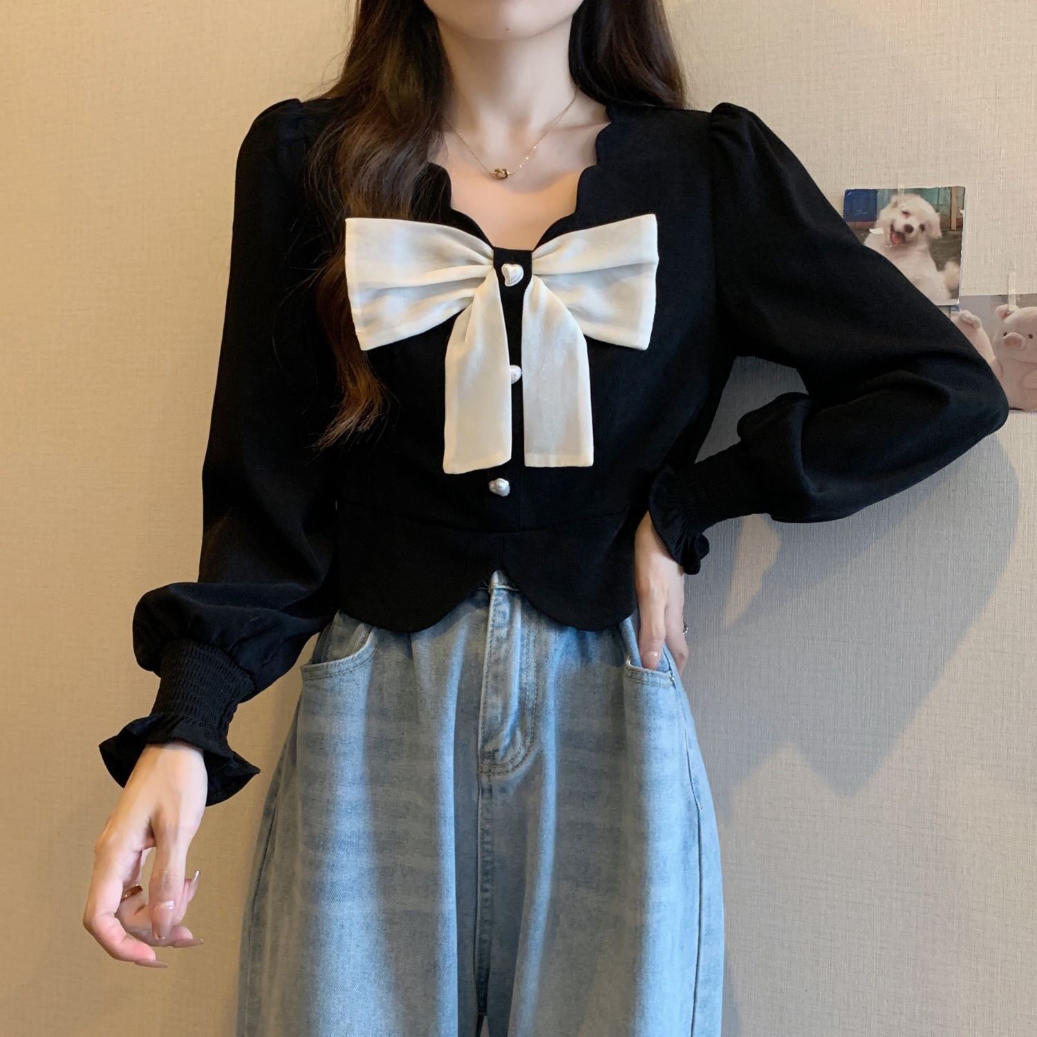 法式小香風時尚短款上衣秋季新款高級設計感氣質修身蝴蝶結襯衫潮