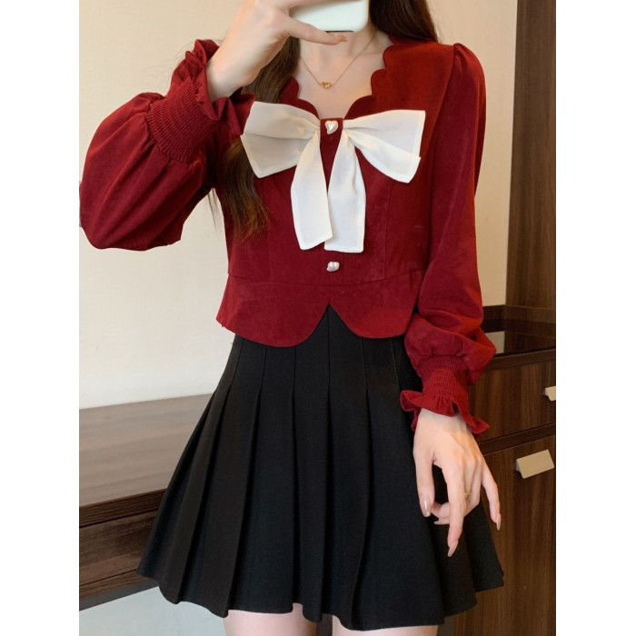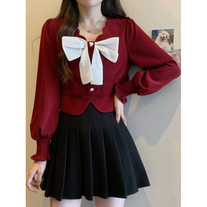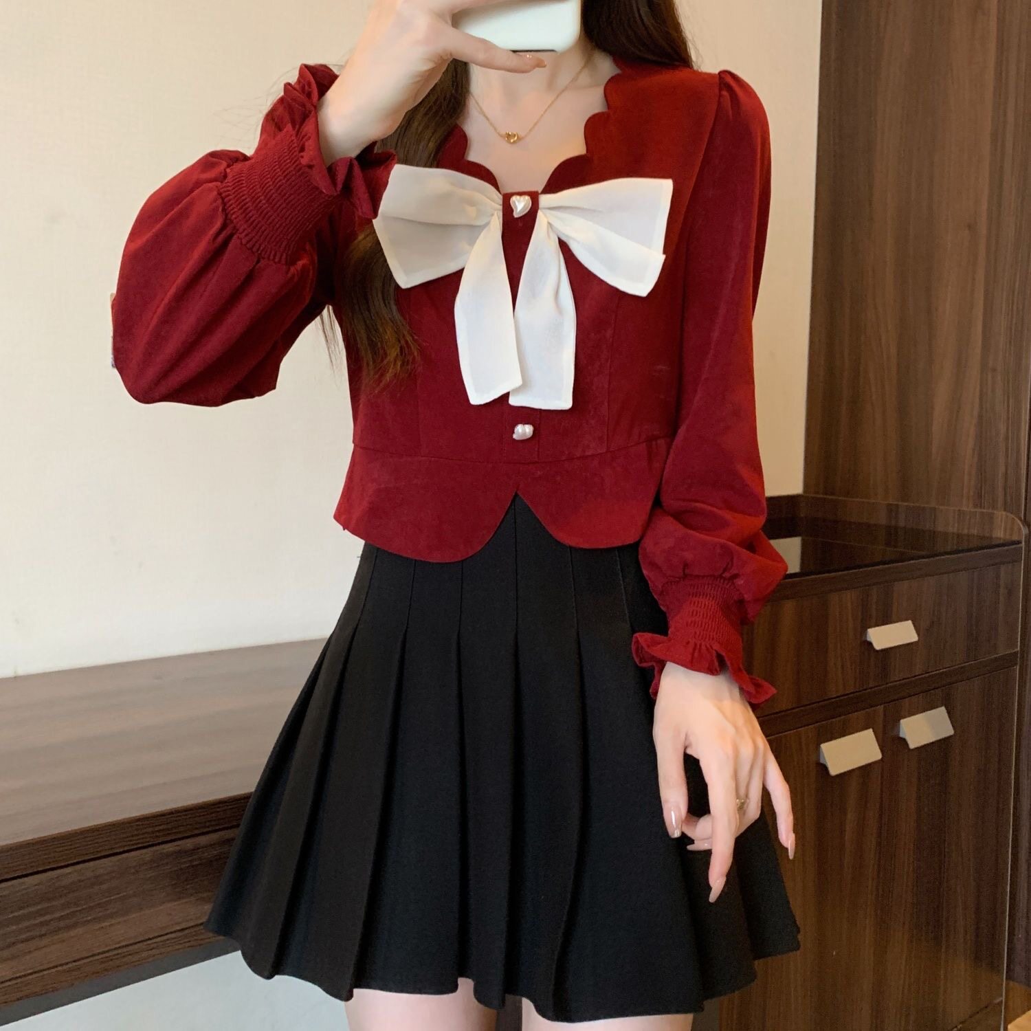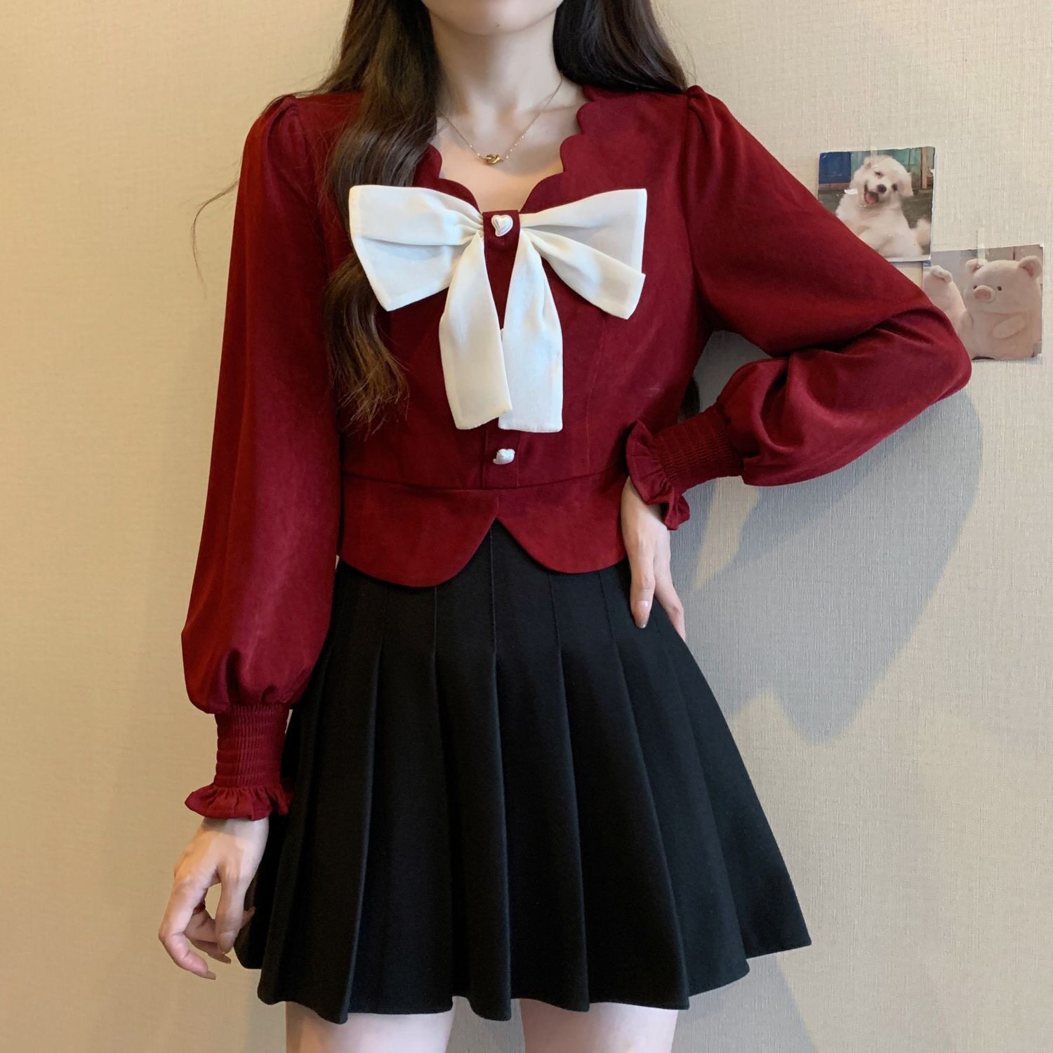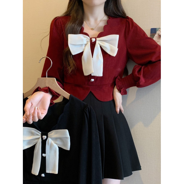 法式小香風時尚短款上衣秋季新款高級設計感氣質修身蝴蝶結襯衫潮