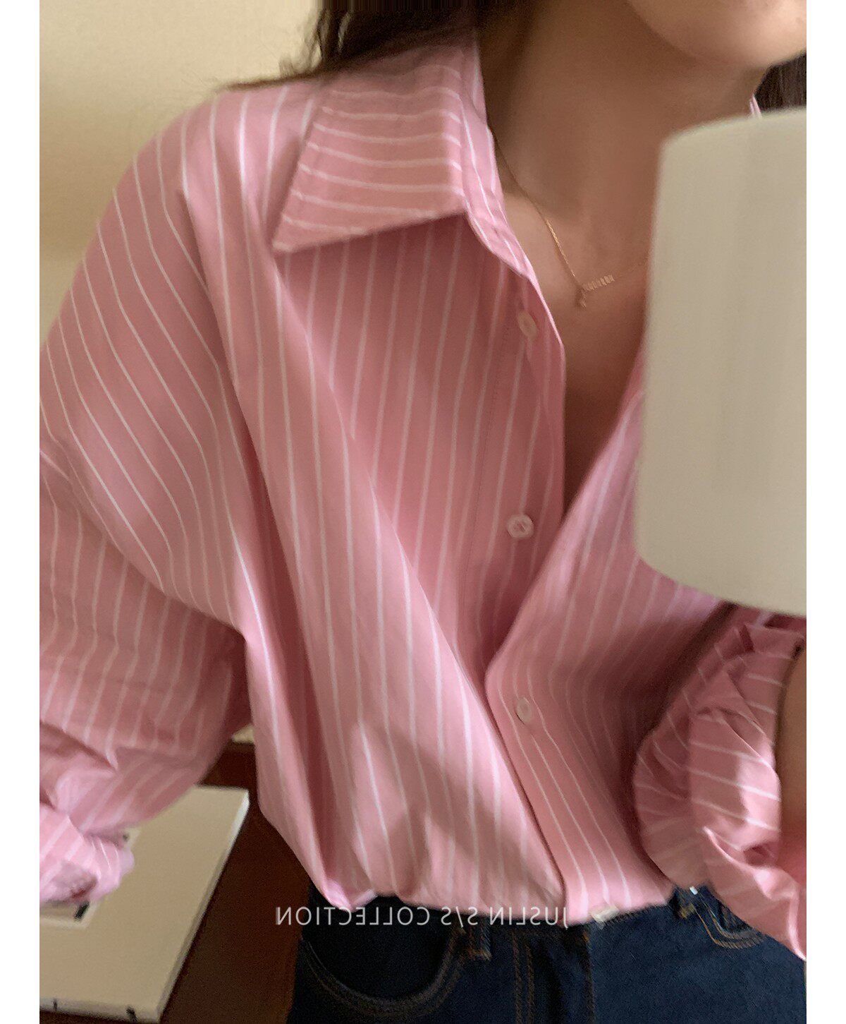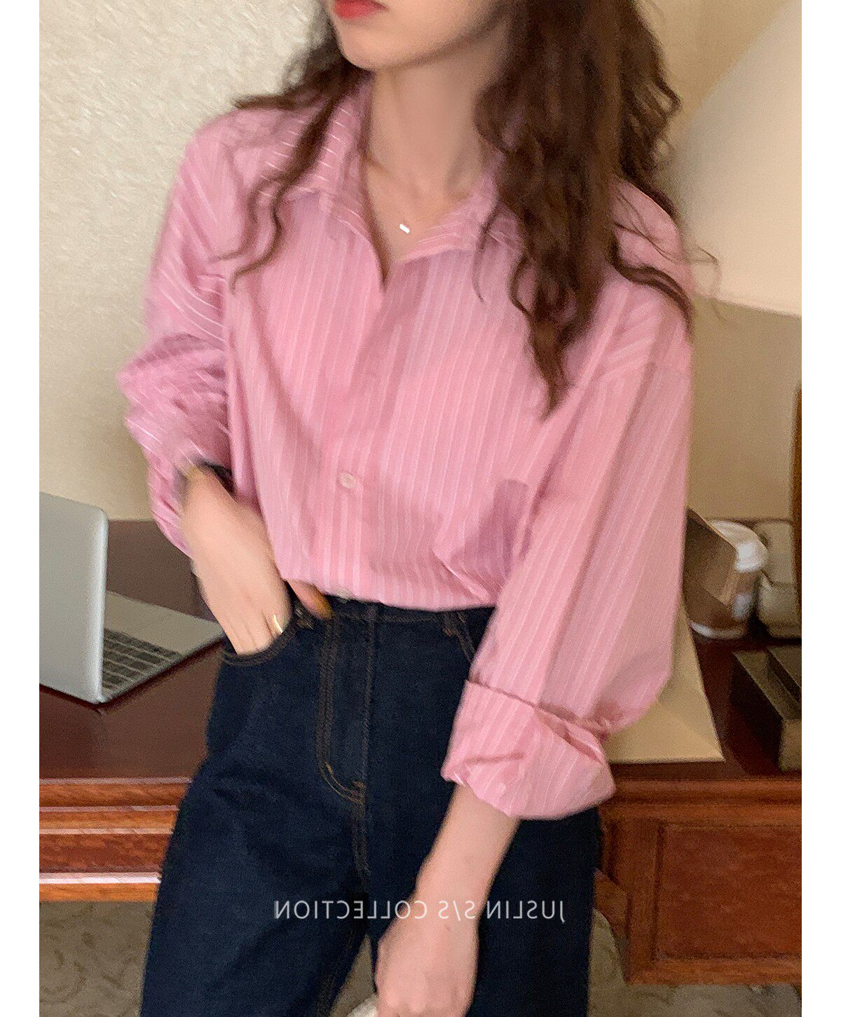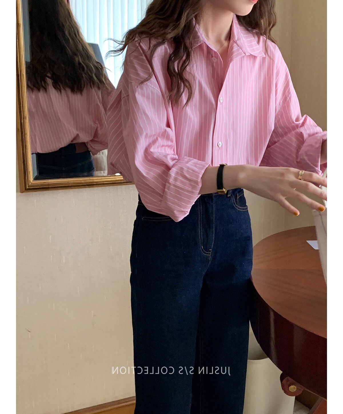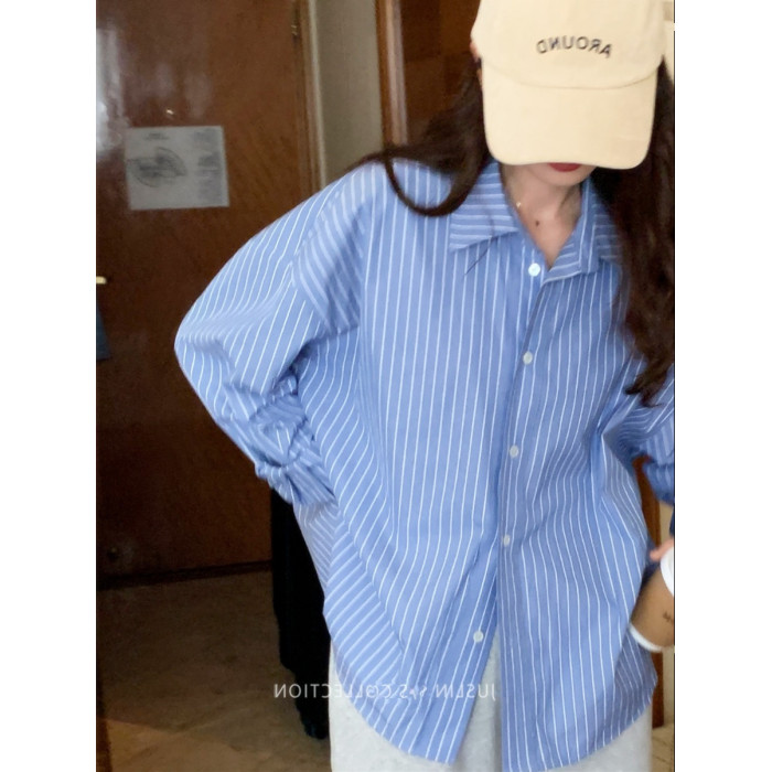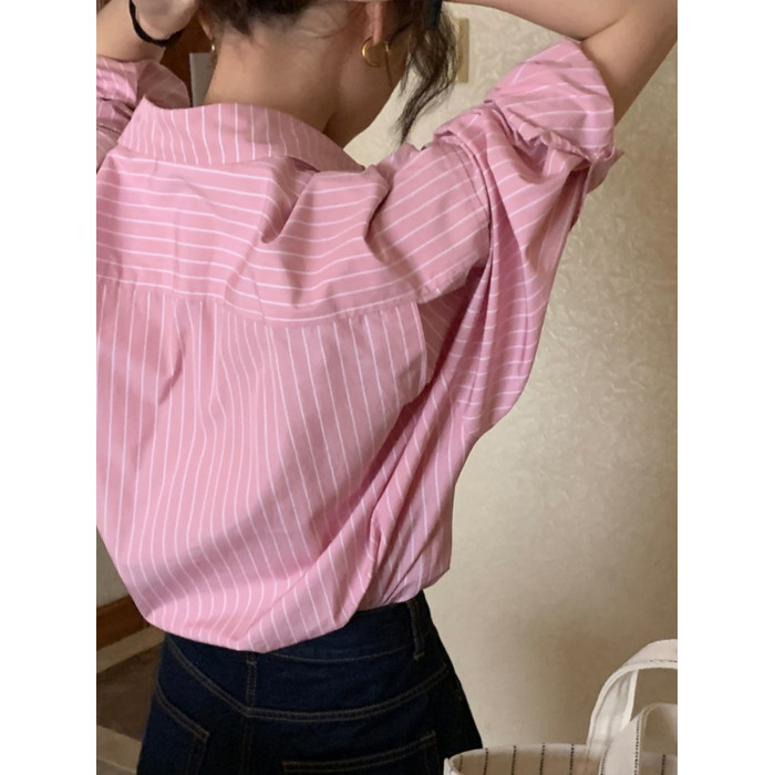 2026春秋粉色條紋減齡寬鬆百搭襯衫女韓版設計感溫柔慵懶圓領襯衣