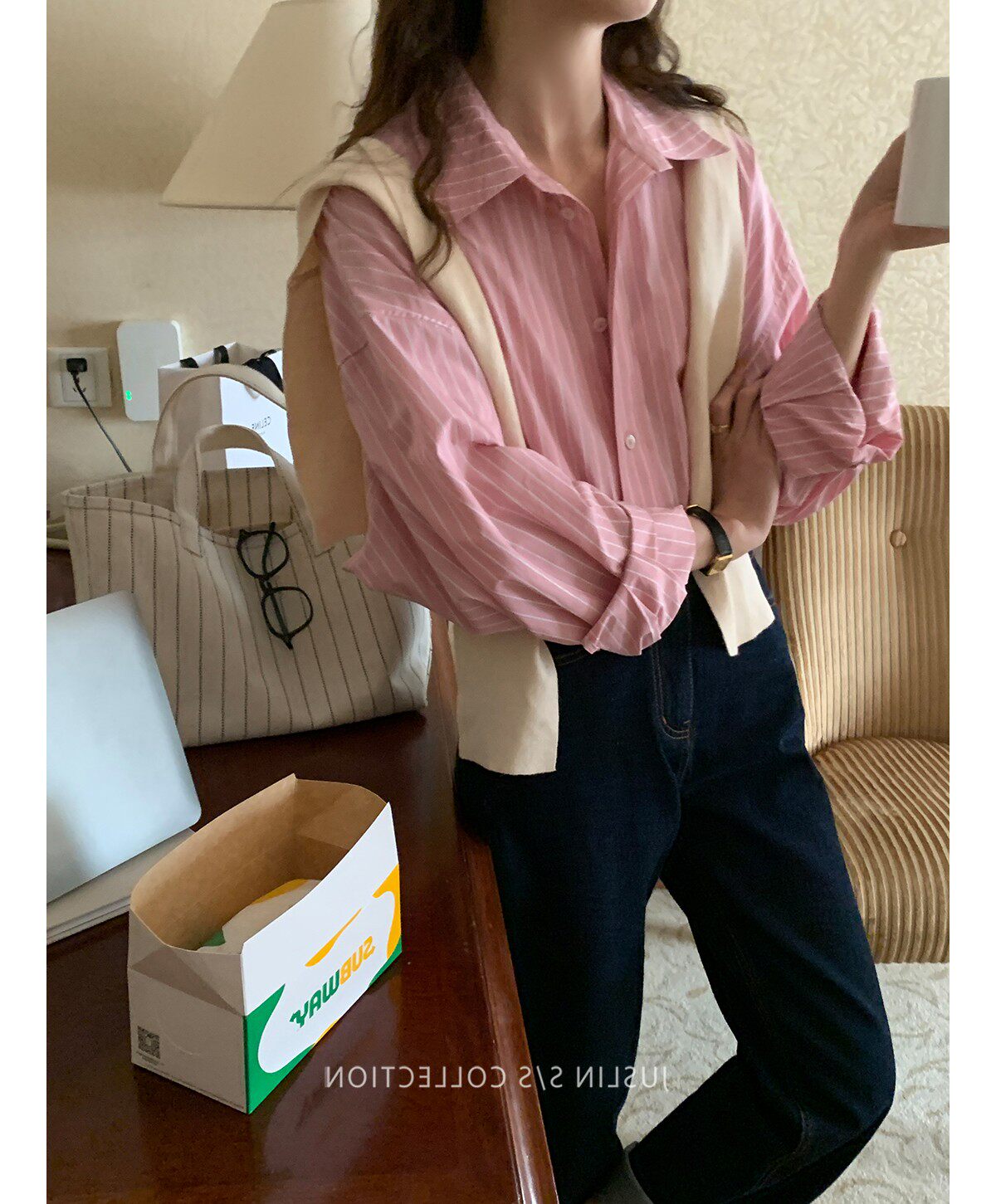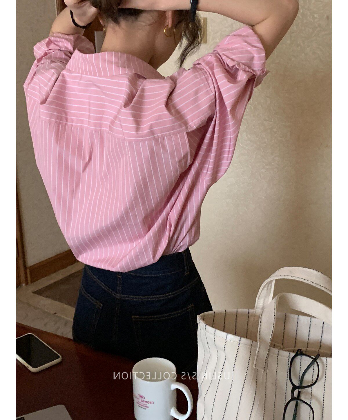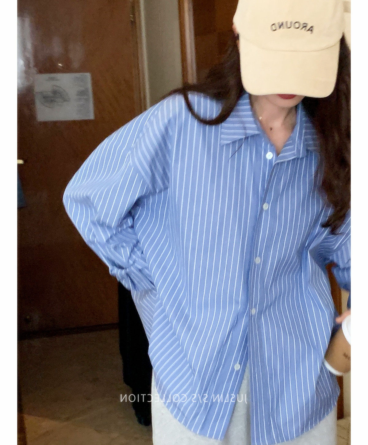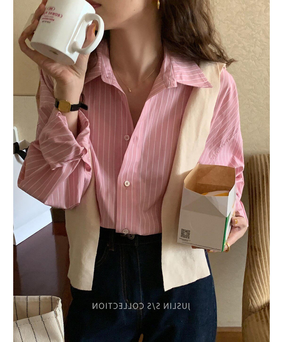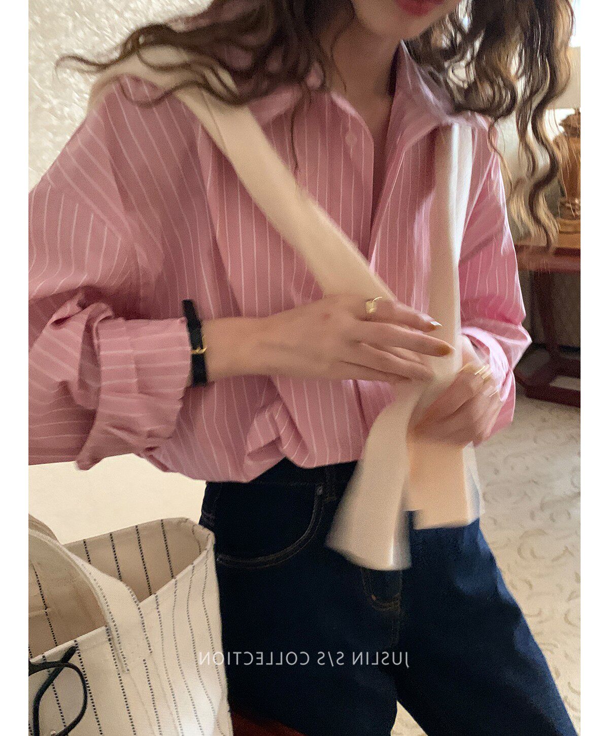 2026春秋粉色條紋減齡寬鬆百搭襯衫女韓版設計感溫柔慵懶圓領襯衣