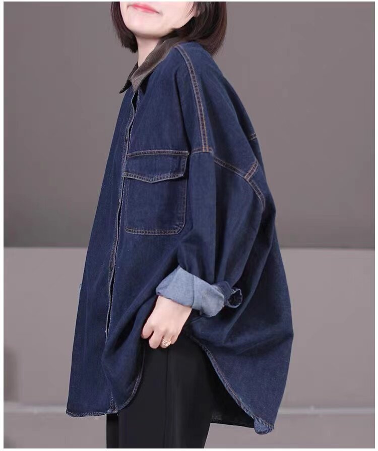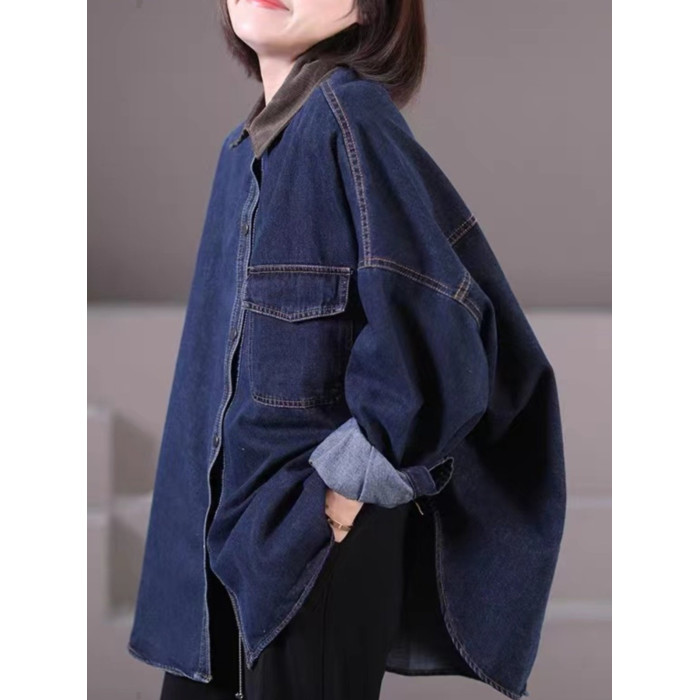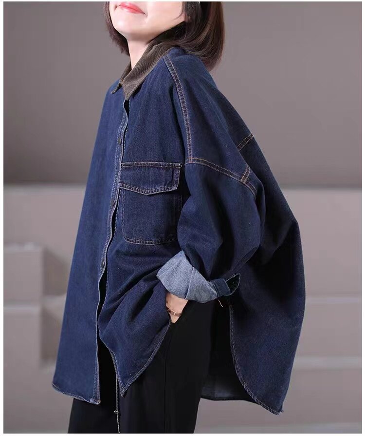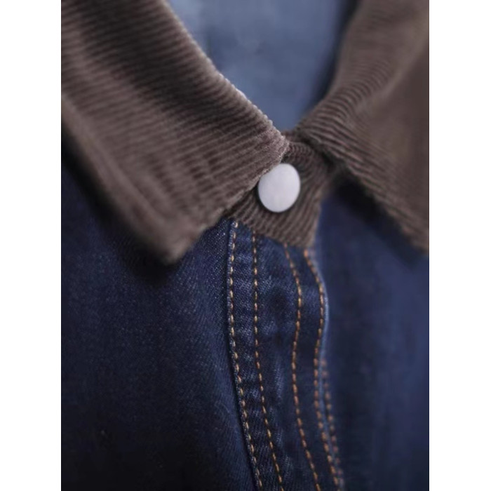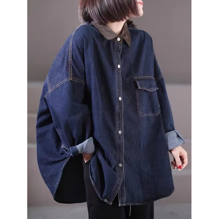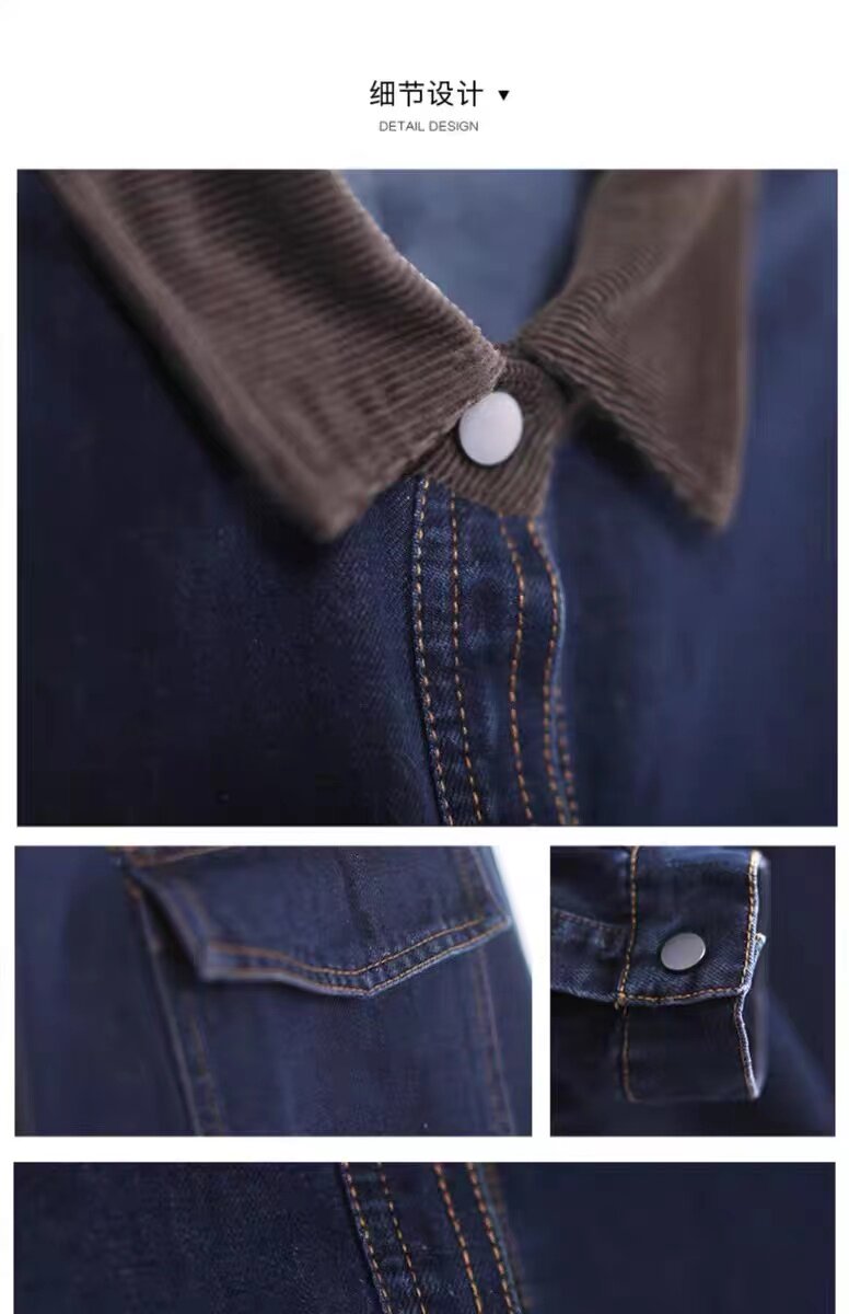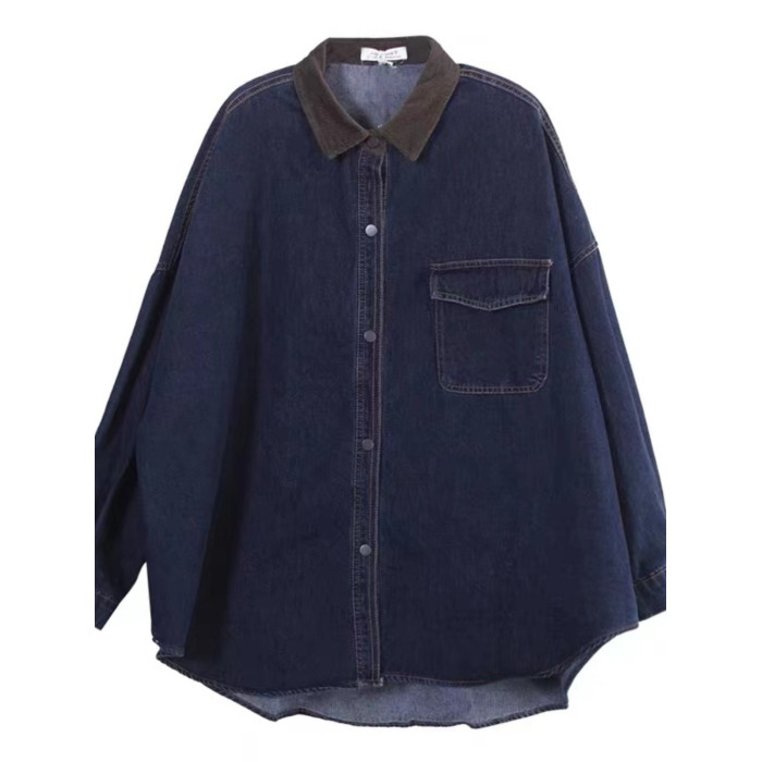 出口大牌剪標女韓版寬鬆大碼燈芯絨繙領拼接牛仔襯衣外套