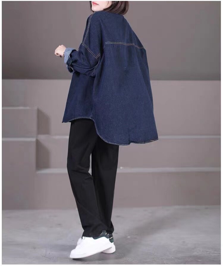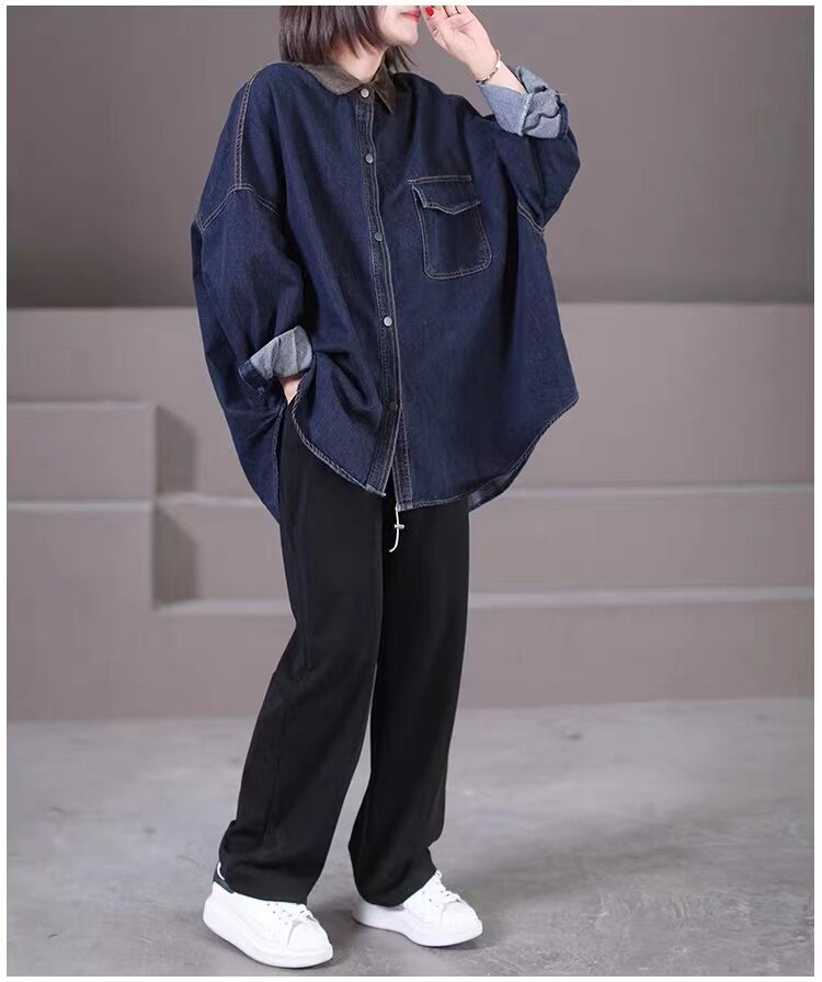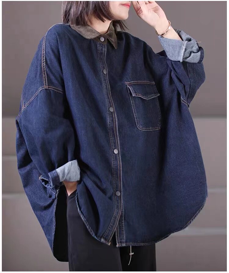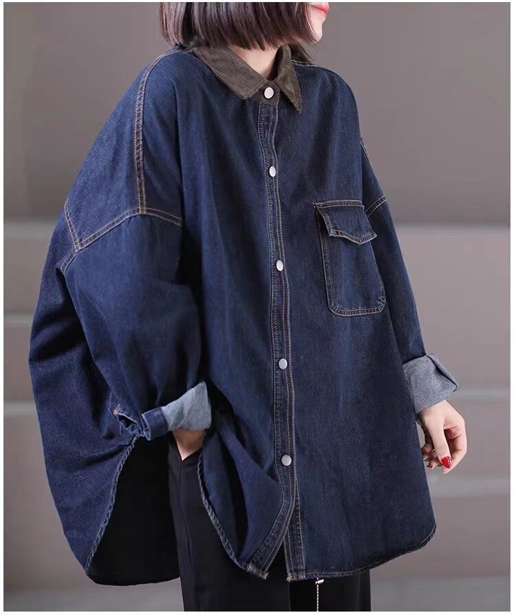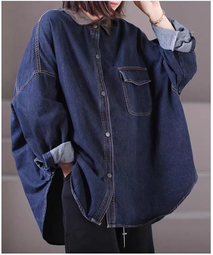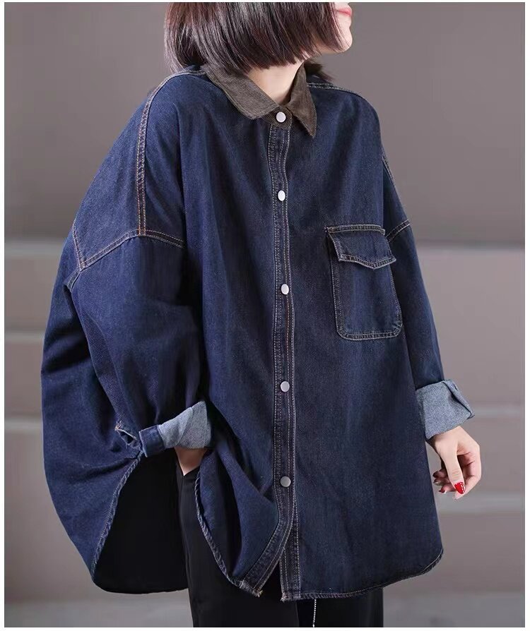 出口大牌剪標女韓版寬鬆大碼燈芯絨繙領拼接牛仔襯衣外套