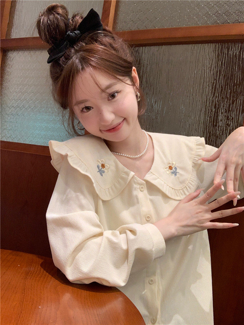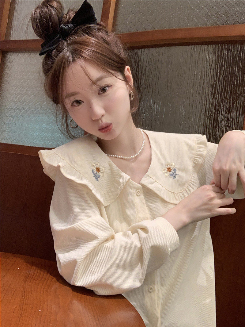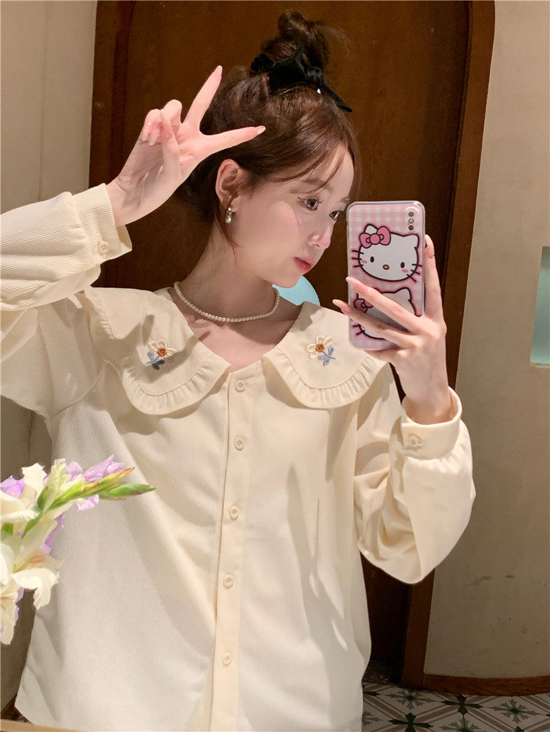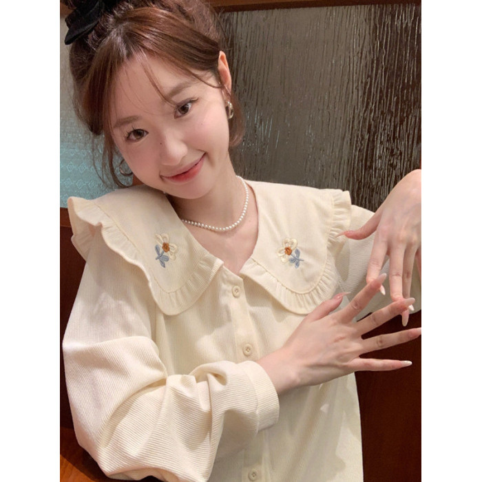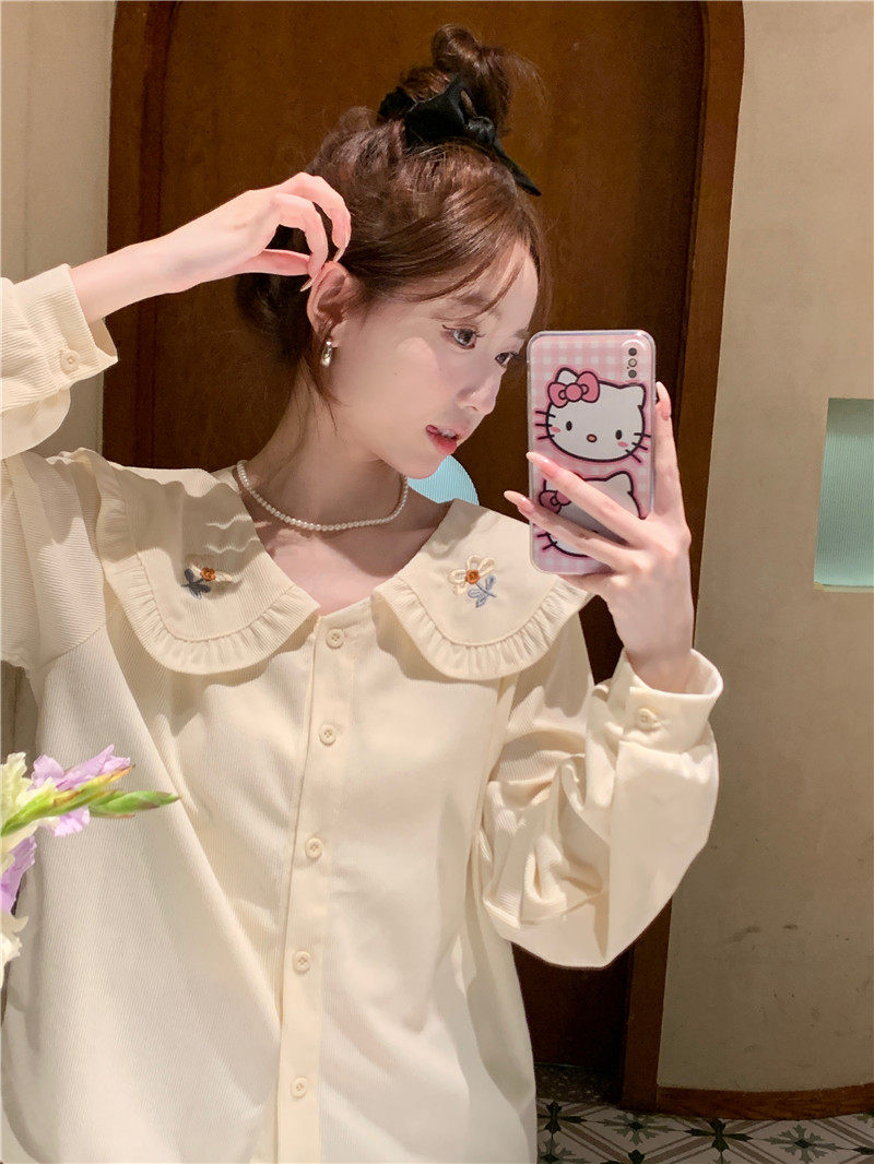 2025年春秋襯衣女法式甜美寬鬆休閒娃娃領襯衣刺綉小衆學院風襯衫