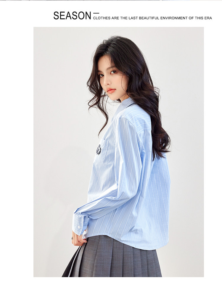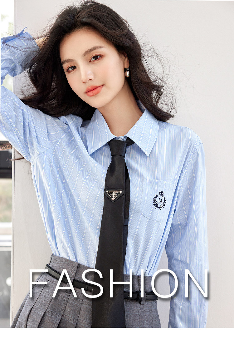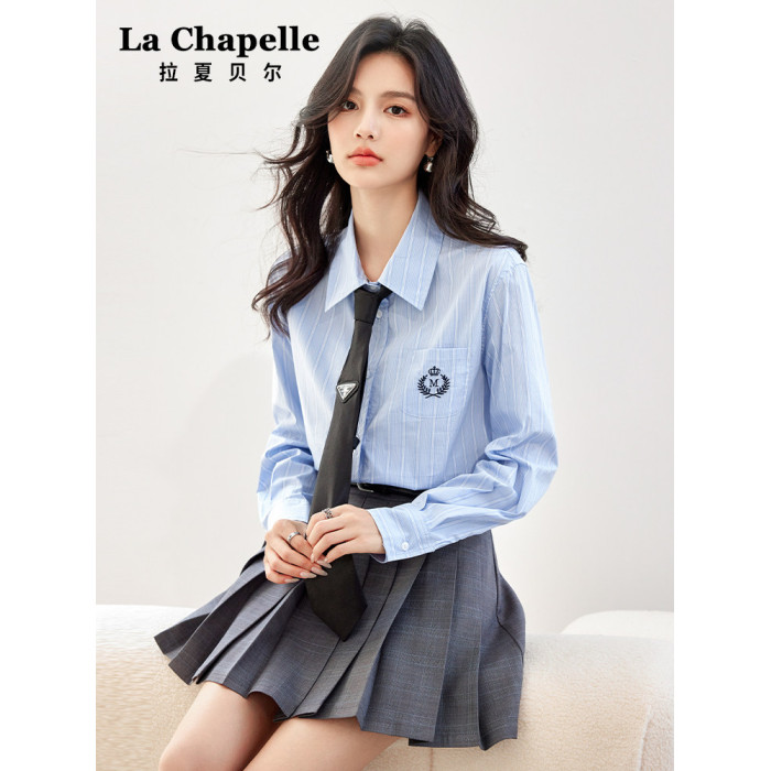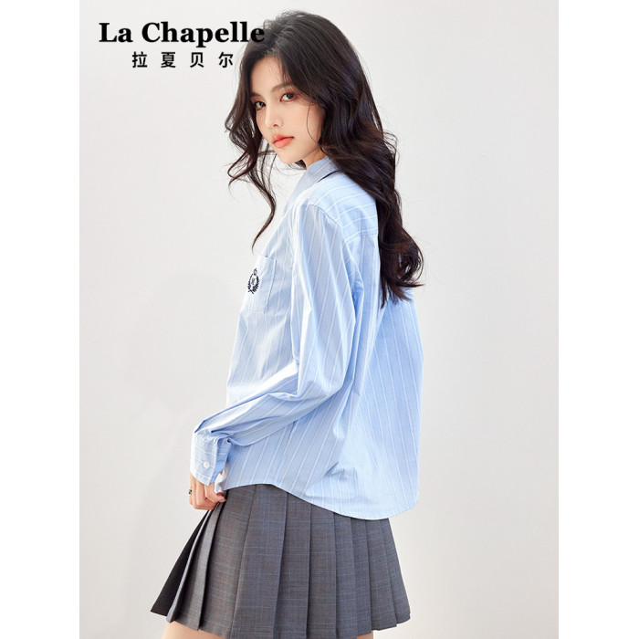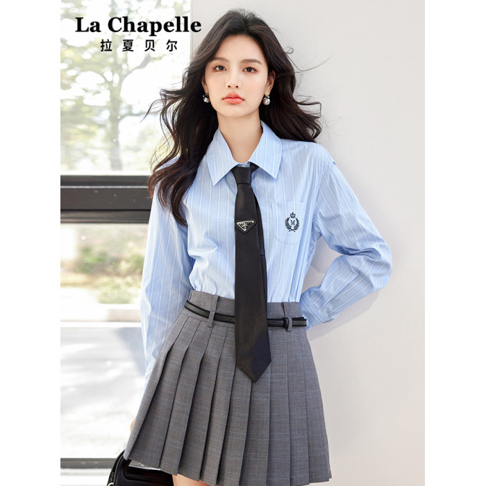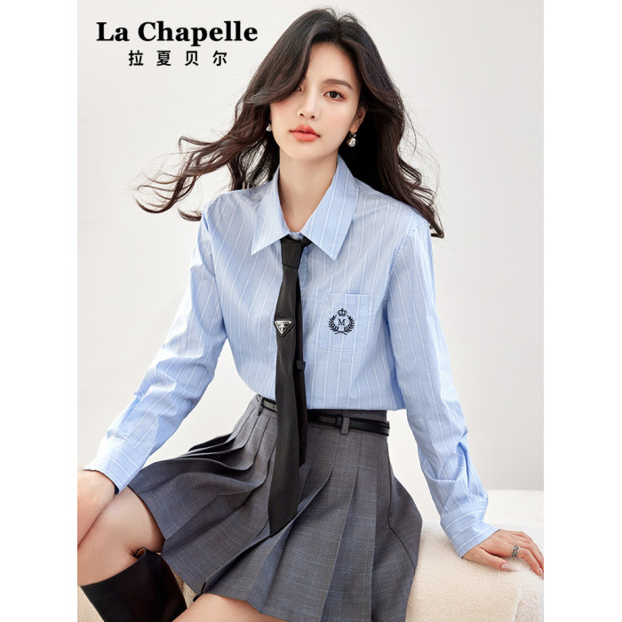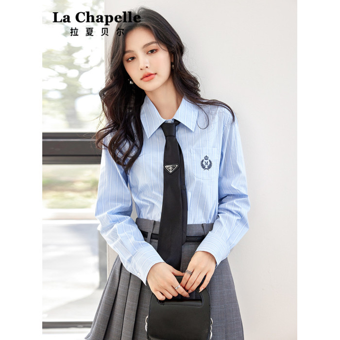 拉夏貝爾氣質百搭繙領條紋襯衫女2026春秋新款韓版學院風長袖上衣