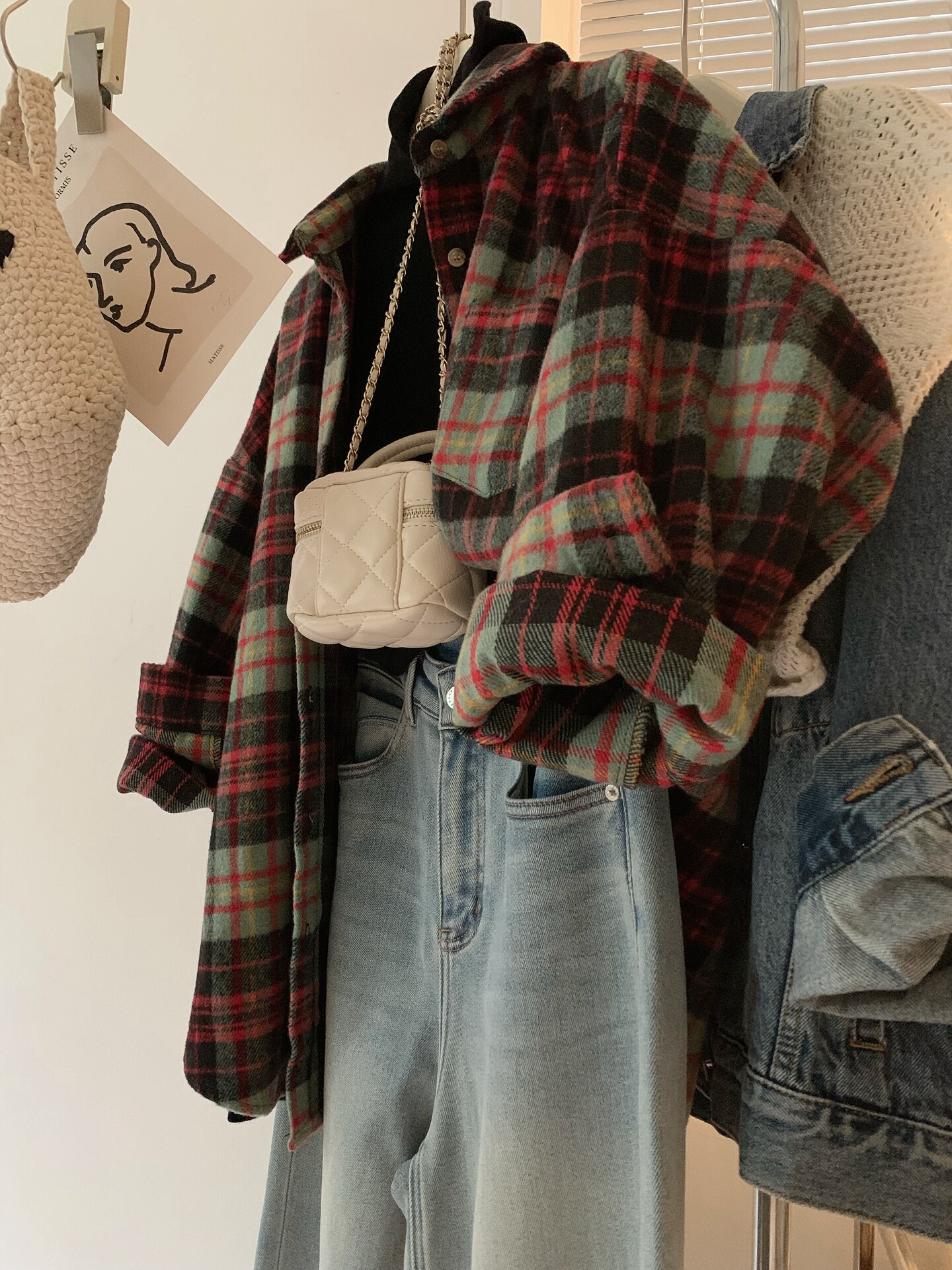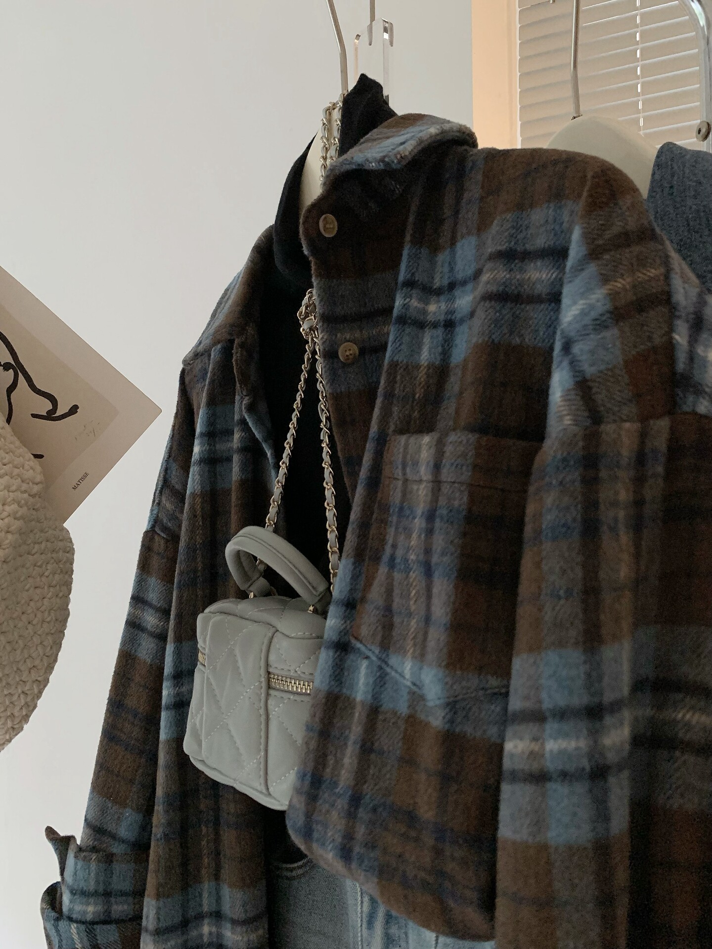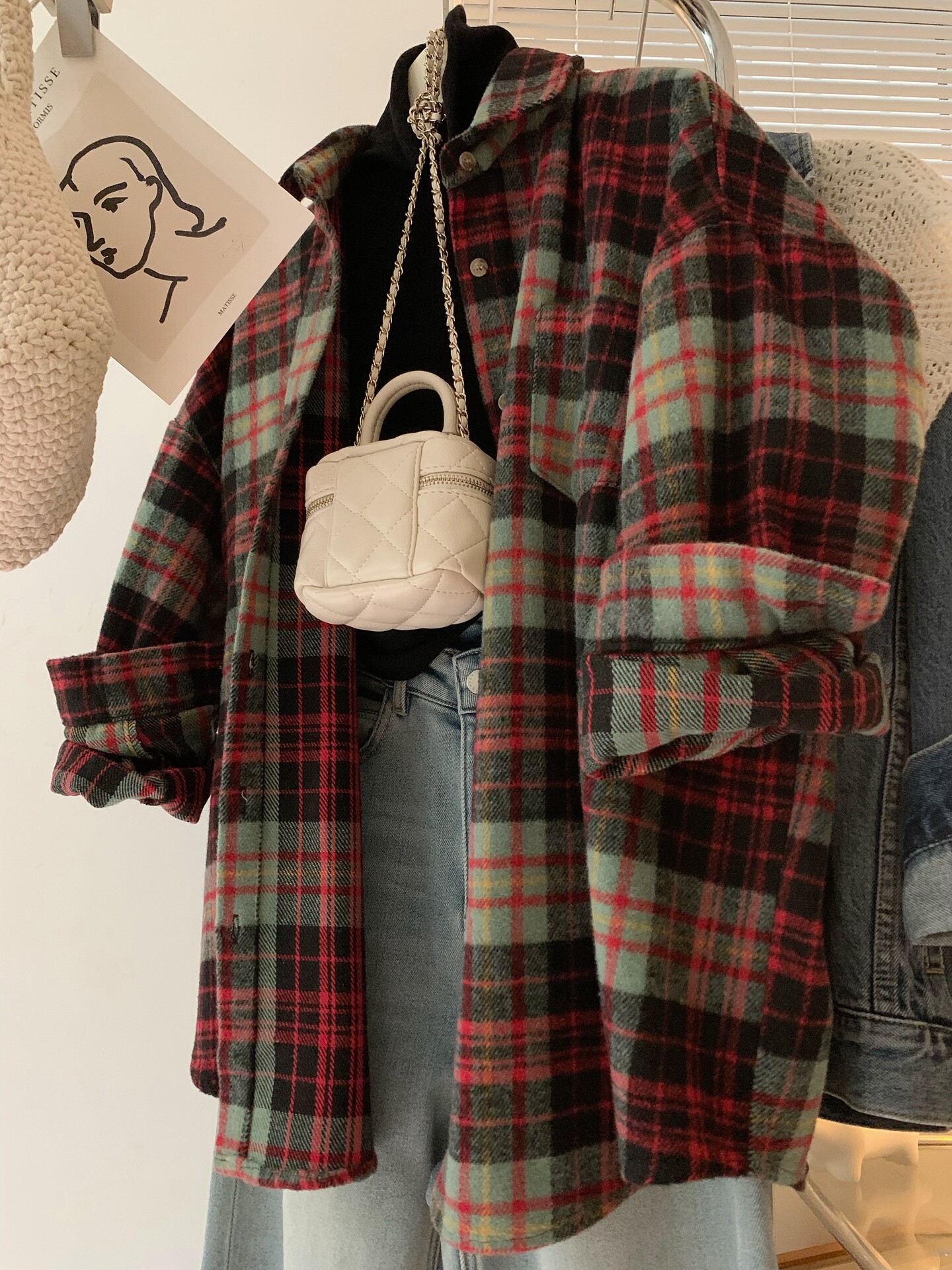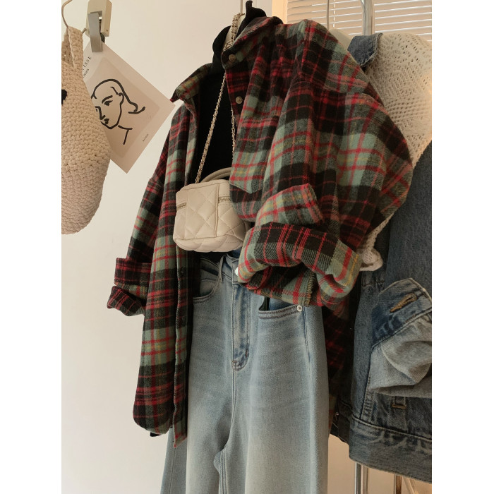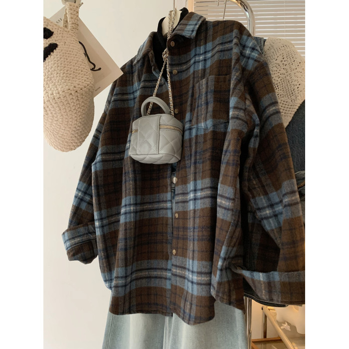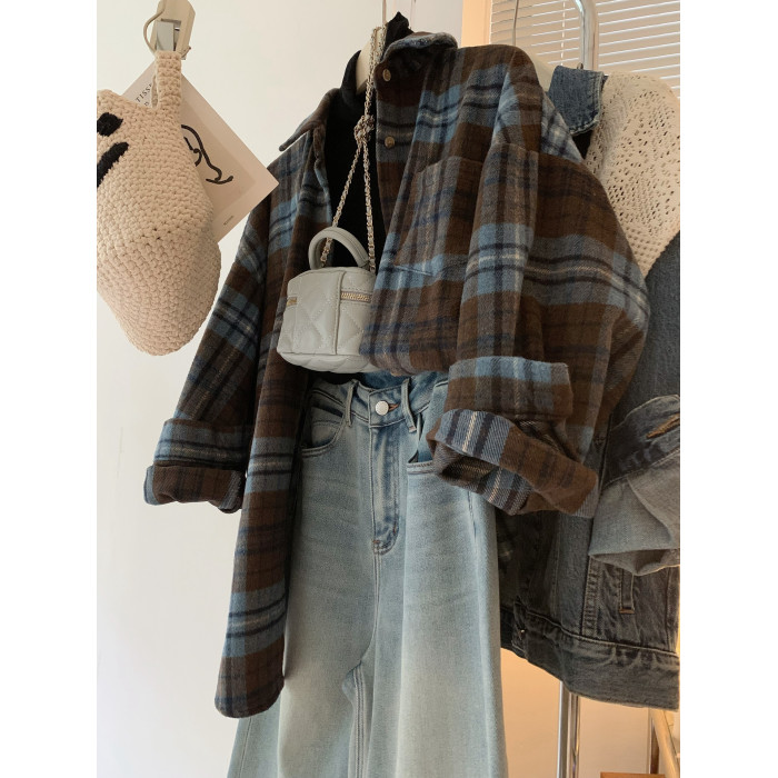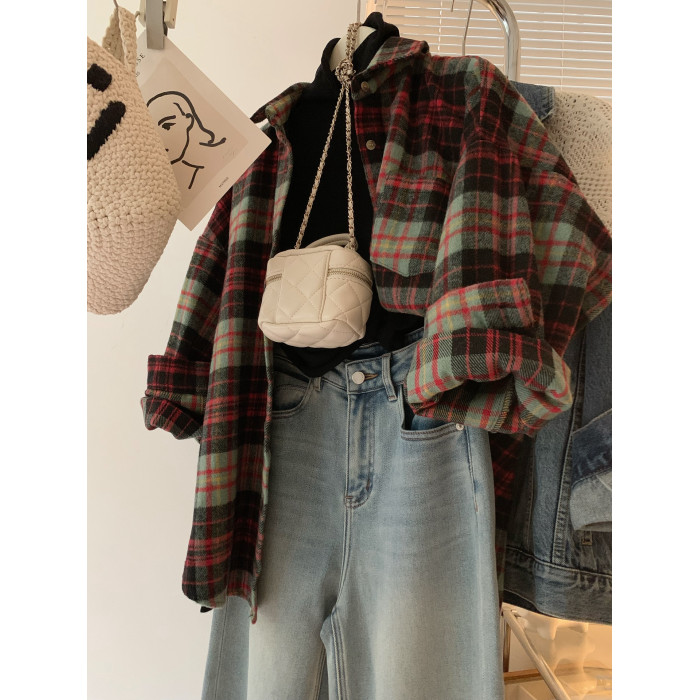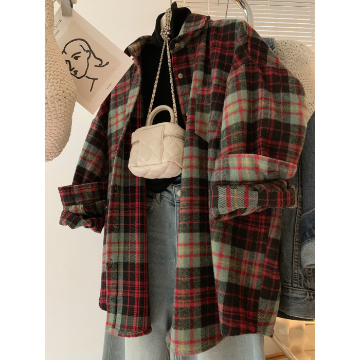 配色超美~復古毛呢撞色格子襯衫女時髦洋氣內搭曡穿繙領襯衣上衣