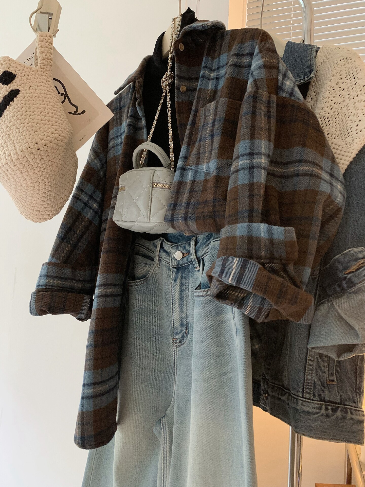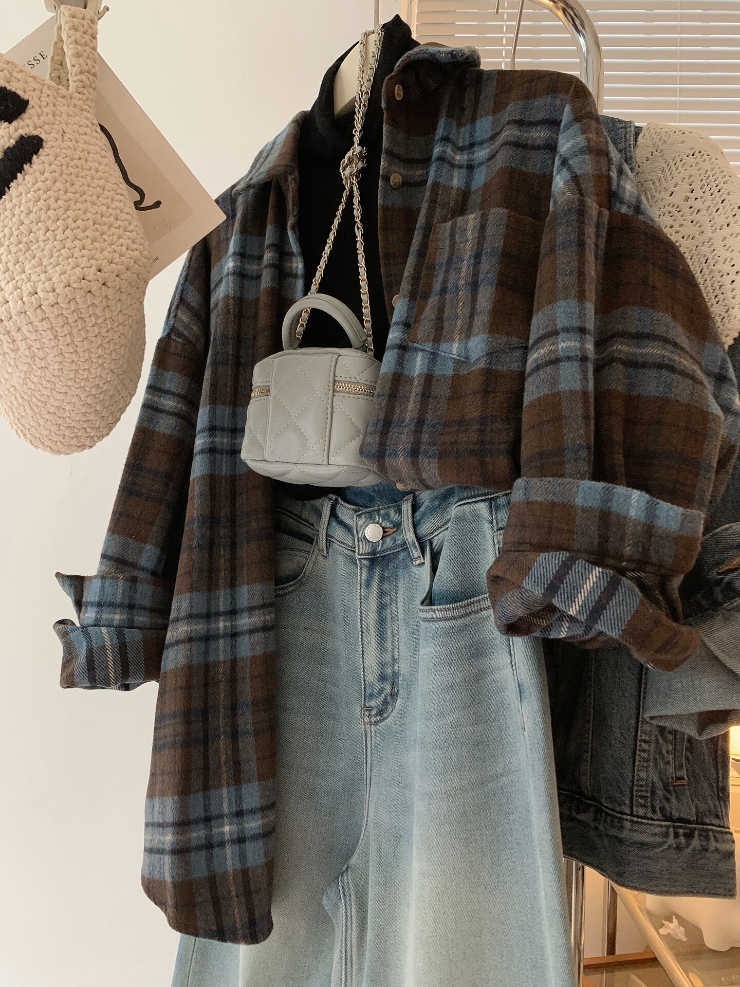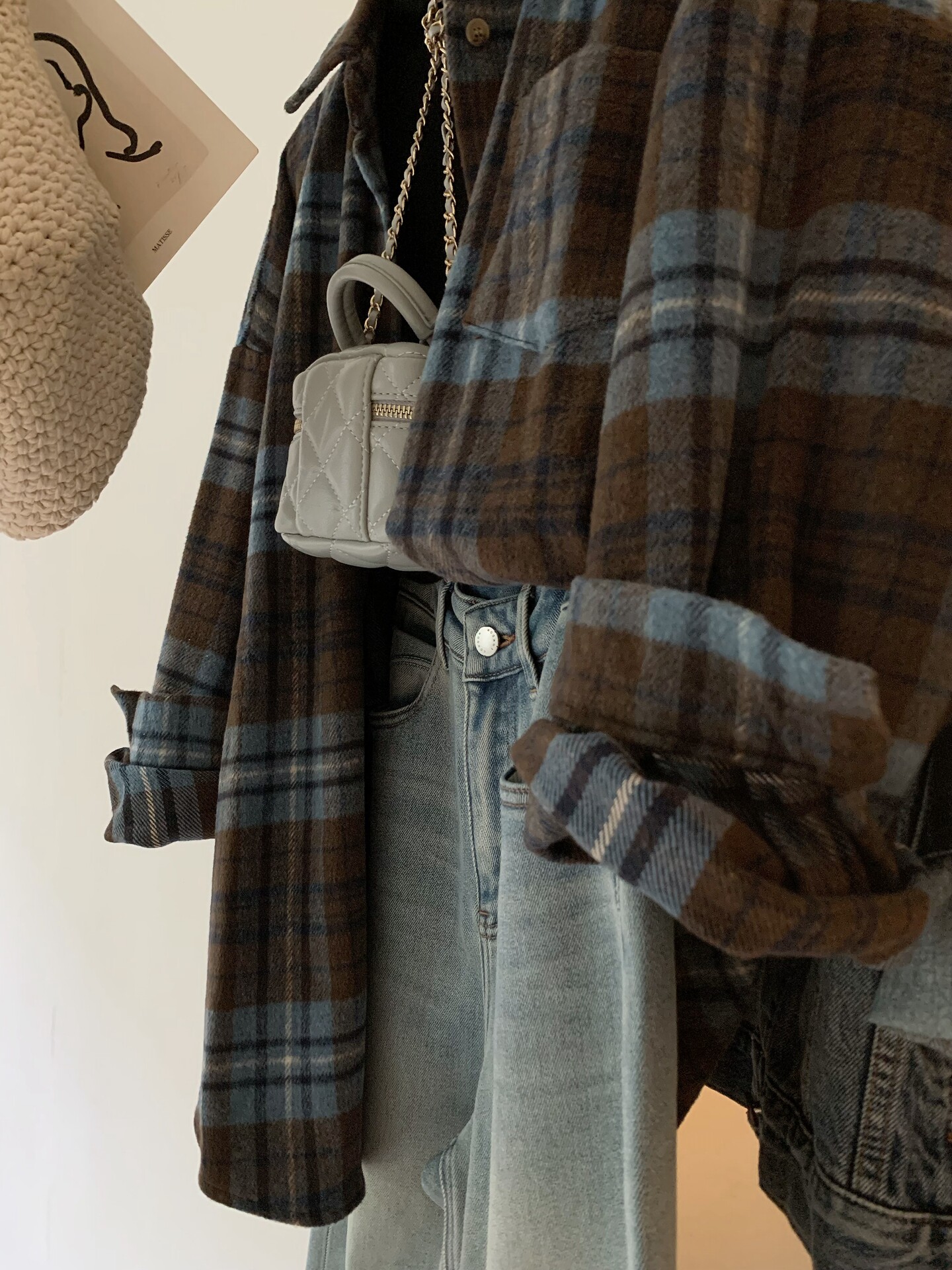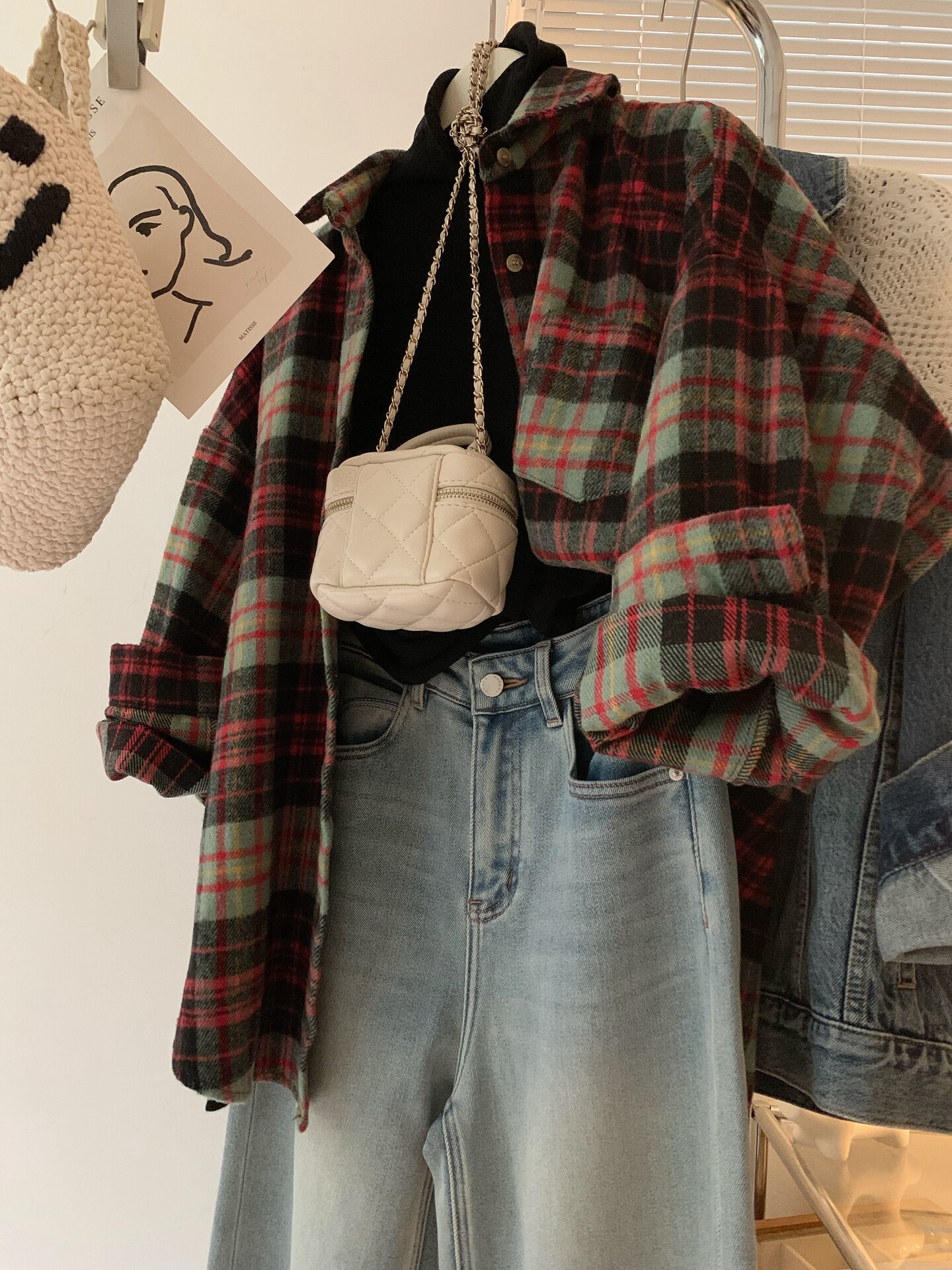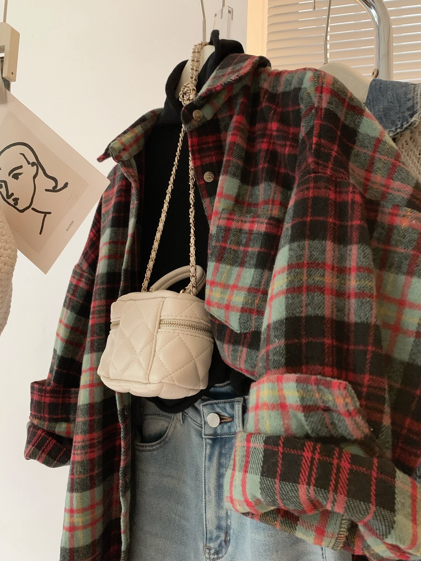 配色超美~復古毛呢撞色格子襯衫女時髦洋氣內搭曡穿繙領襯衣上衣