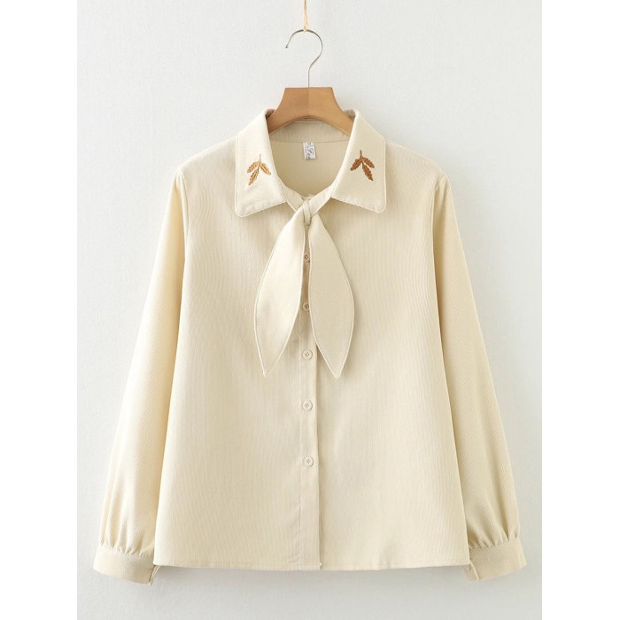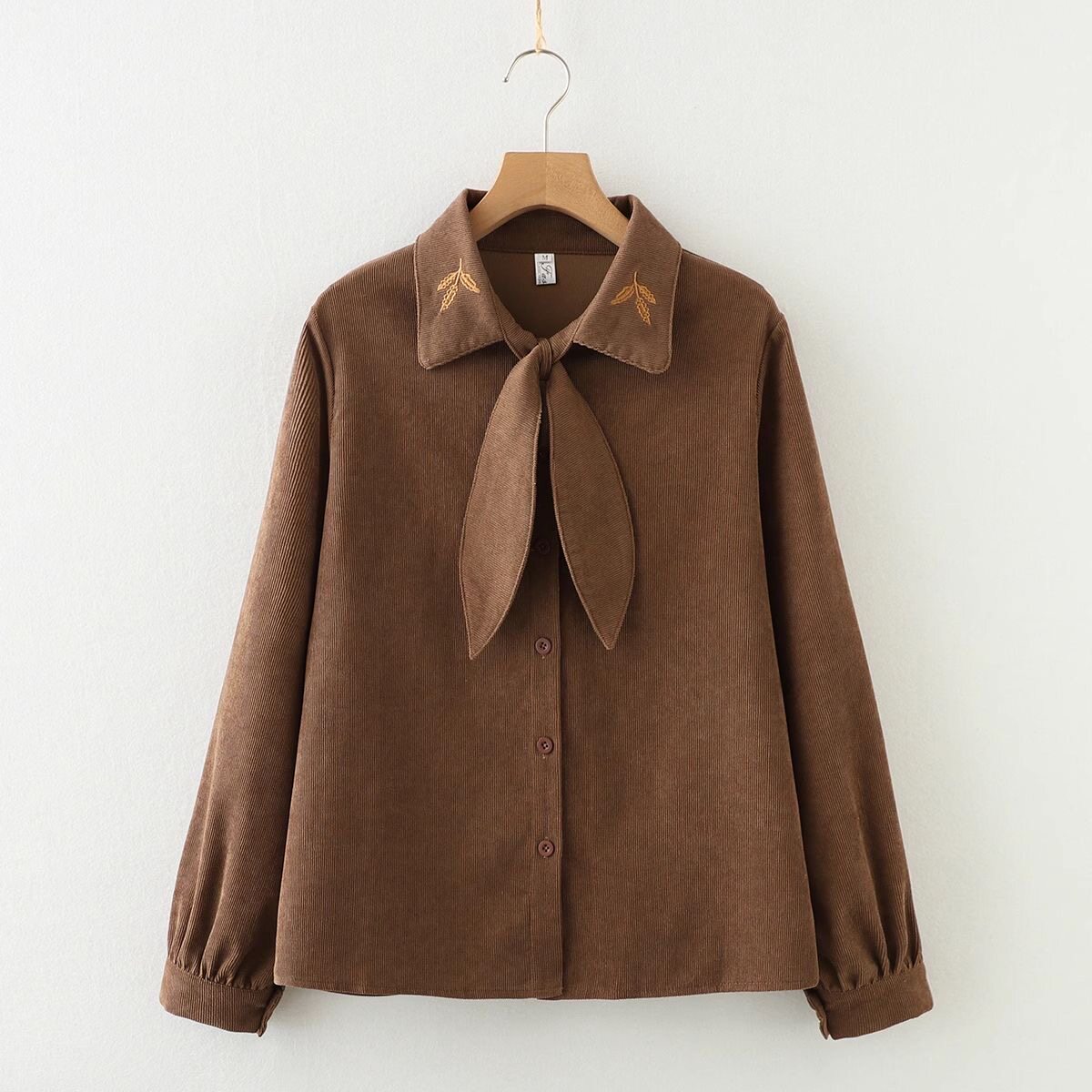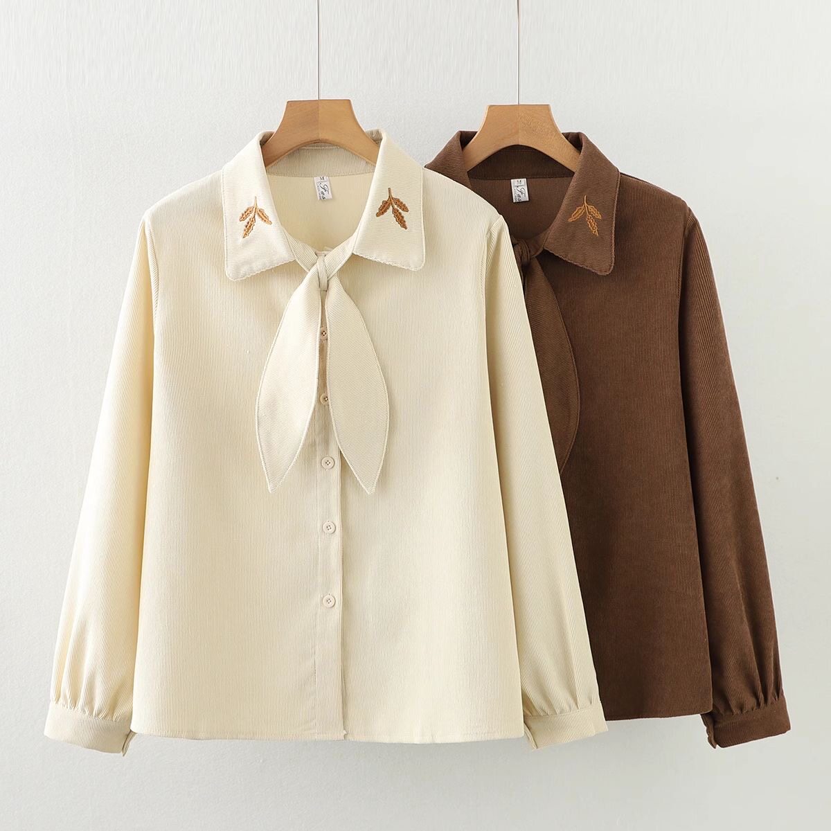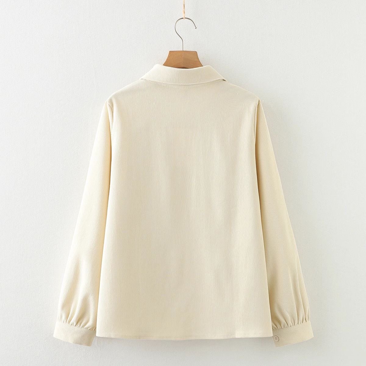 日系森女可愛兔耳朵刺綉領口單排釦泡泡袖磨毛加厚襯衫氣質襯衣秋