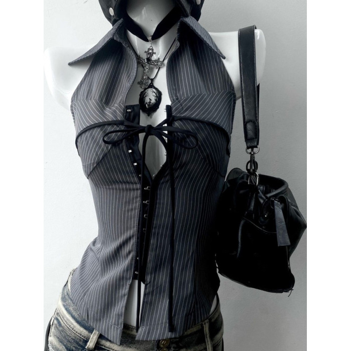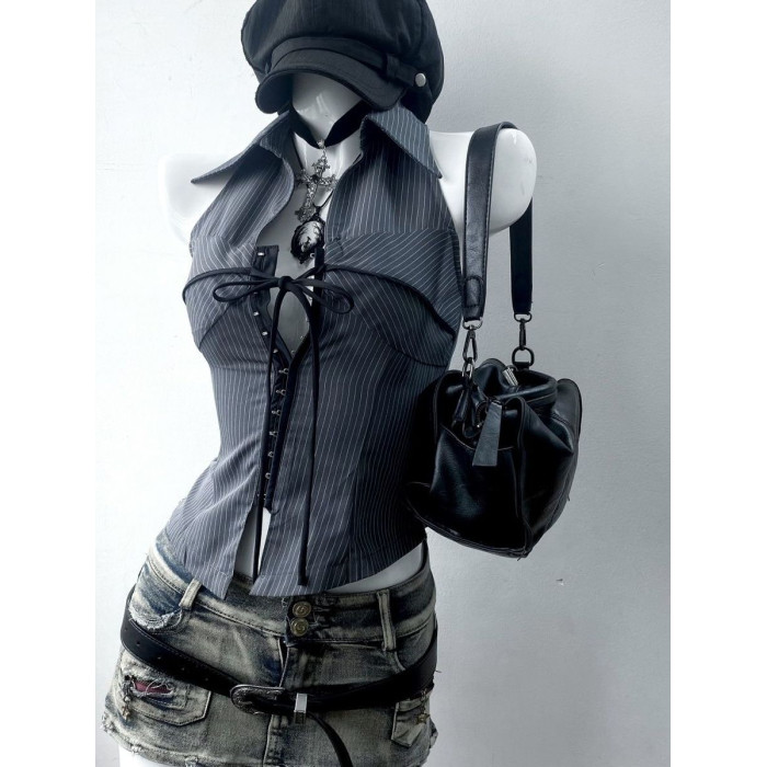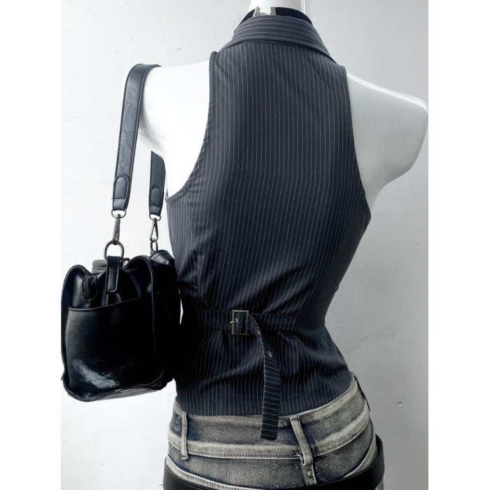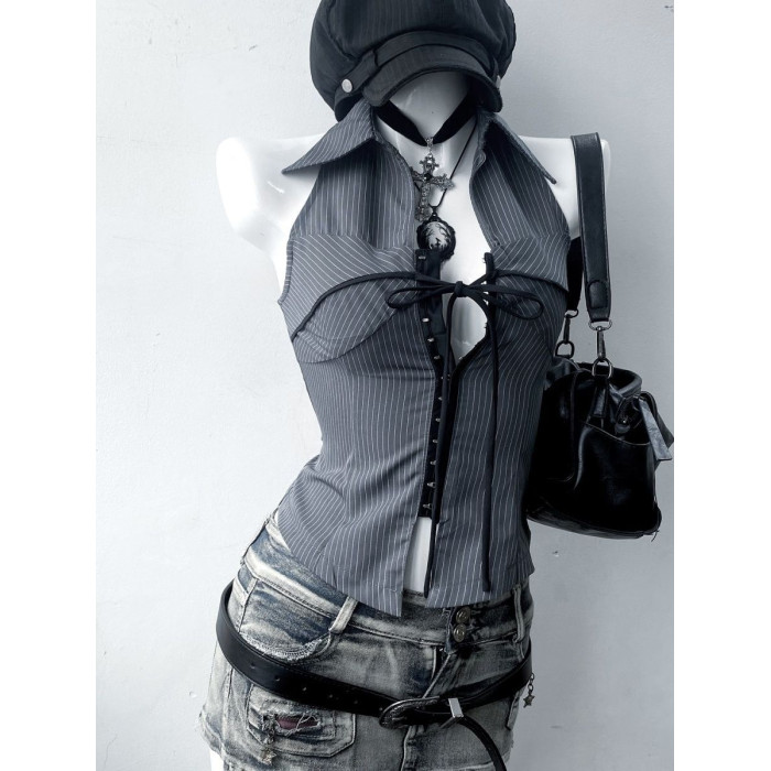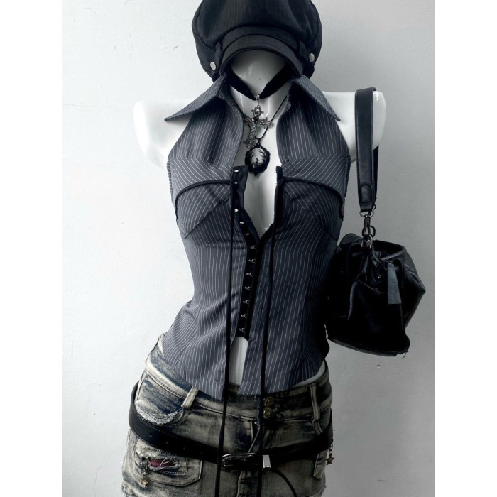 美式復古著vintage氣質條紋立領無袖襯衫上衣收腰古早千禧辣妹y2k