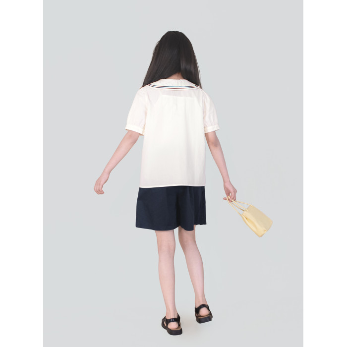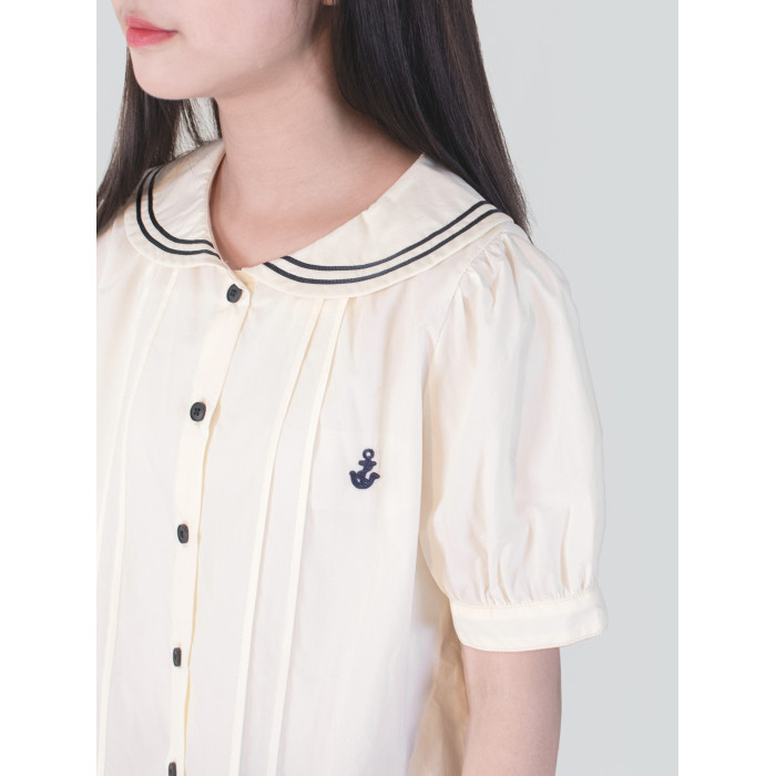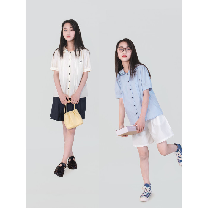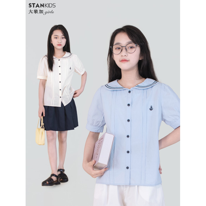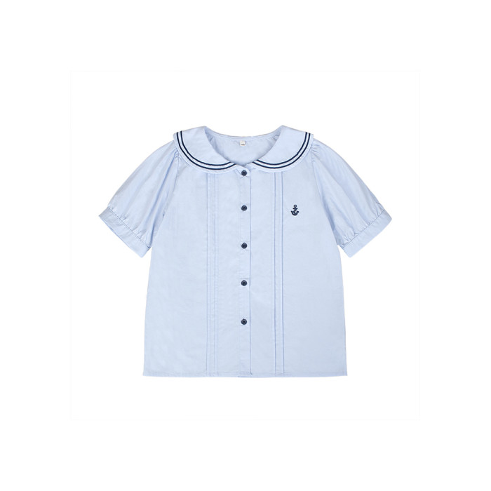 全棉女童海軍風翻領刺綉襯衫2025夏季新款中大童純棉圓領短袖襯衫