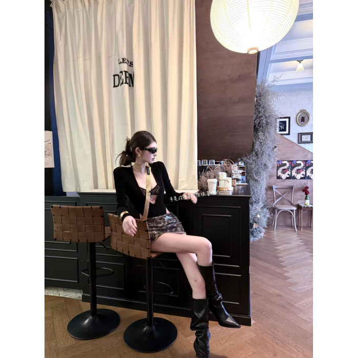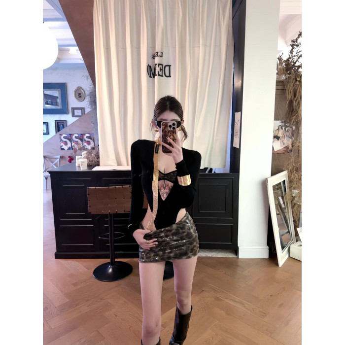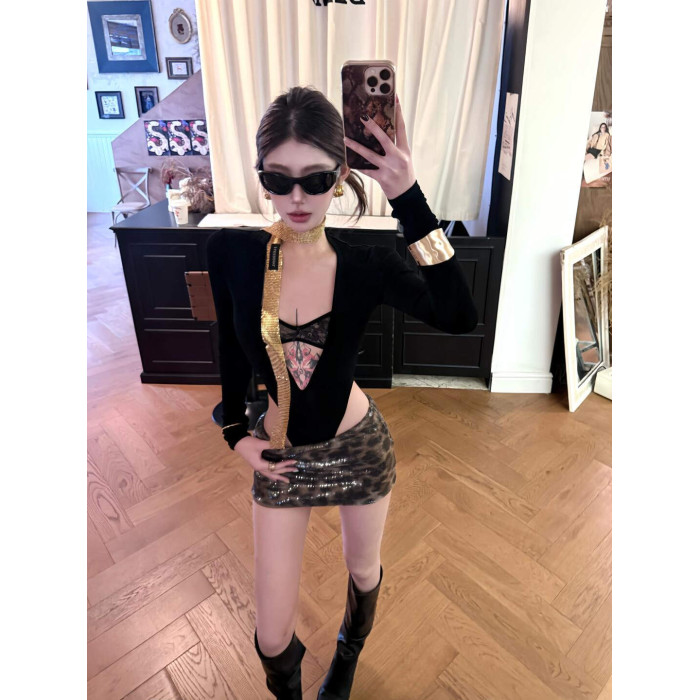 絳語‘歐美辣妹風v領長袖連體衣女性感修身緊身蕾絲T恤上衣