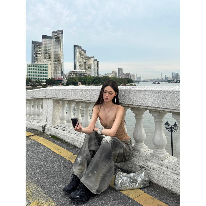 美式辣妹V領蕾絲拼接吊帶連體衣女夏季性感純欲修身外穿背心上衣