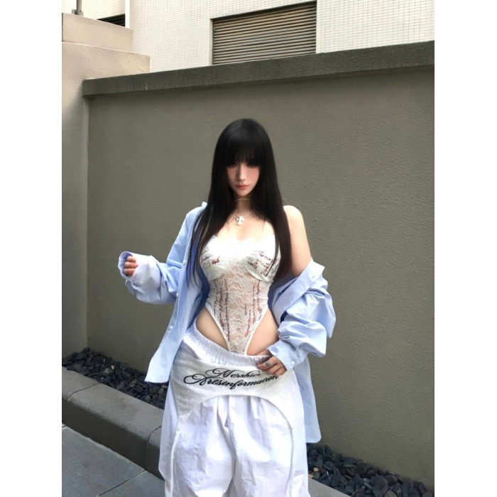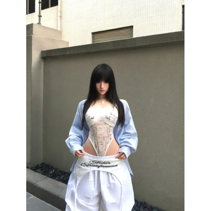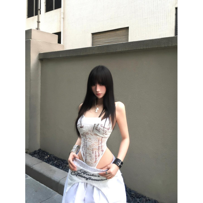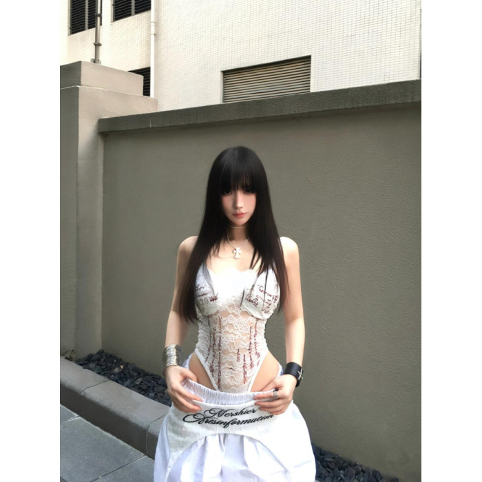 純欲性感字母鏤空蕾絲連體衣吊帶內搭辣妹印花顯瘦打底無袖上衣