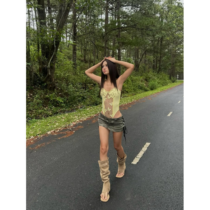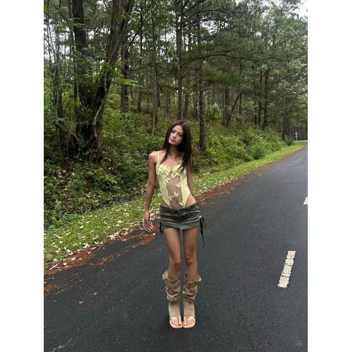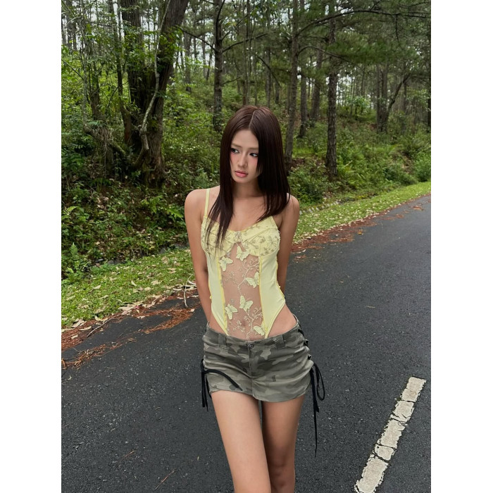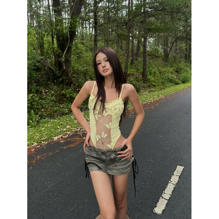歐美辣妹風蝴蝶印花蕾絲吊帶連體衣女夏性感純欲收腰透視無袖上衣